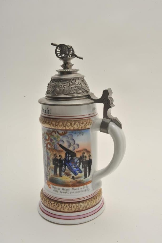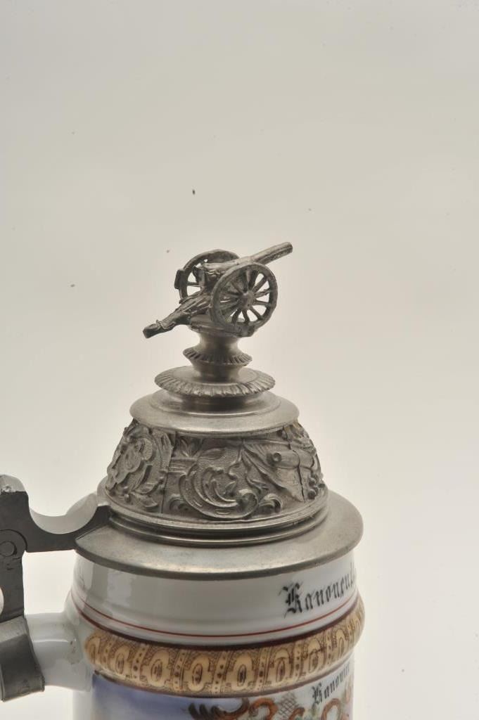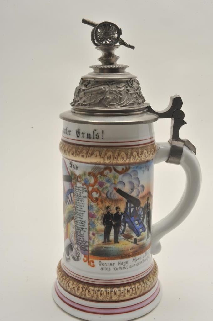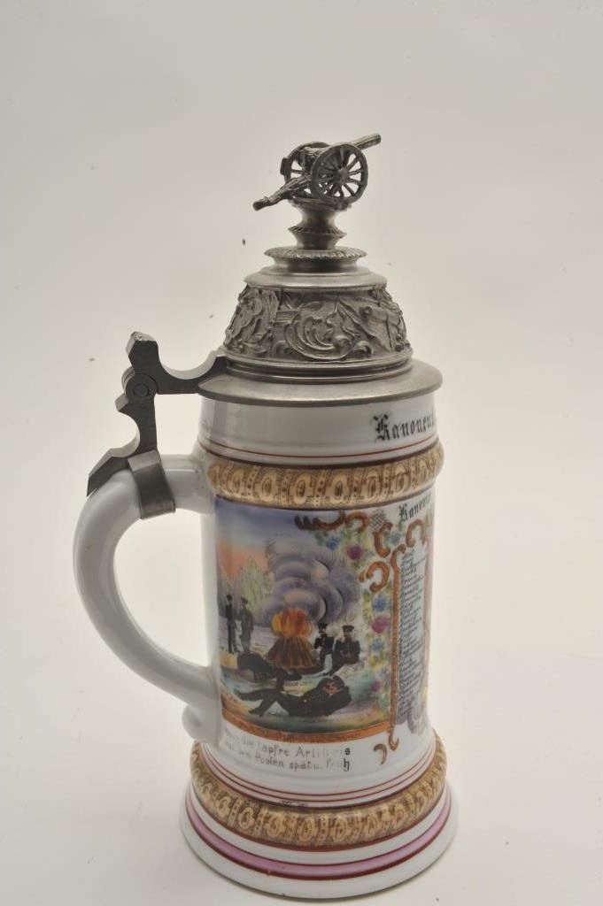 EVE-407 AUTHENTIC HAND PTD IMPERIAL ERA STEINAuthentic hand painted Imperial era German stein for “Kannoneer Kold, Art Reg No 14, Breisdch” and dated 1898. Great scene of cannons and relaxing by fire. Names of the regiment hand painted in 2 panels. Lots ofwriting in German and witty slogans. Pewter top with cannon and portrait. Lithophane of family on the bottom. Measures 10” in height. Blue maker’s mark on the bottom. The estate of Eric Vaule (He liked cannons). Est.:$200-$400Authentic hand painted Imperial era German stein for “Kannoneer Kold, Art Reg No 14, Breisdch” and dated 1898. Great scene of cannons and relaxing by fire. Names of the regiment hand painted in 2 panels. Lots ofwriting in German and witty slogans. Pewter top with cannon and portrait. Lithophane of family on the bottom. Measures 10” in height. Blue maker’s mark on the bottom. The estate of Eric Vaule (He liked cannons). Est.:$200-$400