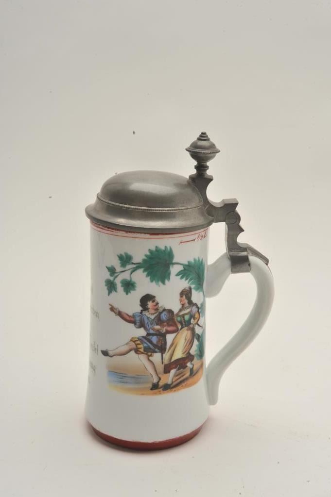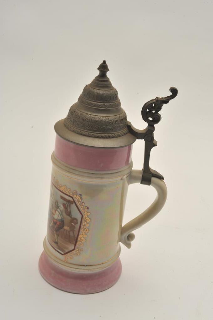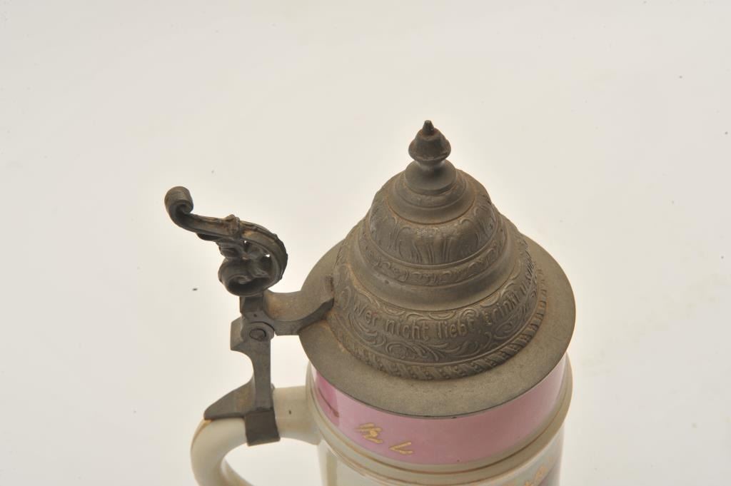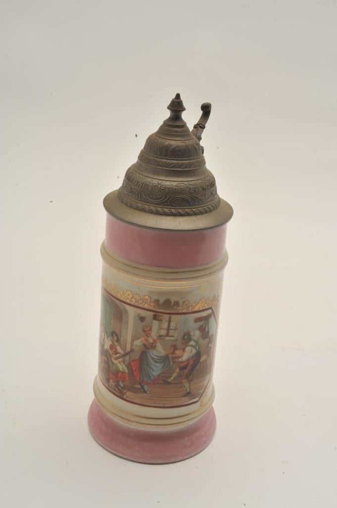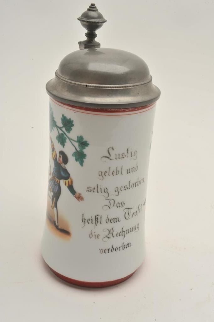 EVE-409 2 STEINSLot of 2 steins as described: #1 shows dancers with racy German slogan and measurs 7” in height. #2 shows hunter dancing in pub with fancy pewter lid and lithophane in bootom. Measures 10” tall. Bothe very goodcondition. Circa 1880-1915. The estate of Eric Vaule. Est.: $150-$300Lot of 2 steins as described: #1 shows dancers with racy German slogan and measurs 7” in height. #2 shows hunter dancing in pub with fancy pewter lid and lithophane in bootom. Measures 10” tall. Bothe very goodcondition. Circa 1880-1915. The estate of Eric Vaule. Est.: $150-$300