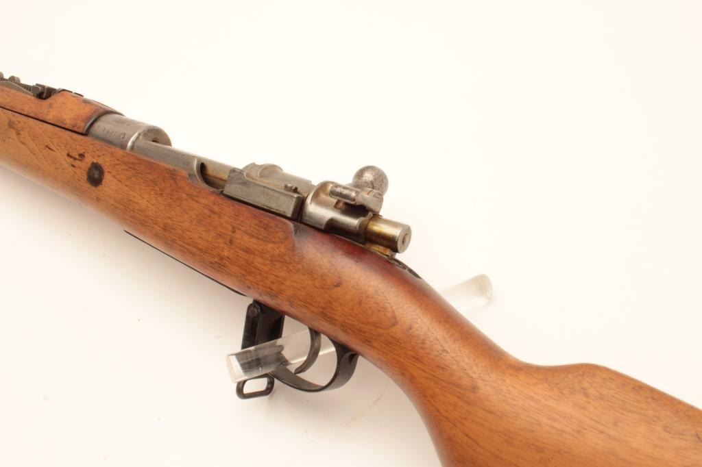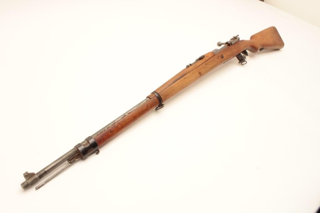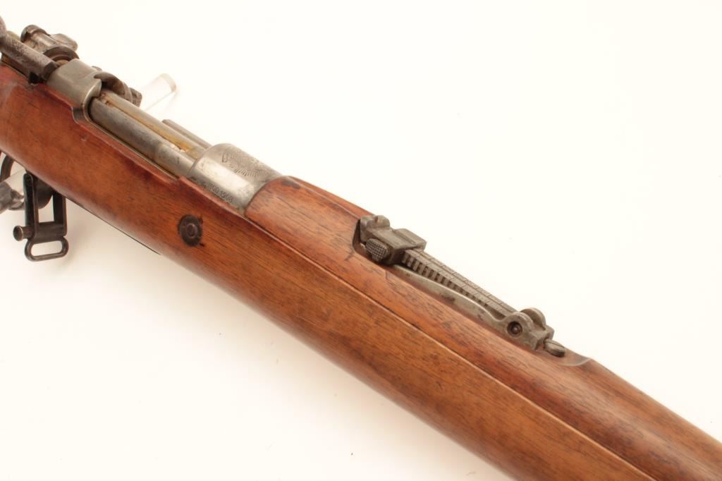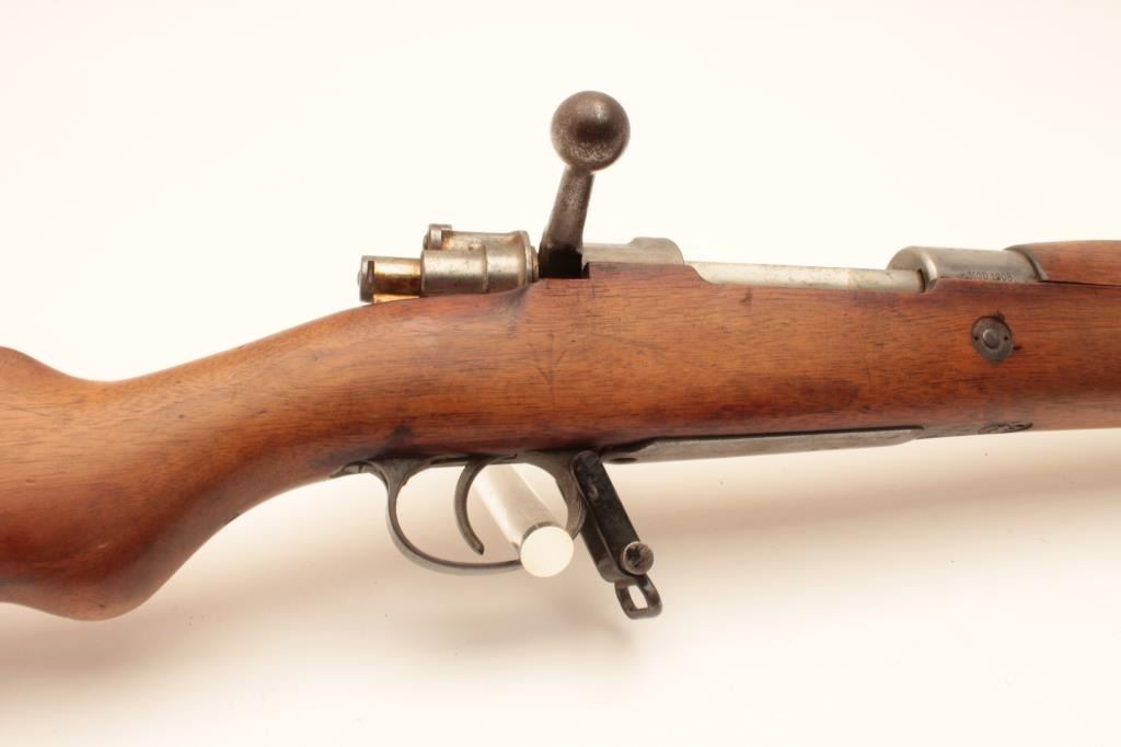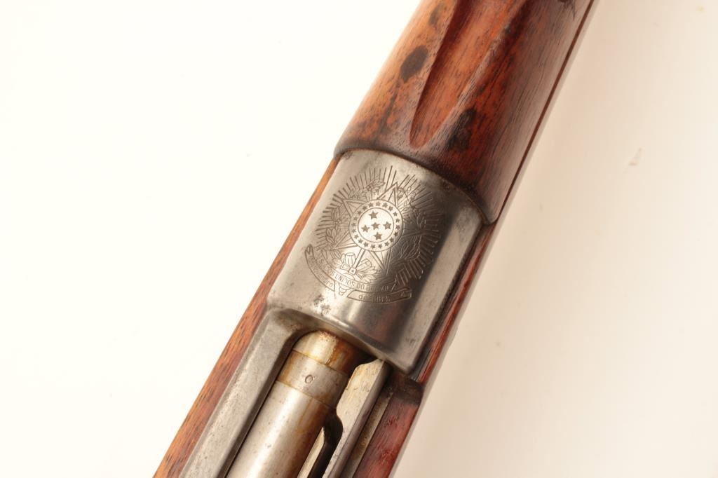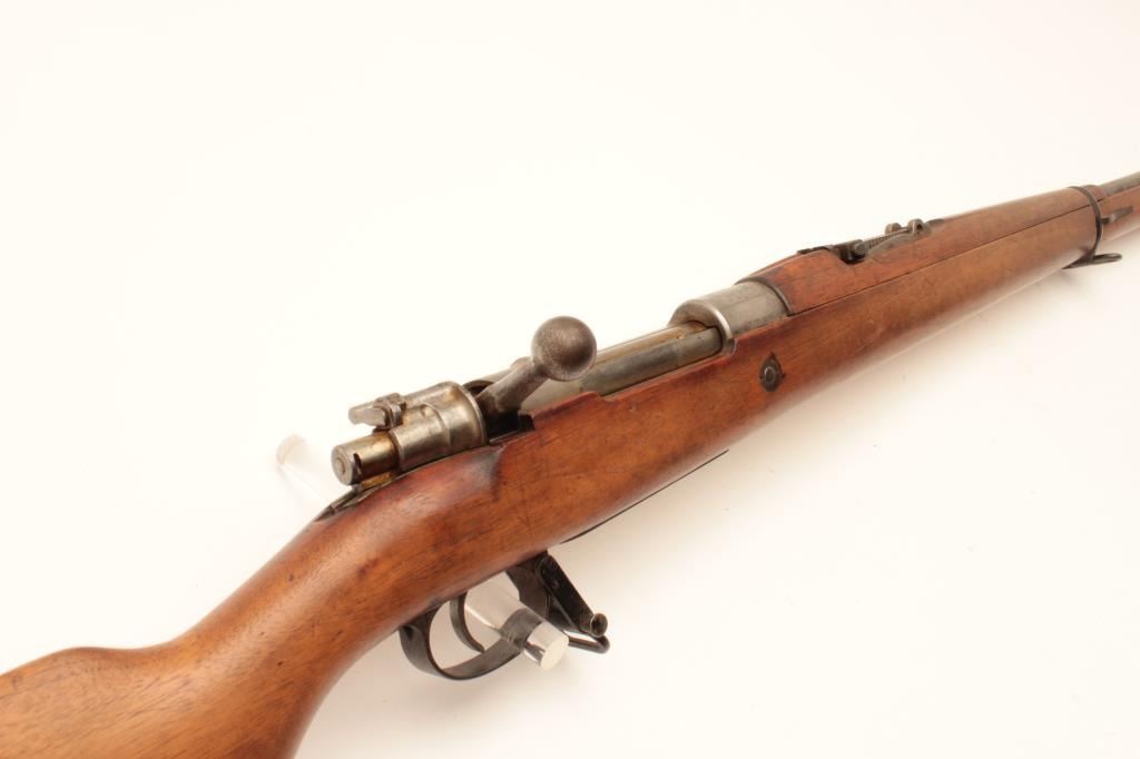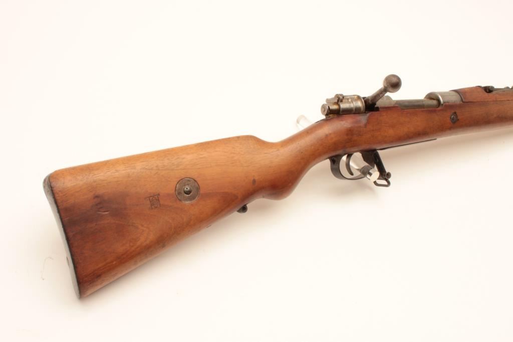 17LY-6 BOLIVIAN MAUSERBolivian Model 1908 Mauser Rifle built by D.W.M. in 7x57 caliber with a 29 ¼” barrel, tangent rear sight, Brazilian crest on receiver and sling swivels, S/N B3431. This rifle remains in good condition showing agray metal finish. The stock shows ding and scratches from storage and handling. There is a “B” within a diamond on a flag stamped on the right side of the buttstock. All matching visible serial numbers. The bore is dirtyand the action is good. (C&R) Est.: $200-$400Bolivian Model 1908 Mauser Rifle built by D.W.M. in 7x57 caliber with a 29 ¼” barrel, tangent rear sight, Brazilian crest on receiver and sling swivels, S/N B3431. This rifle remains in good condition showing agray metal finish. The stock shows ding and scratches from storage and handling. There is a “B” within a diamond on a flag stamped on the right side of the buttstock. All matching visible serial numbers. The bore is dirtyand the action is good. (C&R) Est.: $200-$400