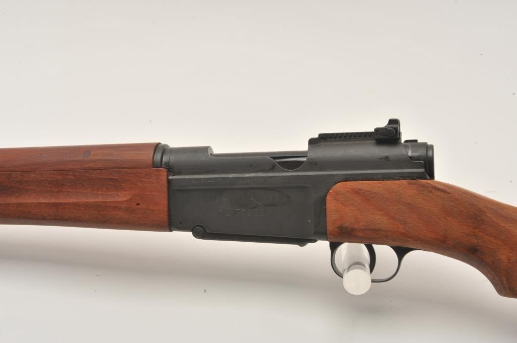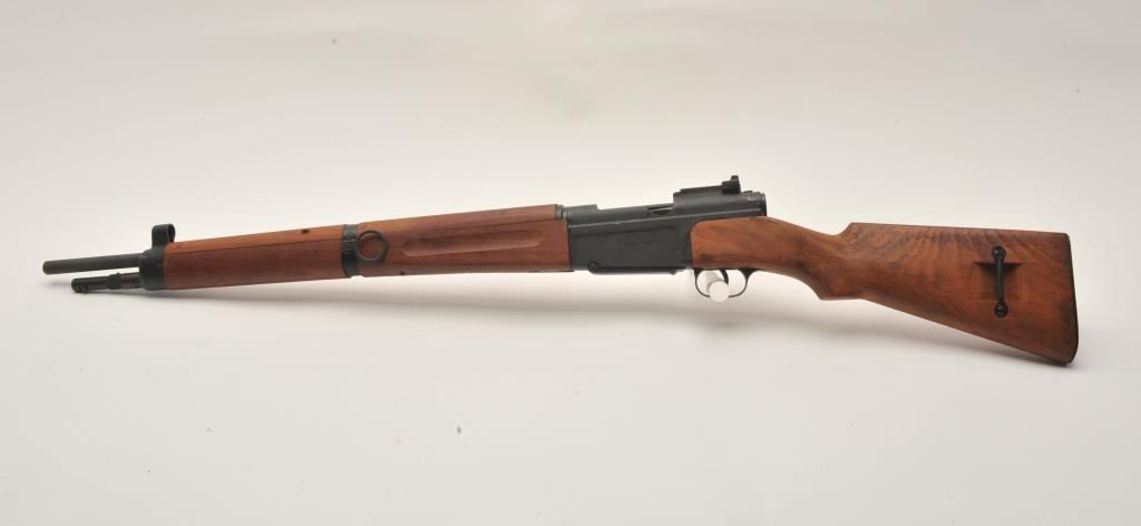18LY-8 MAS BOLT 1936French MAS Model 1936 bolt action rifle, 7.5 French caliber, Serial #FG71922. The rifle is in nearly fine overall condition with a 23” barrel with a hooded blade front and military tangent style rear sights. Therifle retains nearly all of its military finish, with all matching visible serial numbers. The left side of the action is import marked. The rifle retains the bayonet lug and sling swivels. The smooth wood stock is in very good condition showing only light handling marks. The butt ends with a smooth steel butt plate. The bore is good, the action is crisp and markings are sharp. Est.: $150-$300. (C+R).French MAS Model 1936 bolt action rifle, 7.5 French caliber, Serial #FG71922. The rifle is in nearly fine overall condition with a 23” barrel with a hooded blade front and military tangent style rear sights. Therifle retains nearly all of its military finish, with all matching visible serial numbers. The left side of the action is import marked. The rifle retains the bayonet lug and sling swivels. The smooth wood stock is in very good condition showing only light handling marks. The butt ends with a smooth steel butt plate. The bore is good, the action is crisp and markings are sharp. Est.: $150-$300. (C+R).