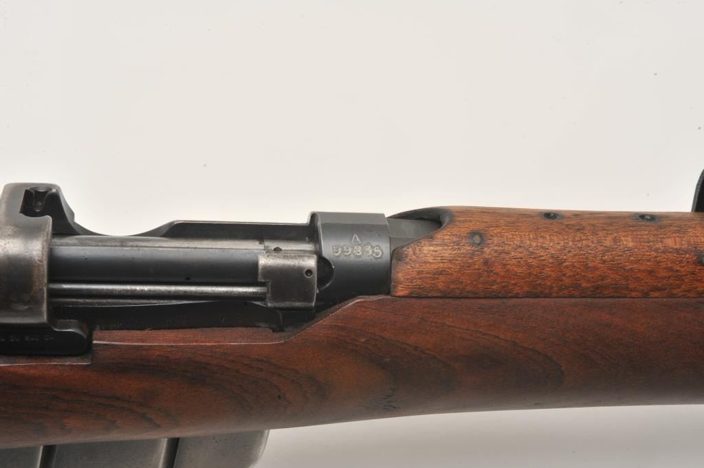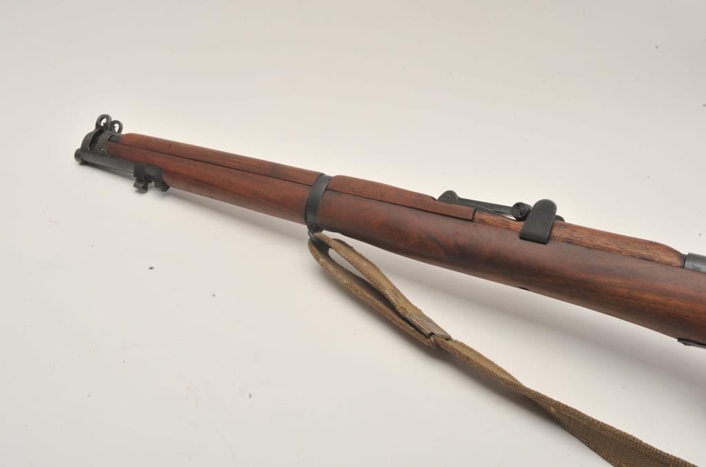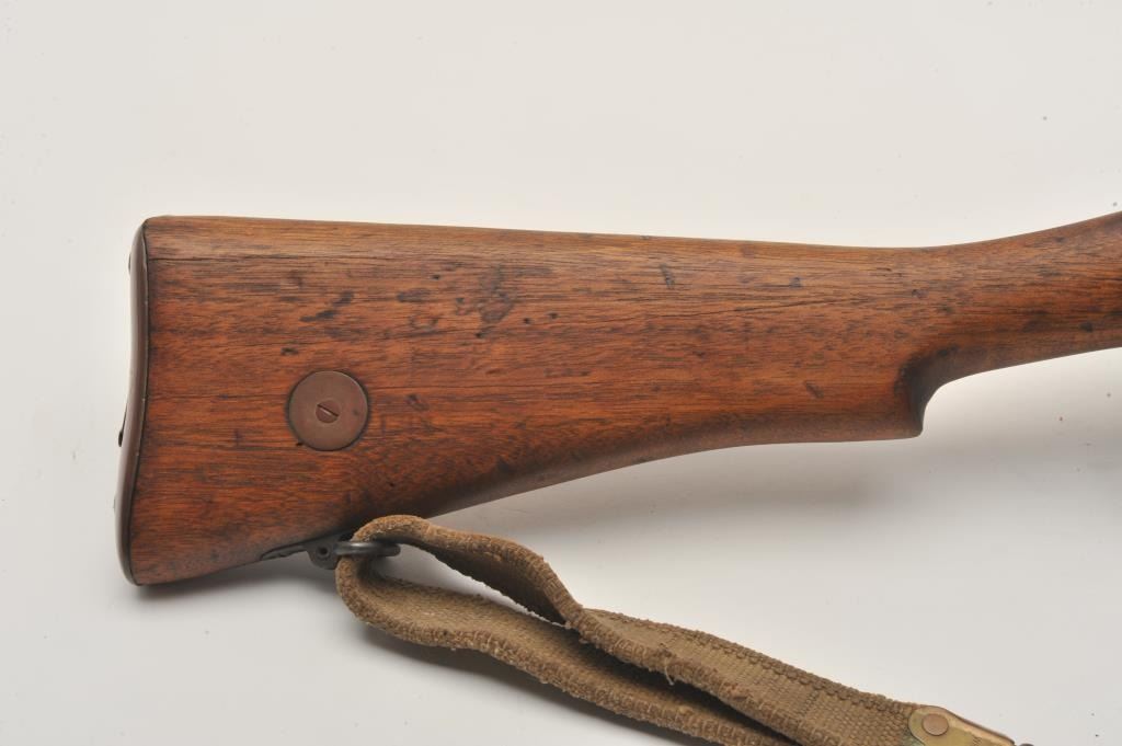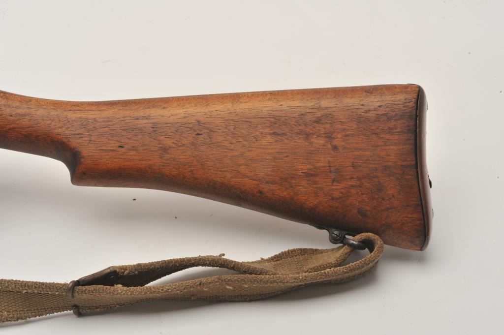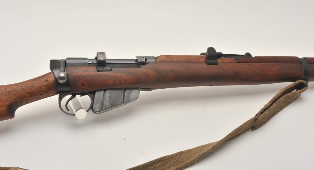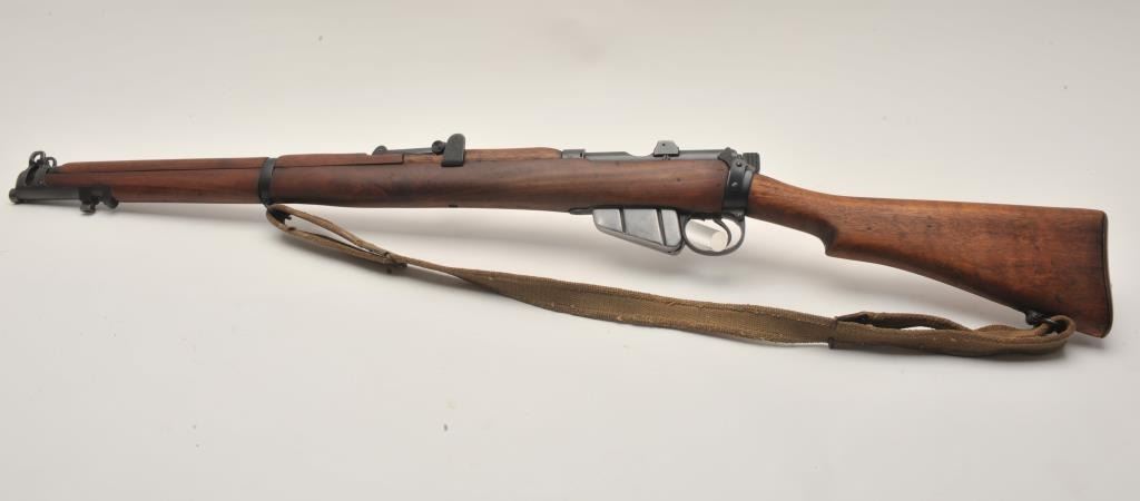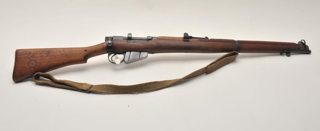 17LY-11 LITHGONE ENFIELDAustralian Lithgow Lee-Enfield No.5 Mk. I bolt action rifle, .303 British caliber, Serial #99235. The rifle is in good overall condition with a 25” barrel with a protected blade front and military tangent style rearsights. The rifle retains the majority of its military finish, with the right rear of the action marked, “AUSTRALIA”. The wrist strap is marked, “LITHGOW SHTLE III” in a shield proof and dated 1922. The rifleretains the bayonet lug, sling swivels and an OD green canvas sling. The smooth wood stock is in very good condition showing only light handling marks. The butt ends with a smooth brass butt plate. The bore is good, theaction is crisp and markings are sharp. A nice example of an Australian “Short Magazine Lee Enfield (SMLE) circa 1922. Est.: $175-$350. (C+R).Australian Lithgow Lee-Enfield No.5 Mk. I bolt action rifle, .303 British caliber, Serial #99235. The rifle is in good overall condition with a 25” barrel with a protected blade front and military tangent style rearsights. The rifle retains the majority of its military finish, with the right rear of the action marked, “AUSTRALIA”. The wrist strap is marked, “LITHGOW SHTLE III” in a shield proof and dated 1922. The rifleretains the bayonet lug, sling swivels and an OD green canvas sling. The smooth wood stock is in very good condition showing only light handling marks. The butt ends with a smooth brass butt plate. The bore is good, theaction is crisp and markings are sharp. A nice example of an Australian “Short Magazine Lee Enfield (SMLE) circa 1922. Est.: $175-$350. (C+R).