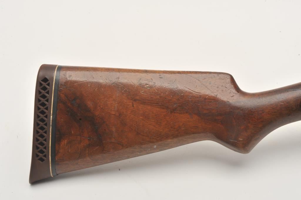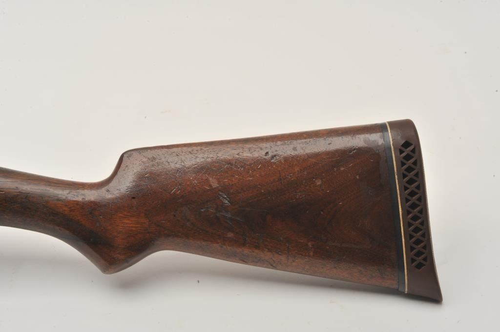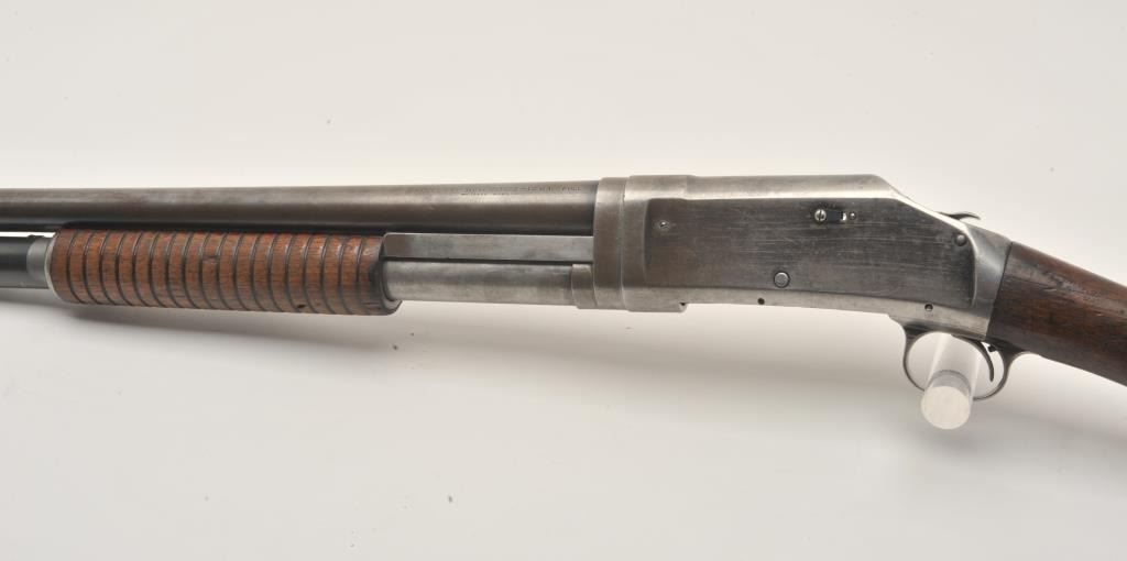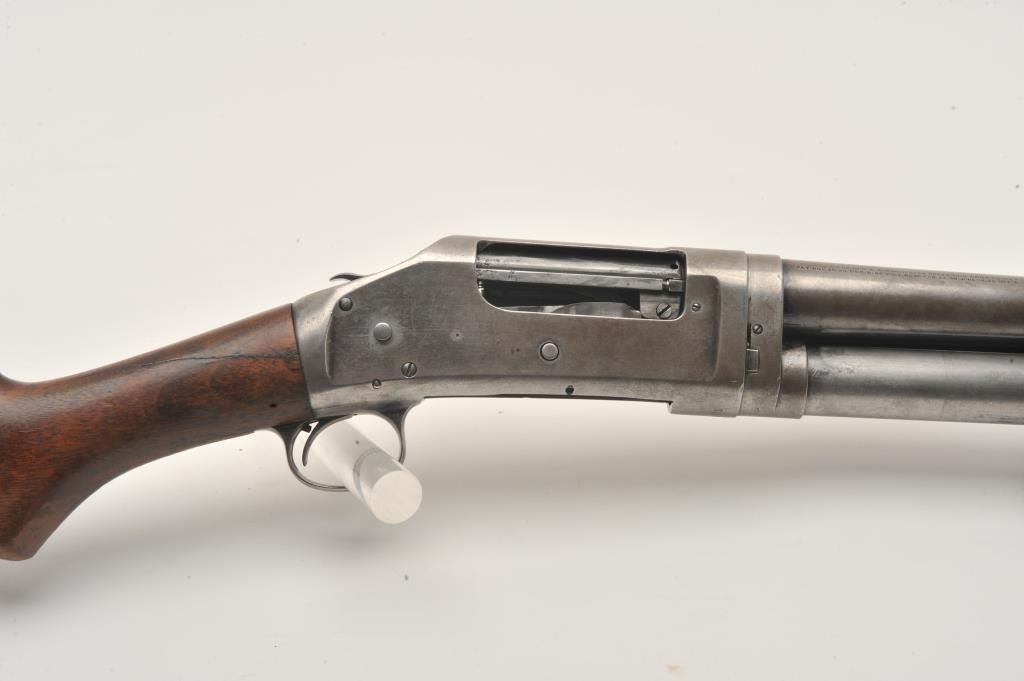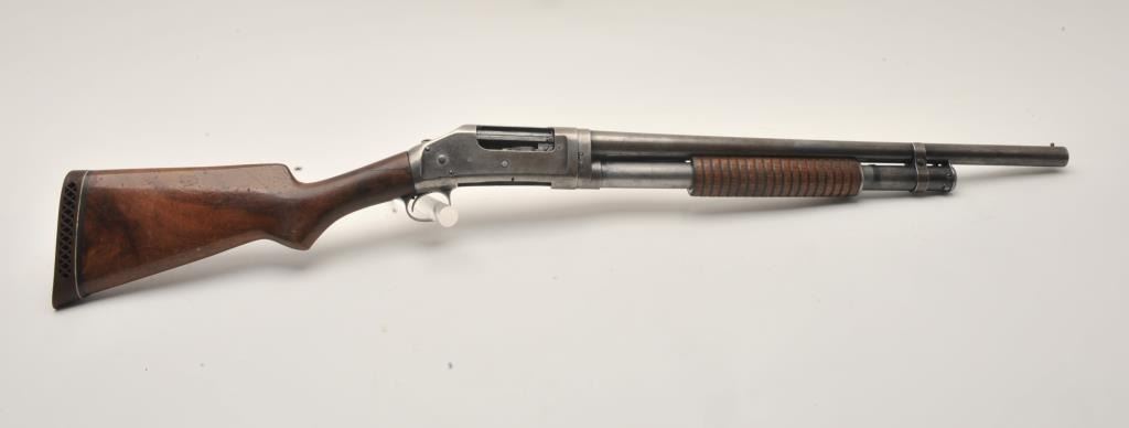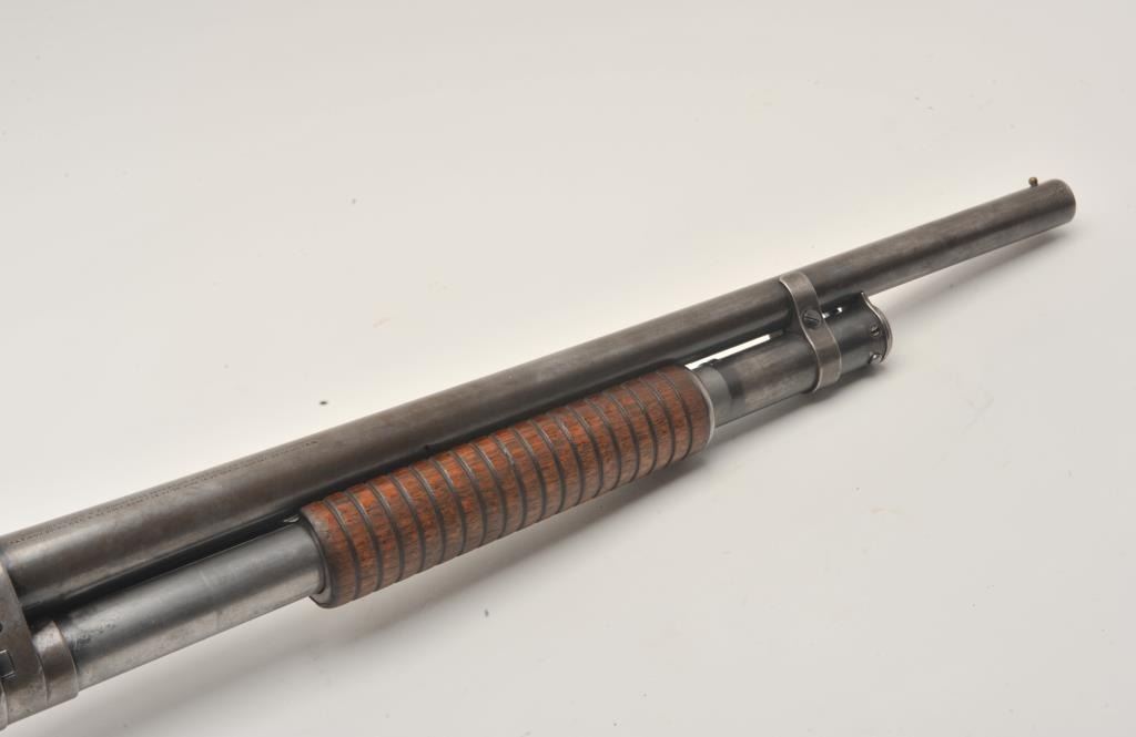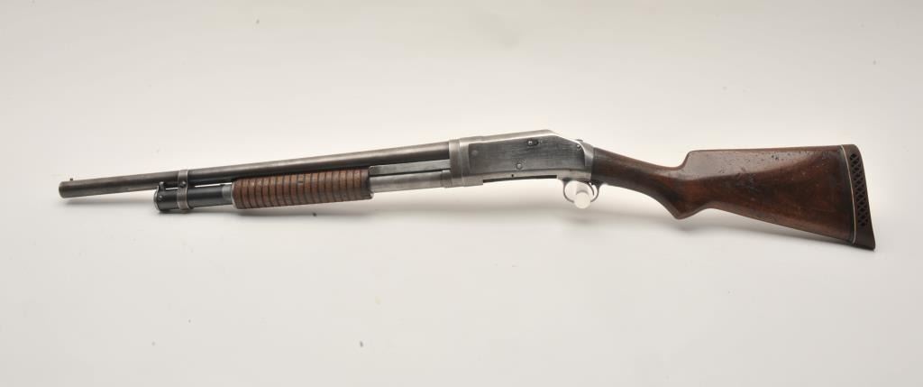 17LY-12 1897 WINCHESTERWinchester Model 1897 pump shotgun, 12 gauge, Serial #768128. The shotgun is in good overall condition with a 21” barrel with a brass bead front sight. The barrel, magazine tube and receiver retain a significantamount of their flaking blued finish with the remainder becoming a grey patina. The smooth wood stocks are in good condition showing heavy use with a 2” crack along the right side of the neck. The butt ends with a White Line ventilated pad providing a 13” LOP. The bore is good, the action crisp and markings are legible. Est.: $175-$350. (C+R).Winchester Model 1897 pump shotgun, 12 gauge, Serial #768128. The shotgun is in good overall condition with a 21” barrel with a brass bead front sight. The barrel, magazine tube and receiver retain a significantamount of their flaking blued finish with the remainder becoming a grey patina. The smooth wood stocks are in good condition showing heavy use with a 2” crack along the right side of the neck. The butt ends with a White Line ventilated pad providing a 13” LOP. The bore is good, the action crisp and markings are legible. Est.: $175-$350. (C+R).