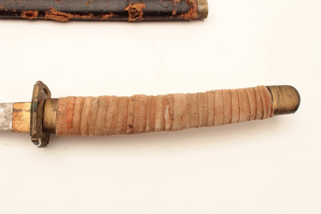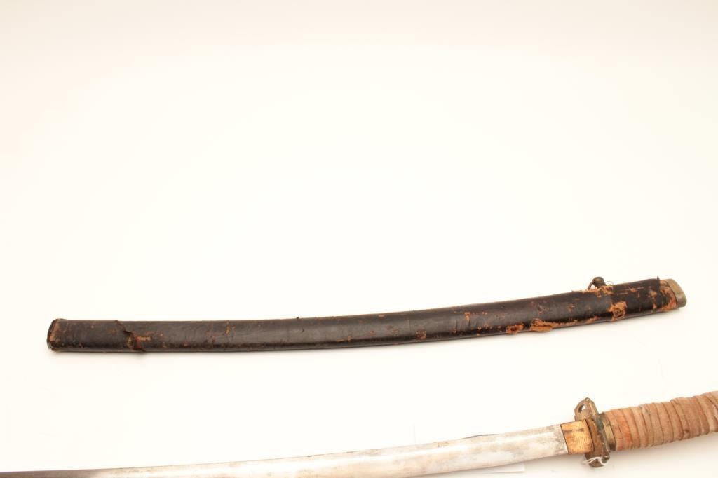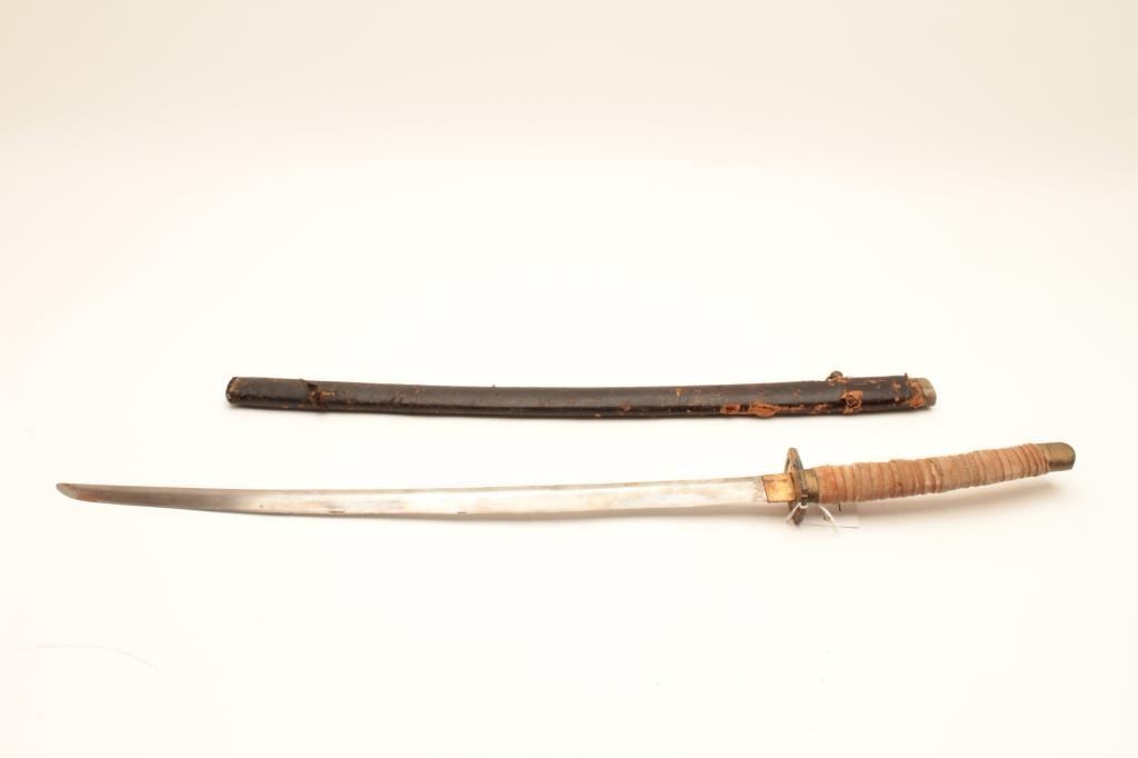 18CA-332 WWII JAPANESE STYLE SWORDWWII Japanese style officer’s sword made in China or Korea for forces allied with Japan. Fair to good with scabbard. Est.: $125-$250WWII Japanese style officer’s sword made in China or Korea for forces allied with Japan. Fair to good with scabbard. Est.: $125-$250