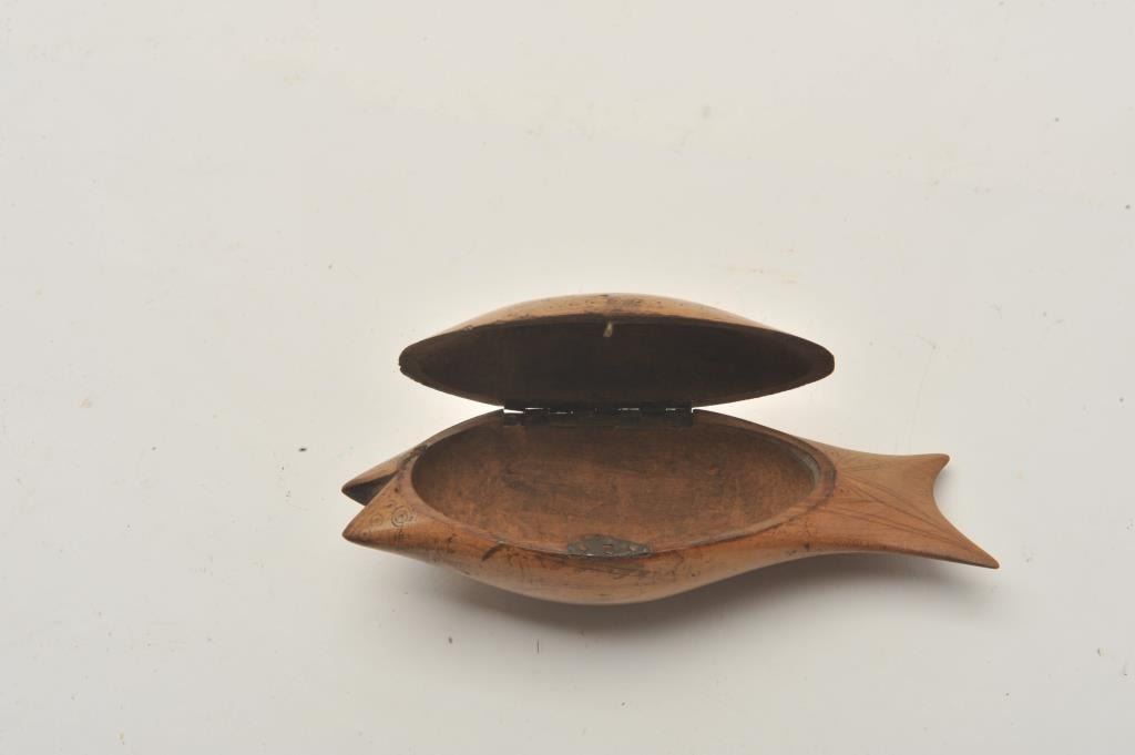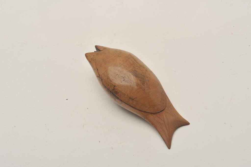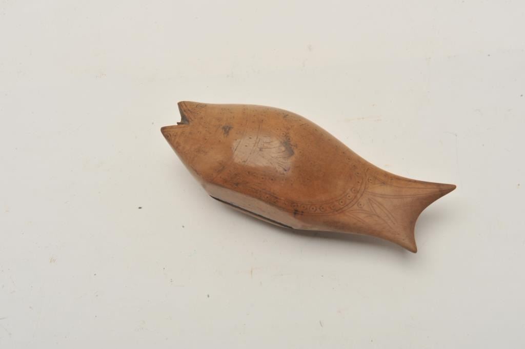 EVE-416 INCISE CARVED SNUFF BOX17th century to 18th century incised carved snuff box in form of fish. Measures 6” tip to end. Possibly American colonial. The estate of Eric Vaule. Est.: $100-$20017th century to 18th century incised carved snuff box in form of fish. Measures 6” tip to end. Possibly American colonial. The estate of Eric Vaule. Est.: $100-$200
