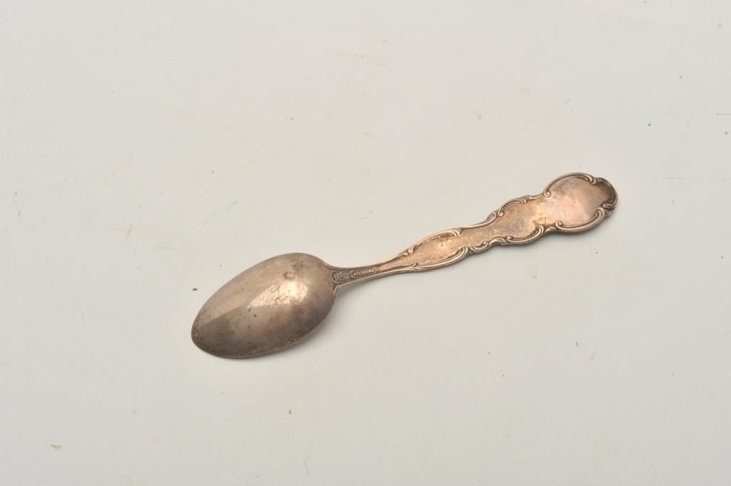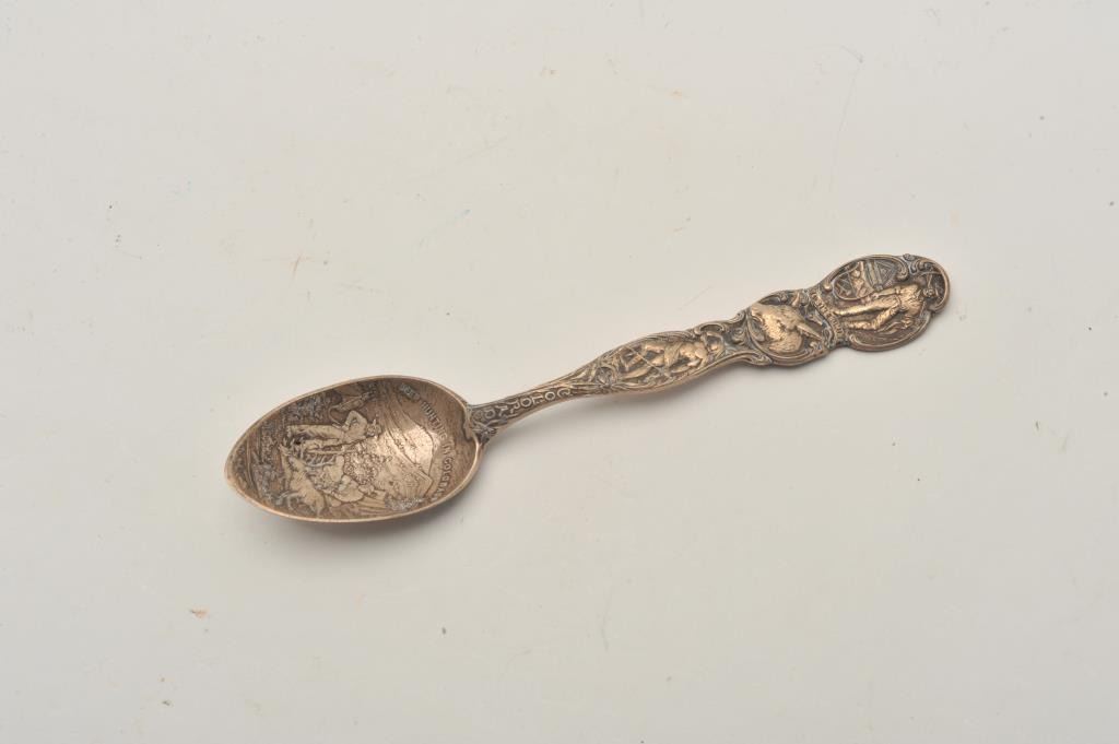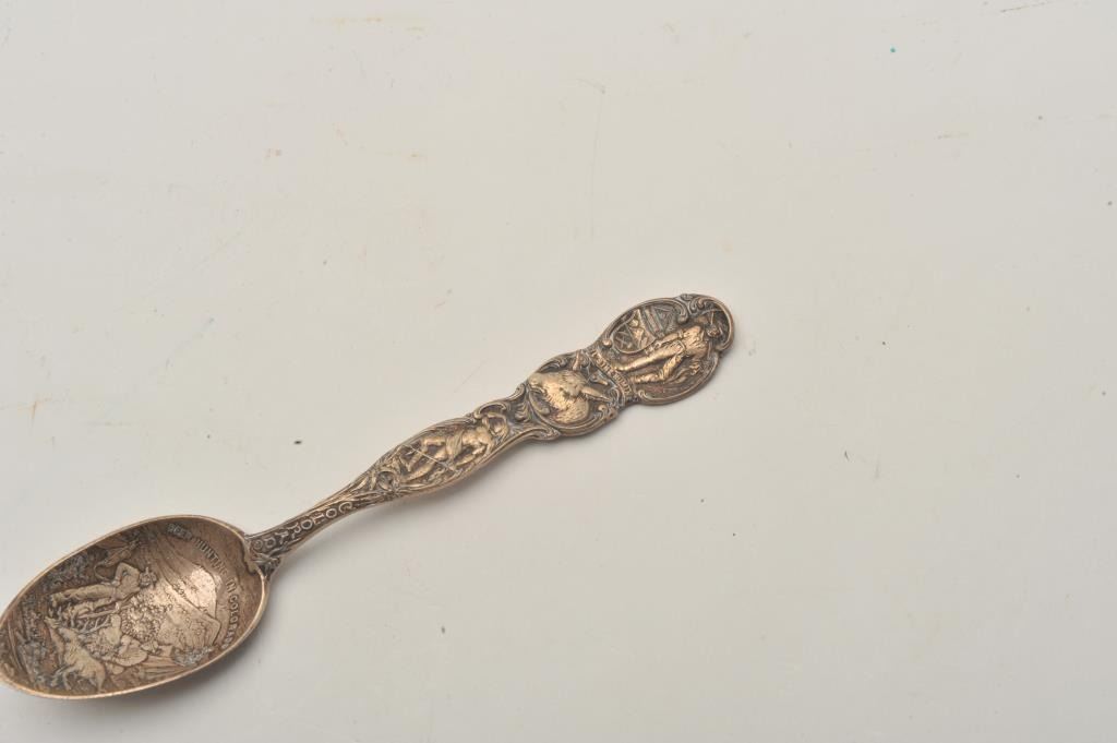 EVE-417 STERLING SOUVENIR SPOONSterling souvenir spoon “Deer Hunting in Colorado”. 19th century scenes of Indian, miners, and hunters. Excellent condition. The estate of Eric Vaule. Est.: $100-$200Sterling souvenir spoon “Deer Hunting in Colorado”. 19th century scenes of Indian, miners, and hunters. Excellent condition. The estate of Eric Vaule. Est.: $100-$200