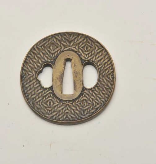 EVE-420 BASKET WEAVE DESIGN TSUBABasket weave design cast brass tsuba for wakasashi (Japan). Hand chasing. 19th century or earlier. The estate of Eric Vaule. Est.: $100-$200Basket weave design cast brass tsuba for wakasashi (Japan). Hand chasing. 19th century or earlier. The estate of Eric Vaule. Est.: $100-$200