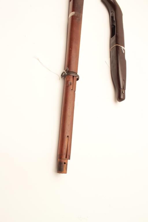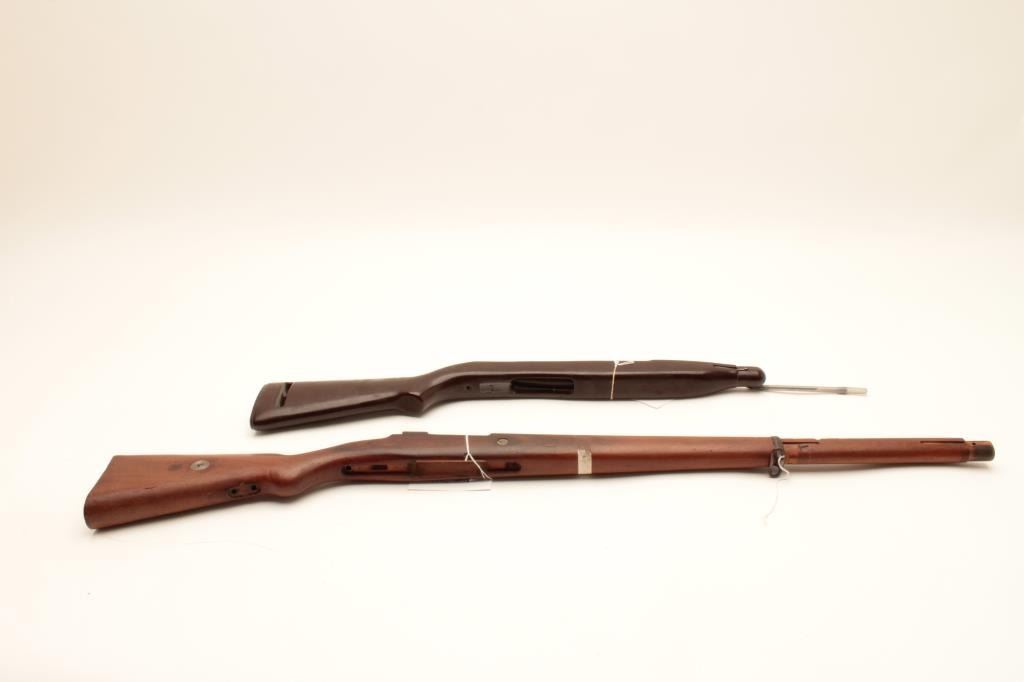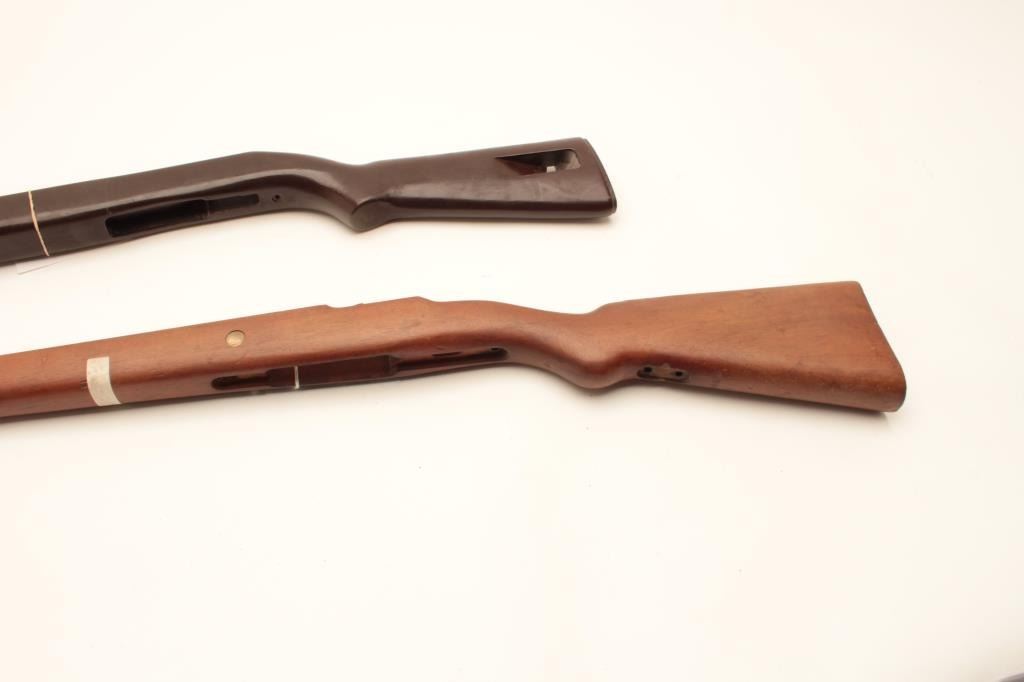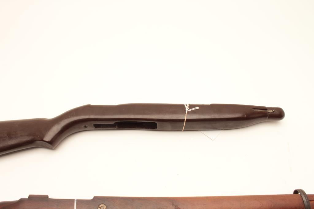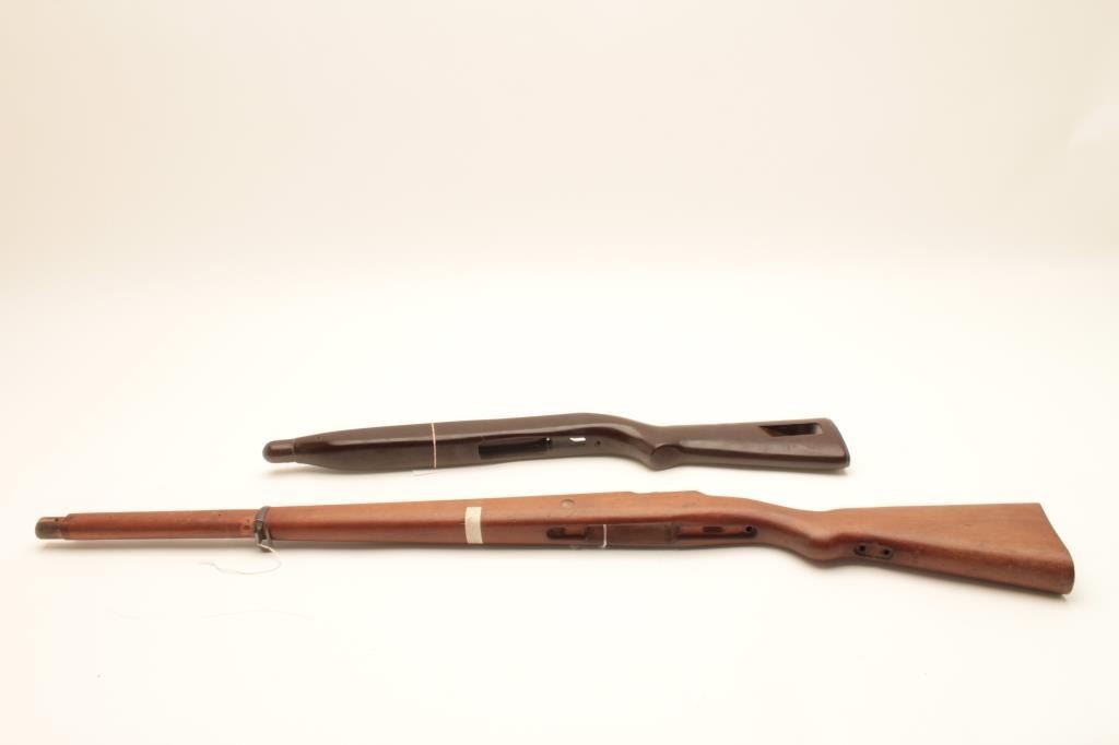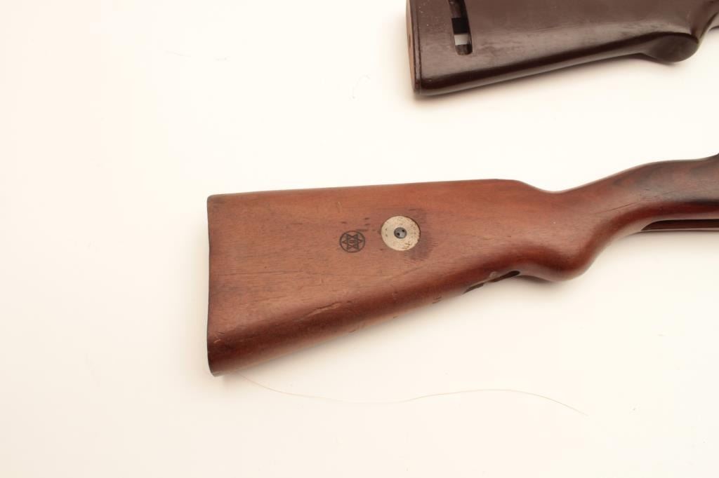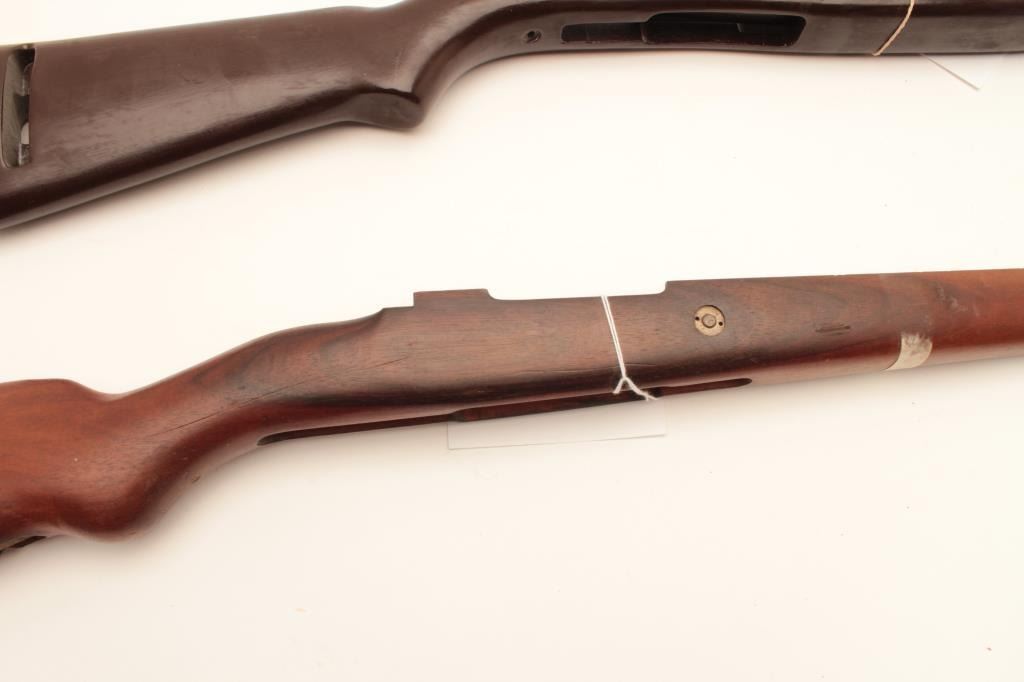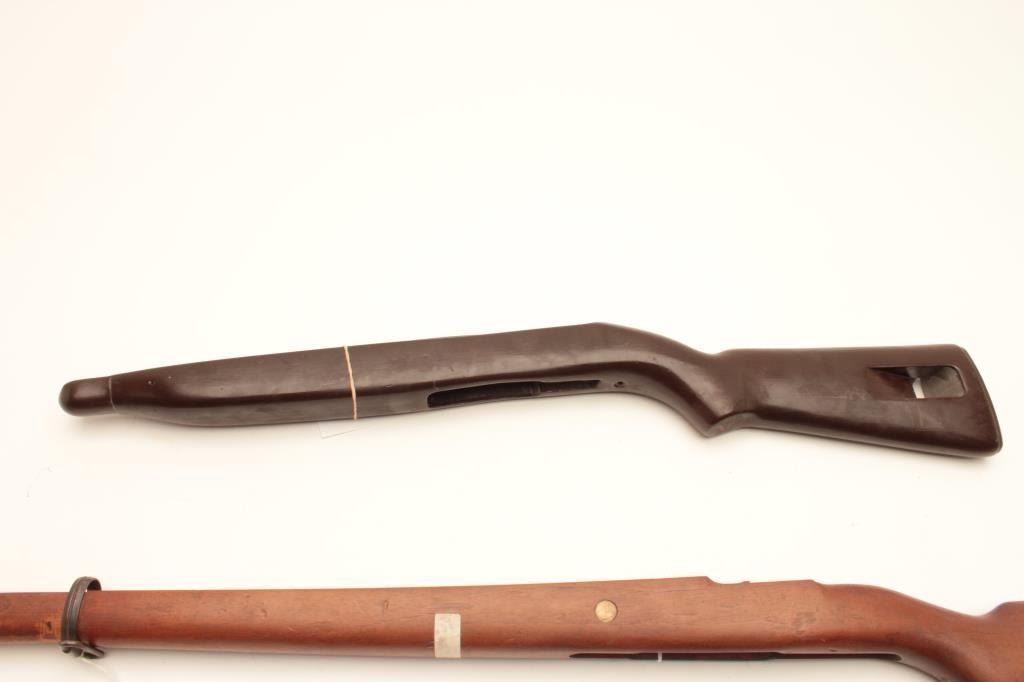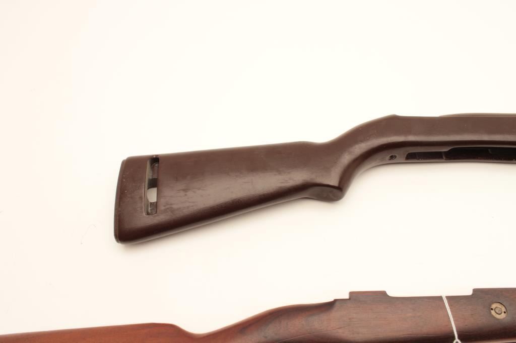18CA-341 CONTRACT MAUSER STOCKContract Mauser stock marked “B” in star possibly (1909 Brazillian?). In very good condition with rear band and disk in the buttstock, S/N 9008 along with a M1 carbine stock and fore end badly refinished. Est.:$100-$200Contract Mauser stock marked “B” in star possibly (1909 Brazillian?). In very good condition with rear band and disk in the buttstock, S/N 9008 along with a M1 carbine stock and fore end badly refinished. Est.:$100-$200