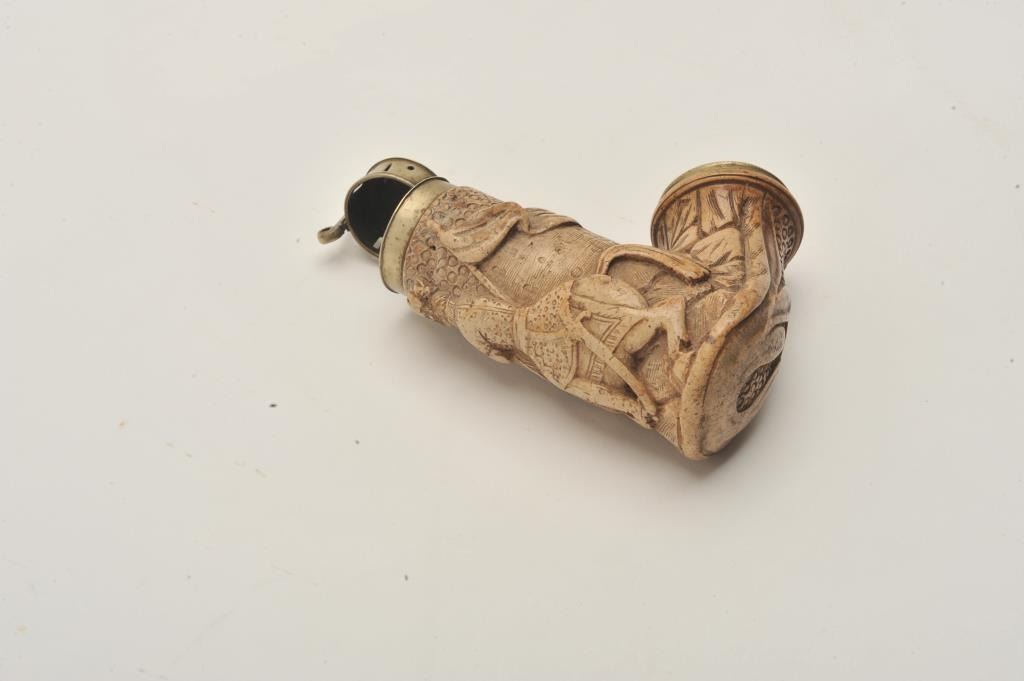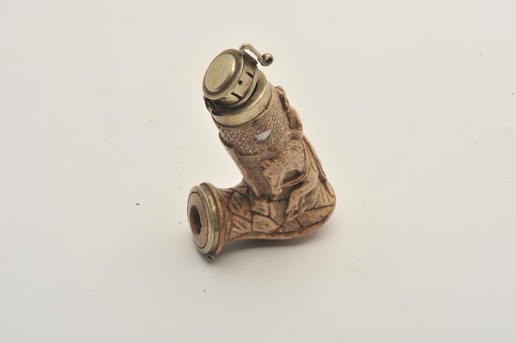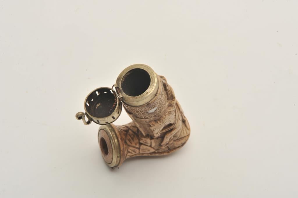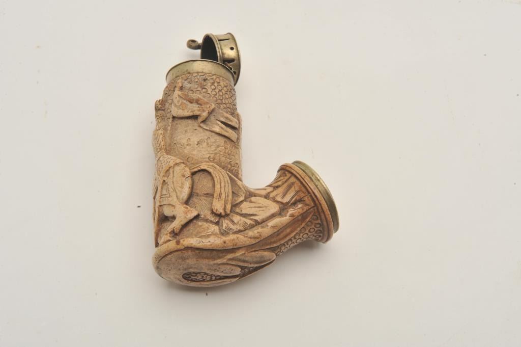 18CA-349 CARVED MERSHAM PIPECarved mershan pipe with German silver cover showing knight on horseback with sword and banner in high relief carving dating to the 19th century for German style woven stem. Measures 5” in height x 3 ¼”. Good withslight damage and aging. Est.: $150-$300Carved mershan pipe with German silver cover showing knight on horseback with sword and banner in high relief carving dating to the 19th century for German style woven stem. Measures 5” in height x 3 ¼”. Good withslight damage and aging. Est.: $150-$300