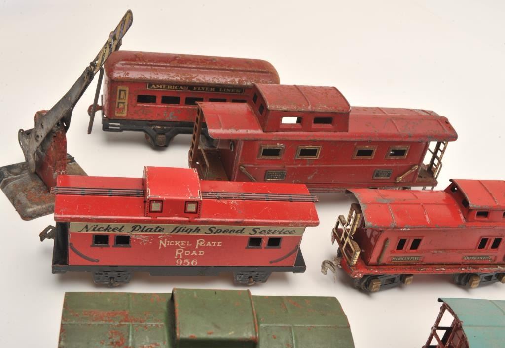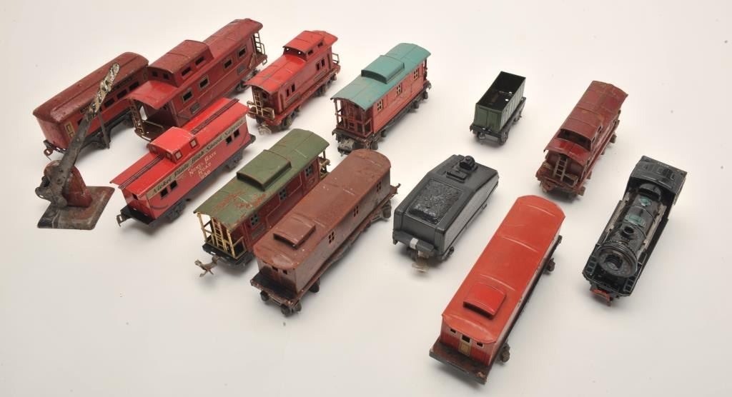 17FU-24 TIN TRAINS 1930-1940 LIONEL/AMER. FLYERLot of 12 old toy train cars, ca. 1930s-40s, by Lionel and American Flyer with a railroad crossing guard; metal construction and ranging in condition from good to very good. Est.: $200-$400.Lot of 12 old toy train cars, ca. 1930s-40s, by Lionel and American Flyer with a railroad crossing guard; metal construction and ranging in condition from good to very good. Est.: $200-$400.