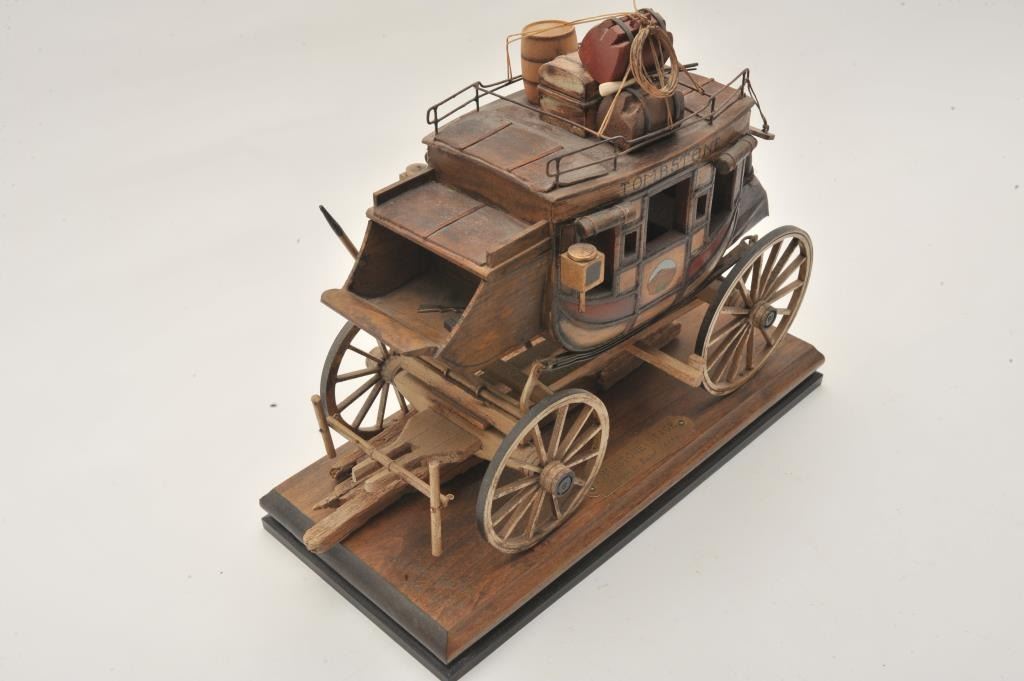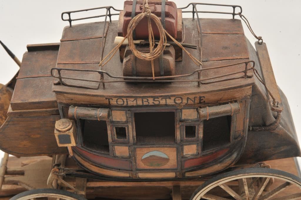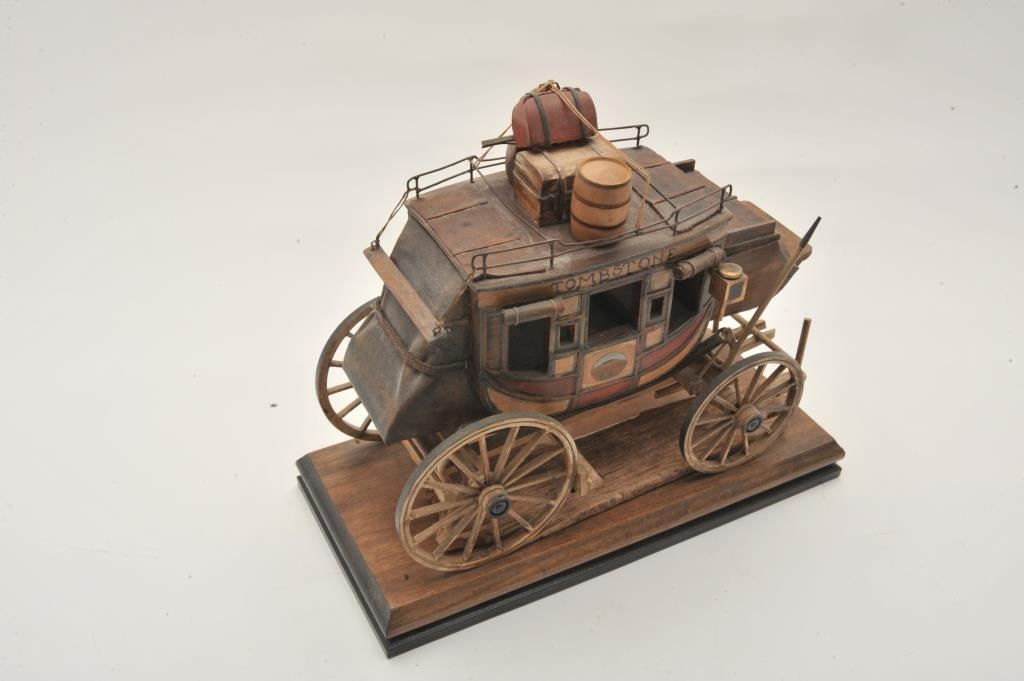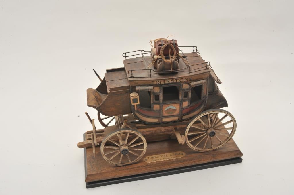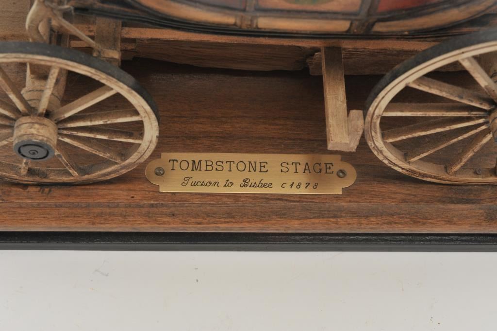 18AP-73 WOOD CARVED STAGEFinely made wood carved Tombstone stage on wood base with brass plaque “TOMBSTONE STAGE/Tucson to Bisbee c. 1878”; original artwork and signed by Oscar Cortes/1996 (now deceased); approximately 11” in height x 13”in length x 7” wide. Est.: $350-$700.Finely made wood carved Tombstone stage on wood base with brass plaque “TOMBSTONE STAGE/Tucson to Bisbee c. 1878”; original artwork and signed by Oscar Cortes/1996 (now deceased); approximately 11” in height x 13”in length x 7” wide. Est.: $350-$700.