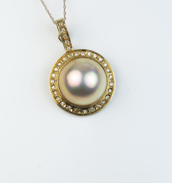 18CAI-55 MOBE PEARL PENDANTGorgeous pendant featuring a fine Mobe pearl averaging 15.00 in diameter and surrounded by 34 round Diamonds of H-I colors and VS clarity set in a 14 karat rose gold setting. Estimates $1,000-$1,500Gorgeous pendant featuring a fine Mobe pearl averaging 15.00 in diameter and surrounded by 34 round Diamonds of H-I colors and VS clarity set in a 14 karat rose gold setting. Estimates $1,000-$1,500
