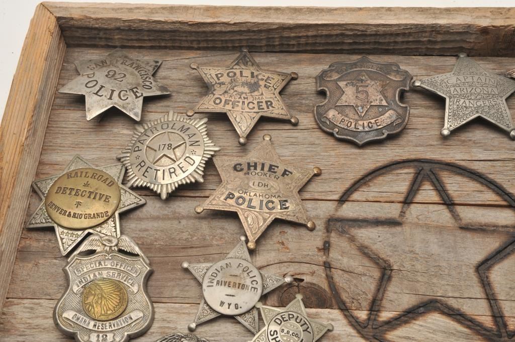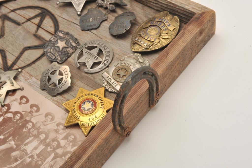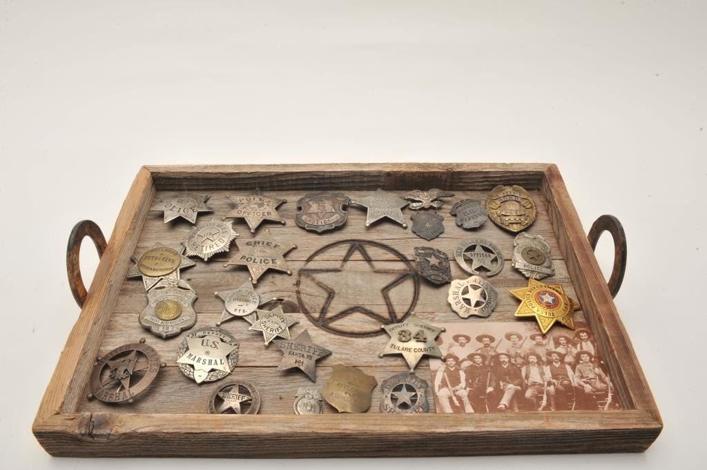 18AP-83 REPROBonanza lot of approximately 26 good reproduction law enforcement badges; accompanied by a wooden tray with horse shoe handles. Est.: $150-$300.Bonanza lot of approximately 26 good reproduction law enforcement badges; accompanied by a wooden tray with horse shoe handles. Est.: $150-$300.