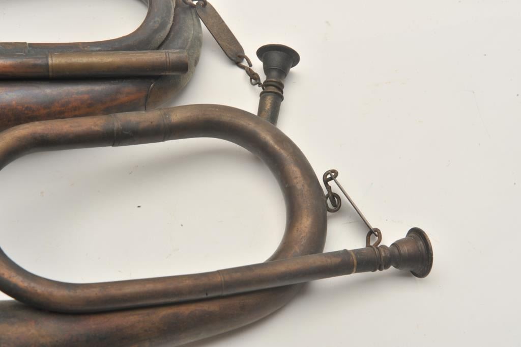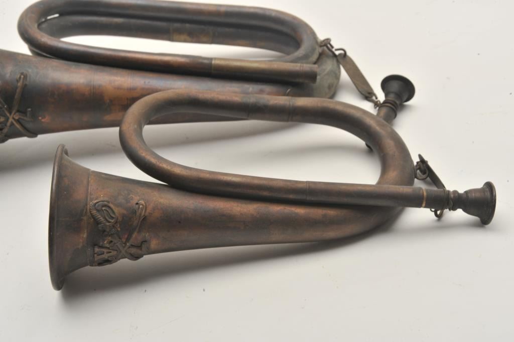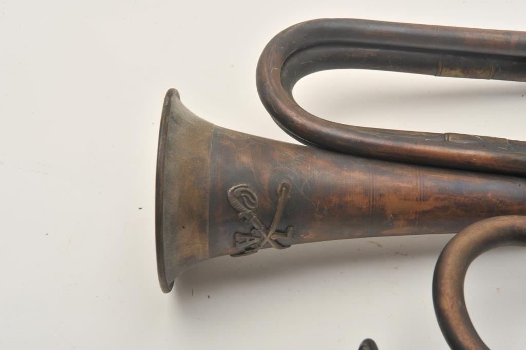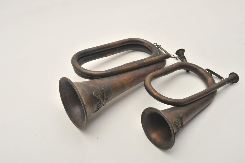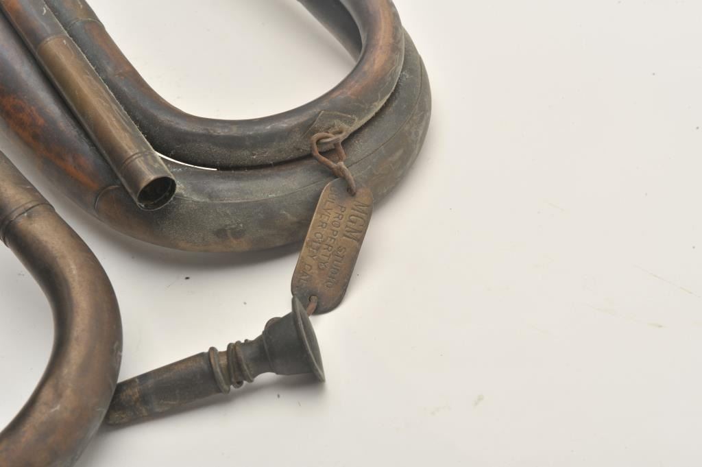 18AP-1001 BUGLE LOTLot of two bugles marked MGM Studios property. The bugles are marked with MGM Studios property tags, the first is 10” in length and the second is 12”. Both have been artificially aged and are marked withcavalry emblems. These could have been associated with any number of period productions depicting the US Cavalry and are worth researching. Est.: $50-$100.Lot of two bugles marked MGM Studios property. The bugles are marked with MGM Studios property tags, the first is 10” in length and the second is 12”. Both have been artificially aged and are marked withcavalry emblems. These could have been associated with any number of period productions depicting the US Cavalry and are worth researching. Est.: $50-$100.