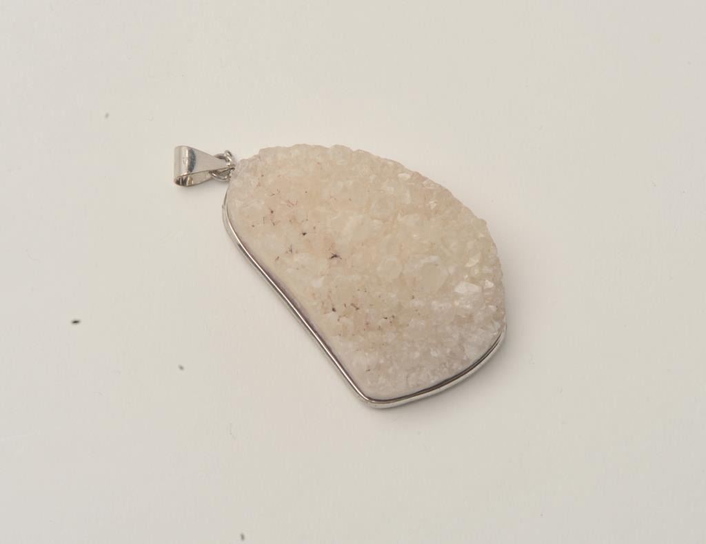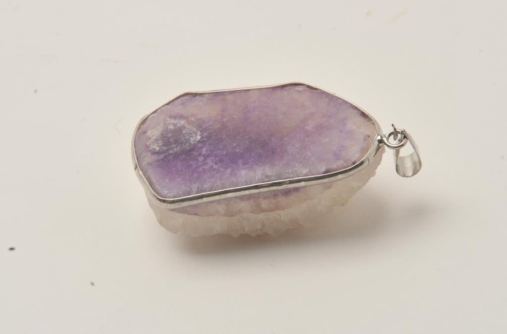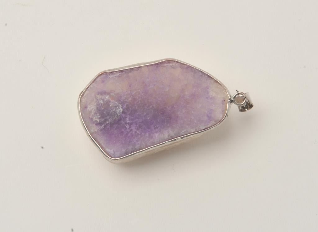 17LP-18 GEODE PENDANTGeode pendant with silver tone case. The 2” x 1 ¼” pendant is set with a silver tone frame featuring beautiful white crystal and a purple backing. Est.: $50-$100.Geode pendant with silver tone case. The 2” x 1 ¼” pendant is set with a silver tone frame featuring beautiful white crystal and a purple backing. Est.: $50-$100.