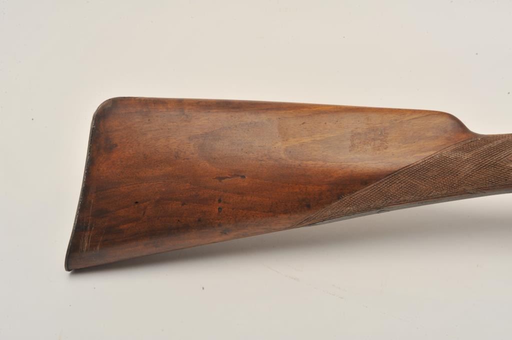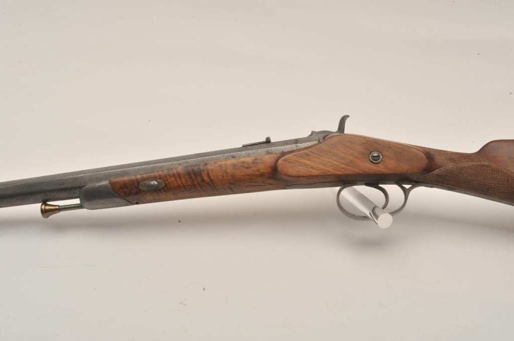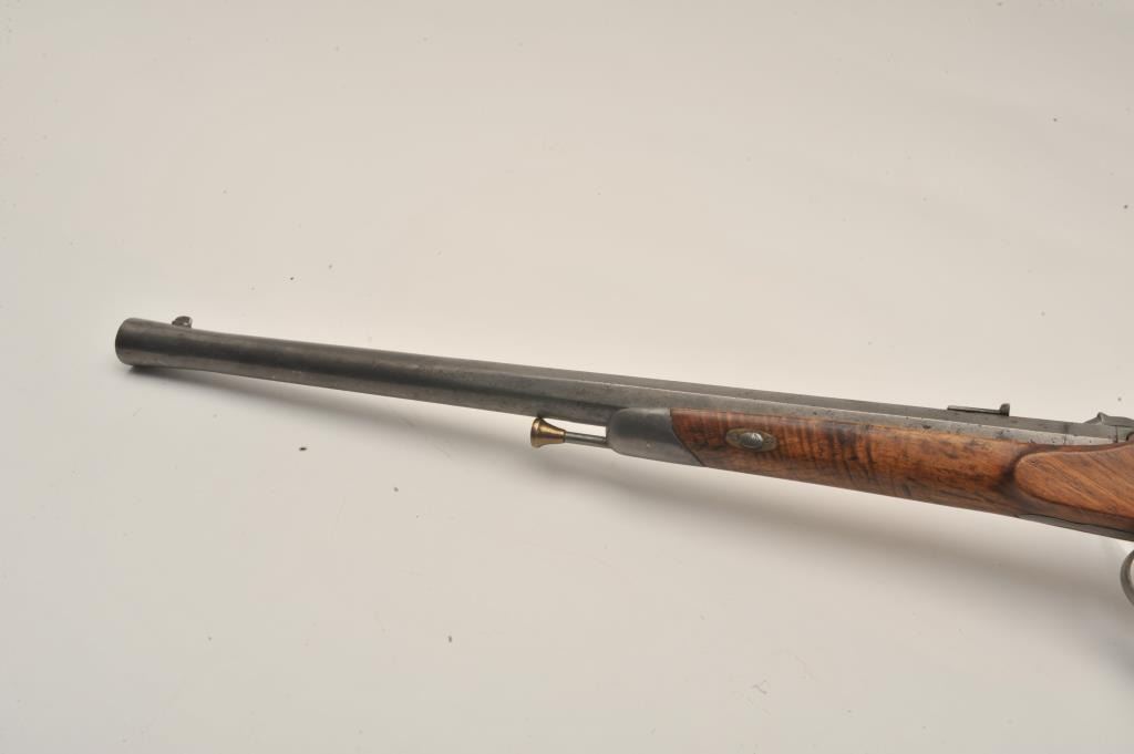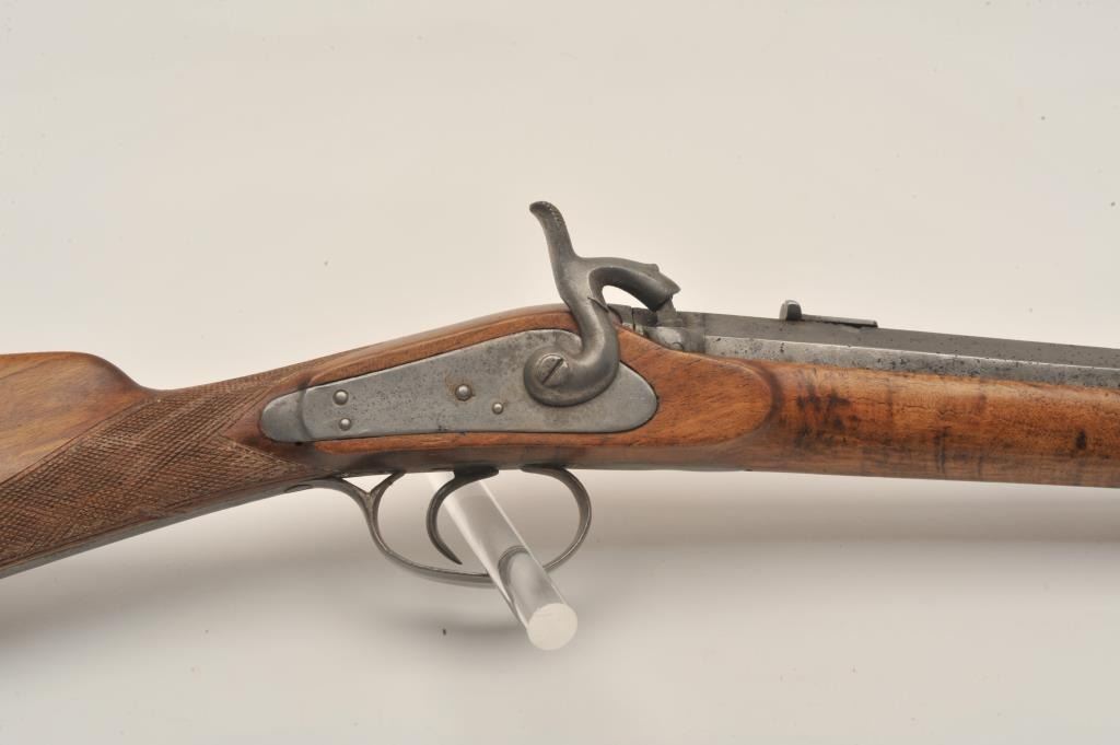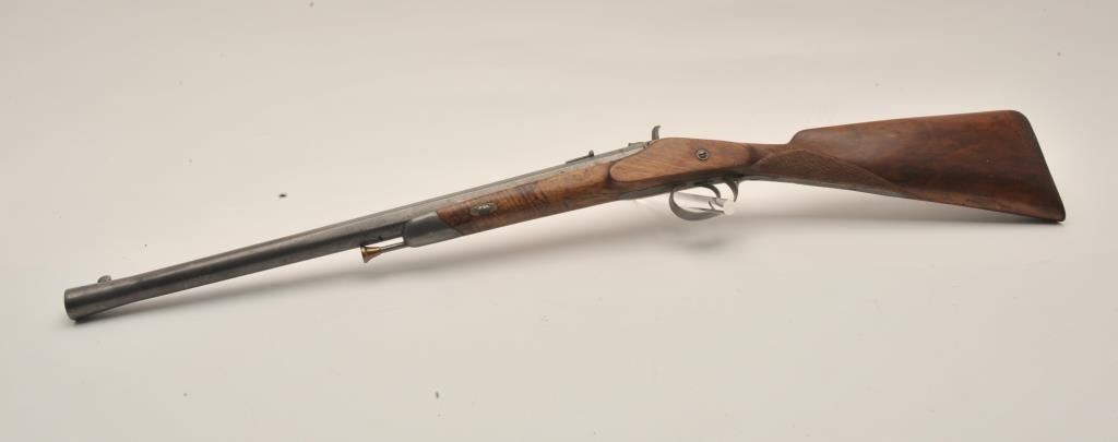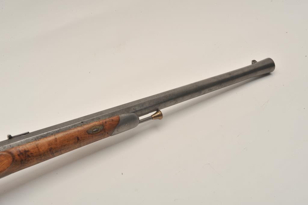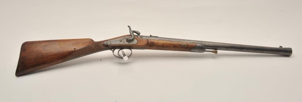 18AR-54 FRENCH CARBINEFrench percussion military style carbine circa late 1850’s to 60’s with flared iron barrel of almost blunderbuss size. Measures 37” overall with 21”barrel that measures 9 across in walls of barrel or .90 plus caliber .90 plus caliber! Shows sights on the barrel. Cleaned metal and wood with sharpened checkering. Brass tipped ramrod is included. Recognized French dealer stated several like this found in Egypt in the 50’s. (Antique)Est.: $500-$1000French percussion military style carbine circa late 1850’s to 60’s with flared iron barrel of almost blunderbuss size. Measures 37” overall with 21”barrel that measures 9 across in walls of barrel or .90 plus caliber .90 plus caliber! Shows sights on the barrel. Cleaned metal and wood with sharpened checkering. Brass tipped ramrod is included. Recognized French dealer stated several like this found in Egypt in the 50’s. (Antique)Est.: $500-$1000