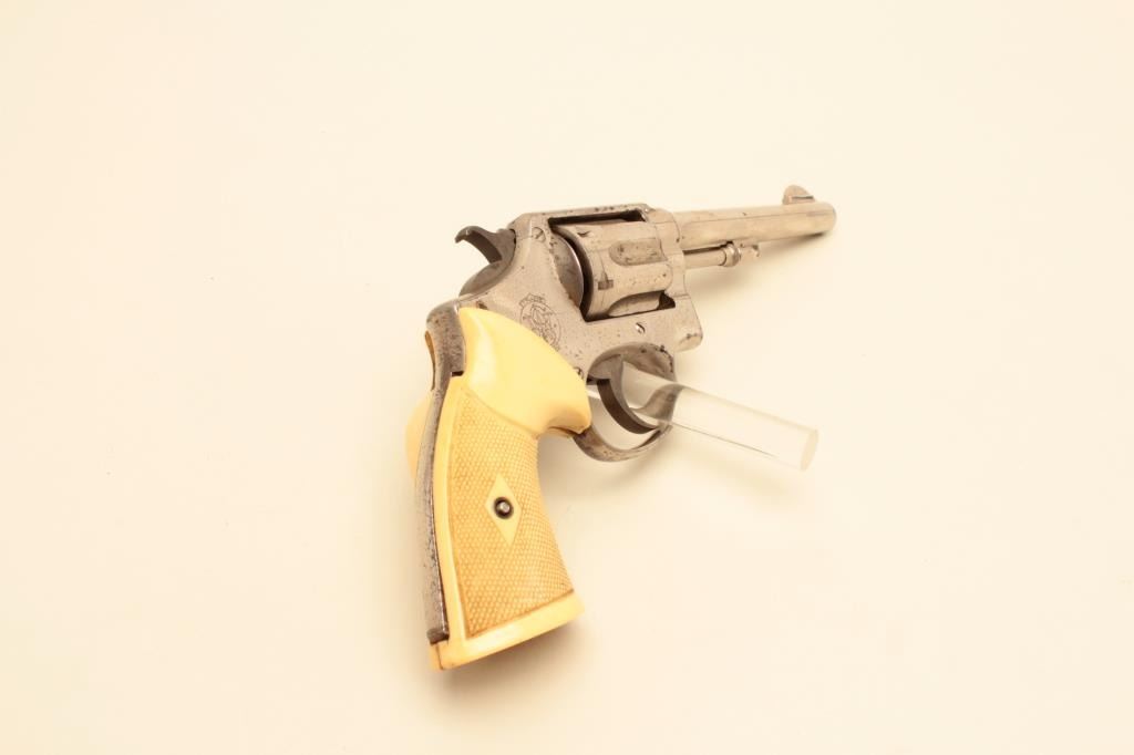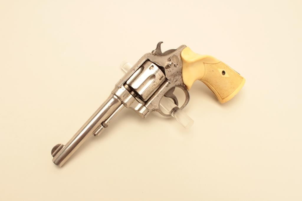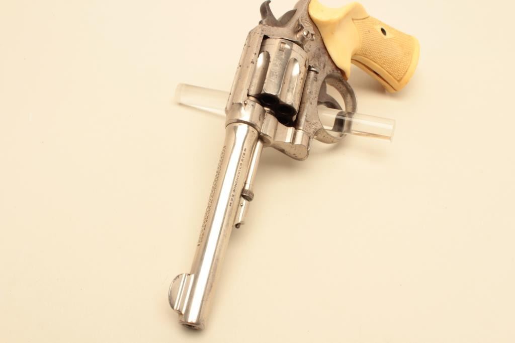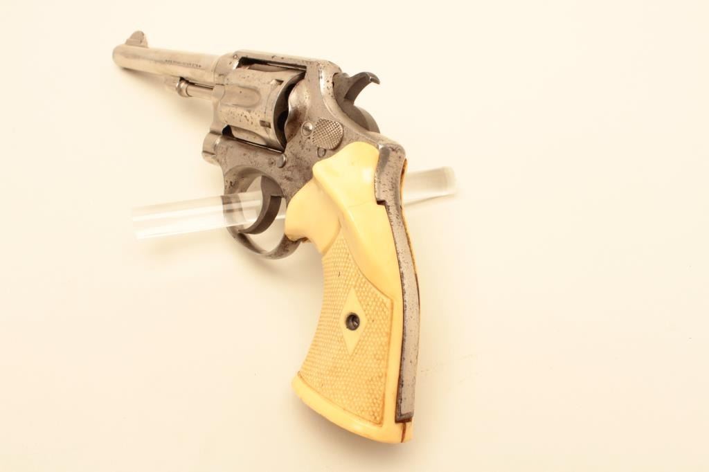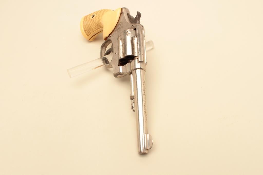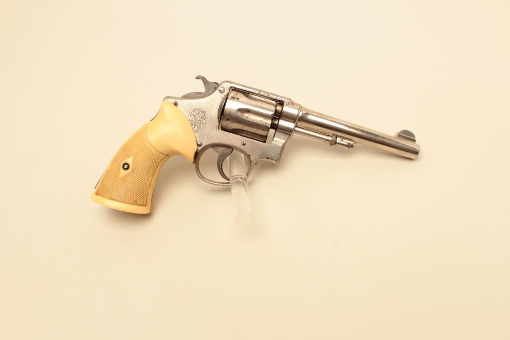 17JL-65 S&W 32-20Smith & Wesson Hand Ejector DA revolver, .32 Winchester caliber, 5” barrel, nickel finish, checkered faux ivory plastic grips, S/N 48697, in overall good to very good condition displaying the majority of its factorynickel finish, good bore, action, markings and older replacement grips. (C&R/PPT). Est.: $200-$400.Smith & Wesson Hand Ejector DA revolver, .32 Winchester caliber, 5” barrel, nickel finish, checkered faux ivory plastic grips, S/N 48697, in overall good to very good condition displaying the majority of its factorynickel finish, good bore, action, markings and older replacement grips. (C&R/PPT). Est.: $200-$400.