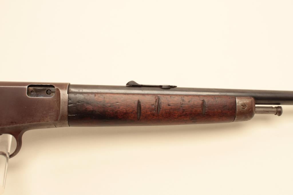 17JL-37 WIN MOD 03 #87313Winchester Model 1903 semi-automatic rifle, .22 caliber, 20” round barrel, blued finish, wood stocks, S/N 87313, in overall fair + condition showing muted blued finish to the barrel and brown patina to receiver, goodbore, good action, wood forend shows 8 old hash “kill” marks; butt stock shows a crack at the wrist and the butt plate has been bent over the bottom of the butt where there was an old small loss of wood; “P” carved intothe left side of the butt stock. (C&R). Est.: $200-$400.Winchester Model 1903 semi-automatic rifle, .22 caliber, 20” round barrel, blued finish, wood stocks, S/N 87313, in overall fair + condition showing muted blued finish to the barrel and brown patina to receiver, goodbore, good action, wood forend shows 8 old hash “kill” marks; butt stock shows a crack at the wrist and the butt plate has been bent over the bottom of the butt where there was an old small loss of wood; “P” carved intothe left side of the butt stock. (C&R). Est.: $200-$400.