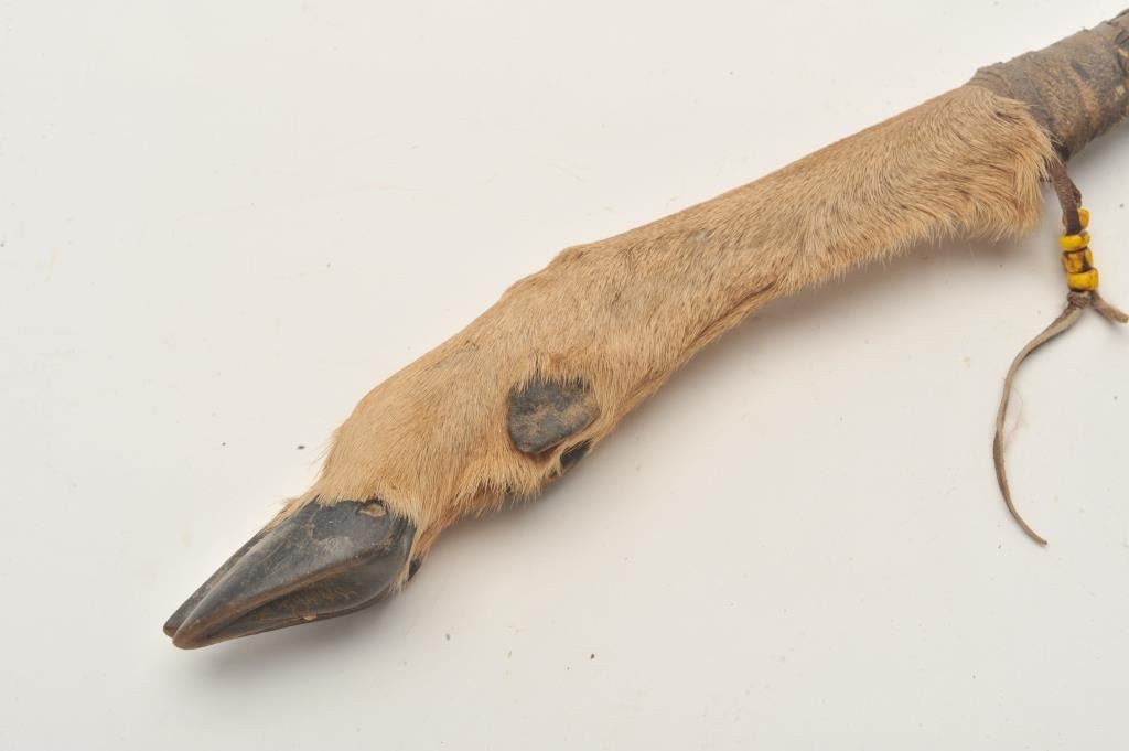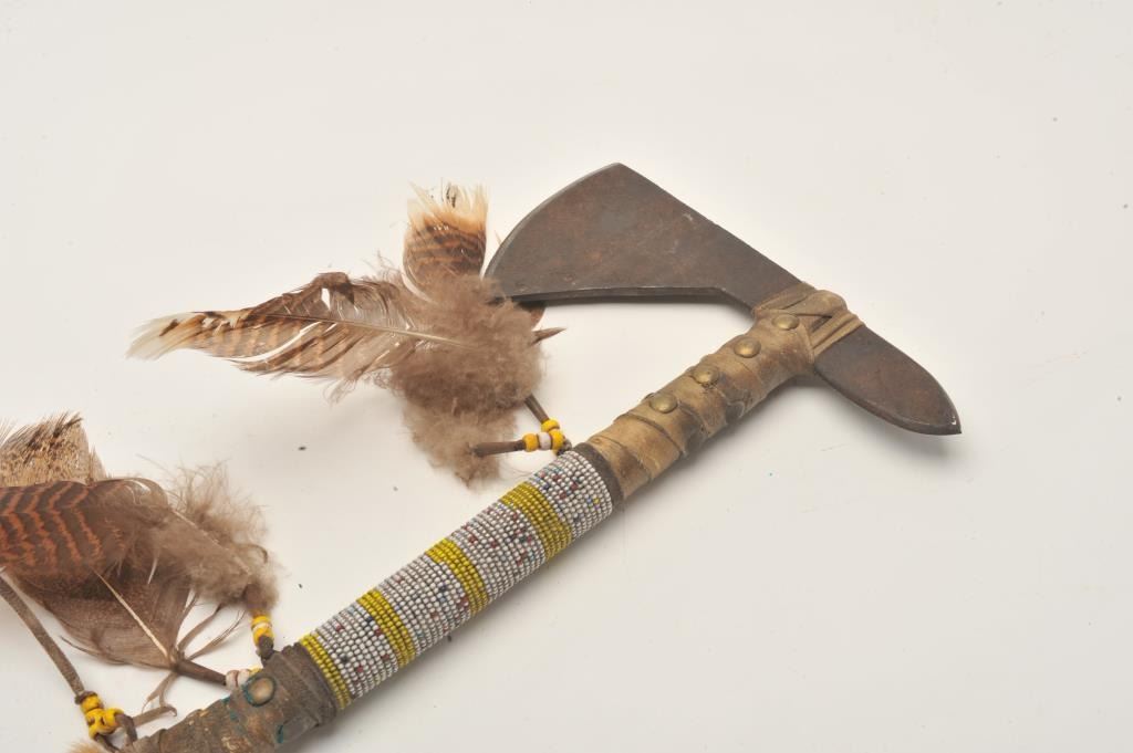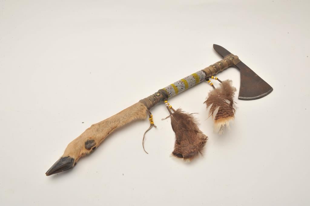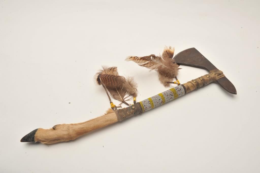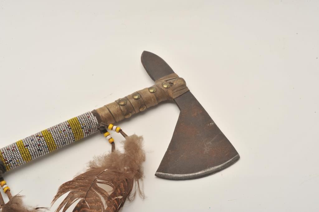 Lot 1216 18AP-61 TOMAHAWKTomahawk with beaded shaft and deer foot bottom portion of grip; approximately 21.5