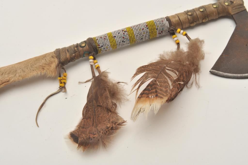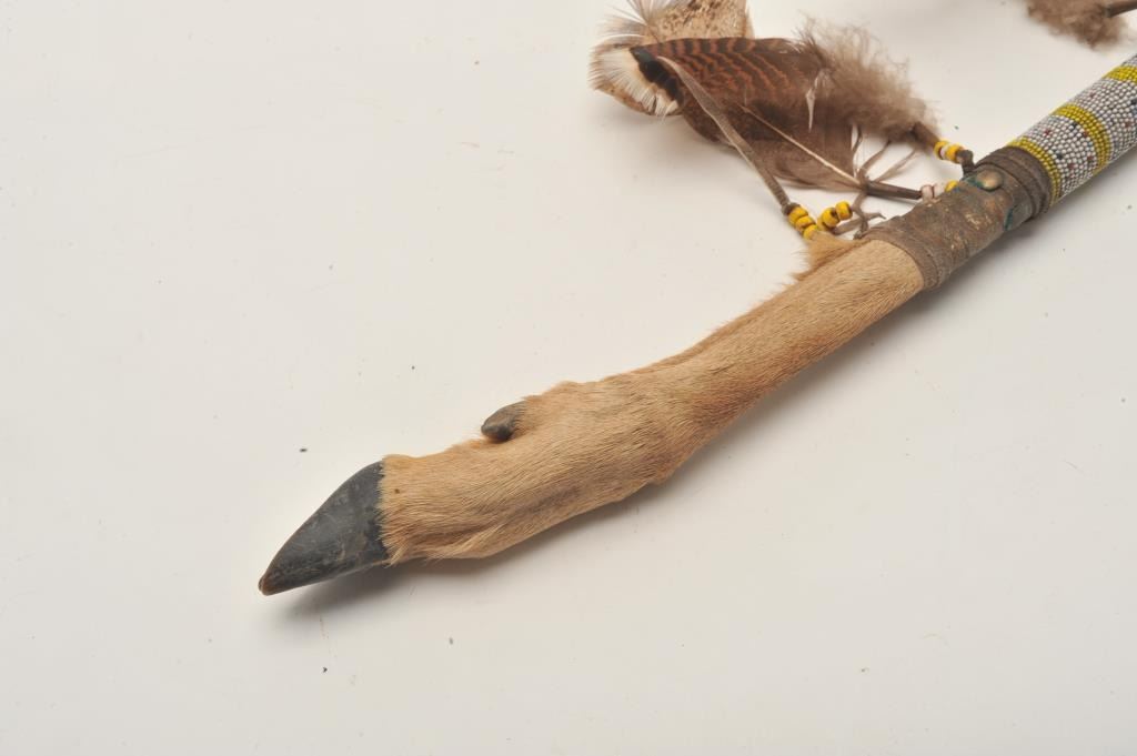 18AP-61 TOMAHAWKTomahawk with beaded shaft and deer foot bottom portion of grip; approximately 21.5” overall with dangles, feathers, etc.; ca. 20th Century showing some age. Est.: $150-$300.Tomahawk with beaded shaft and deer foot bottom portion of grip; approximately 21.5” overall with dangles, feathers, etc.; ca. 20th Century showing some age. Est.: $150-$300.