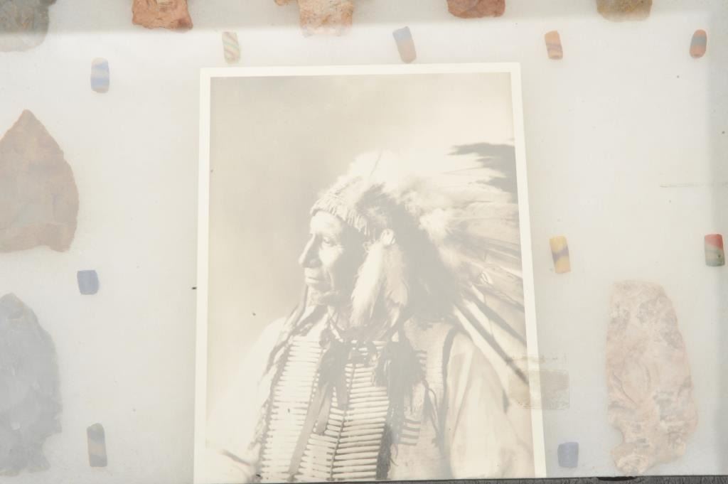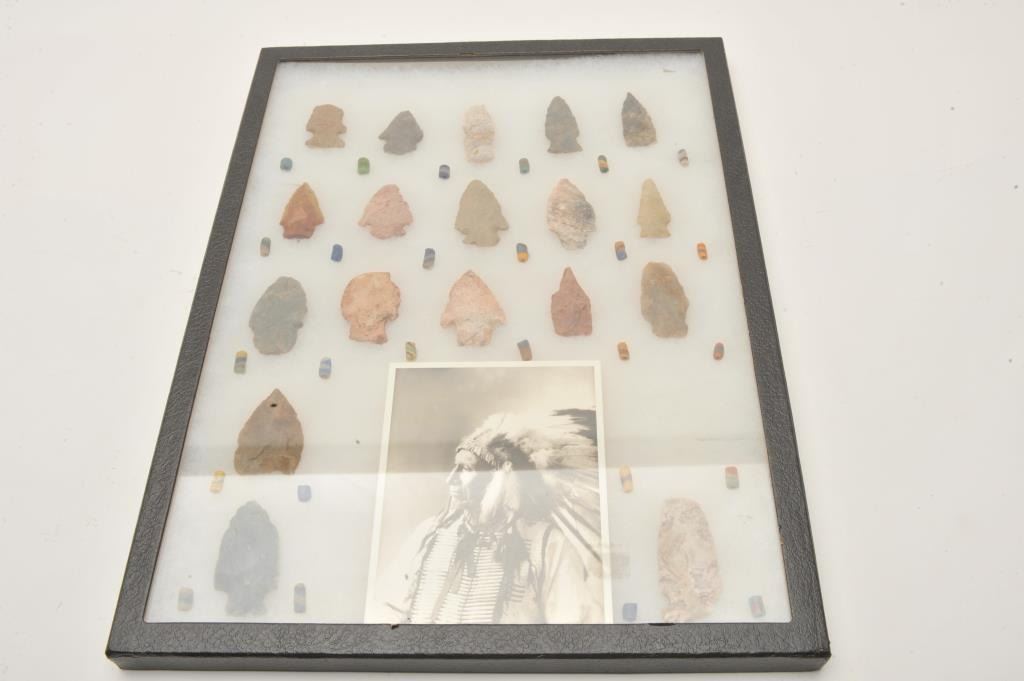 18AP-72 ARROW HEADSArrowhead and bead display in riker case with modern photo copy of an Indian with war bonnet and dress regalia. Est.: $100-$200.Arrowhead and bead display in riker case with modern photo copy of an Indian with war bonnet and dress regalia. Est.: $100-$200.