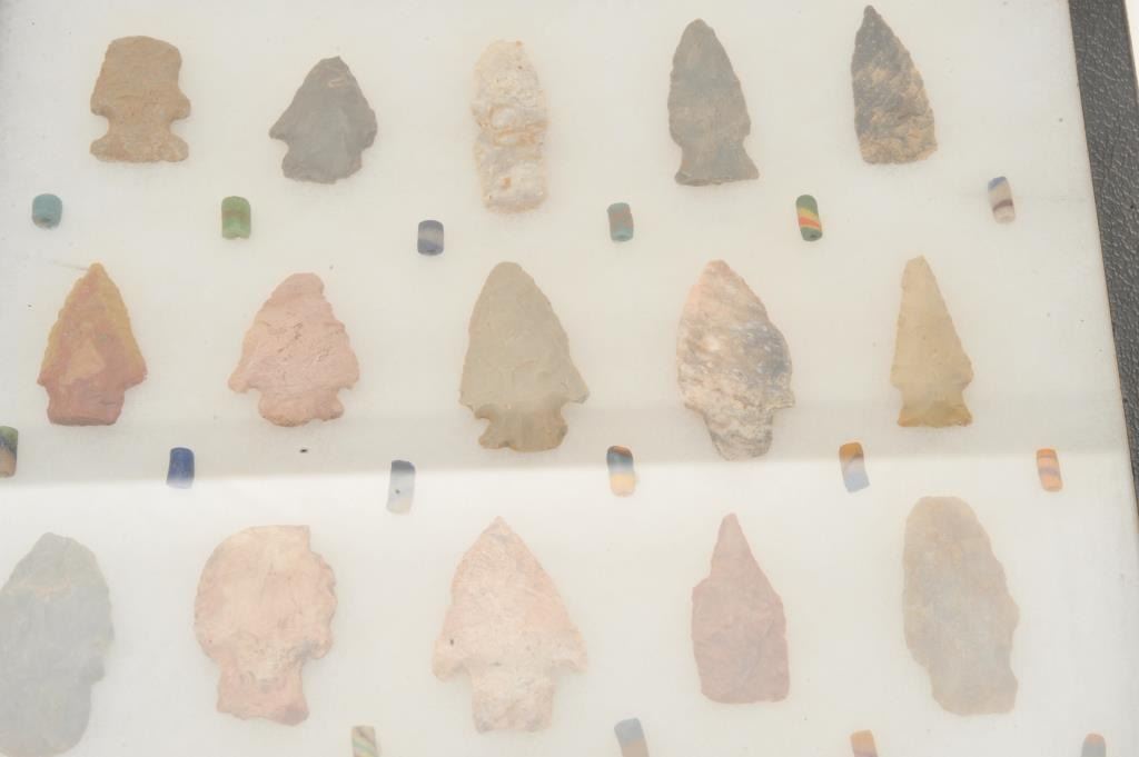 Lot 1219 18AP-72 ARROW HEADSArrowhead and bead display in riker case with modern photo copy of an Indian wit