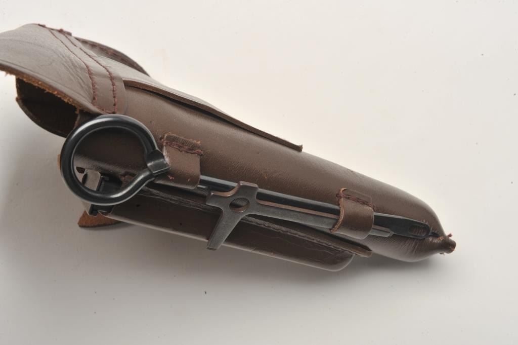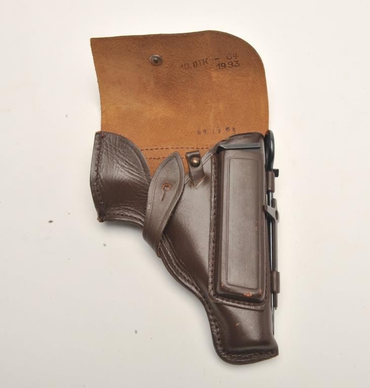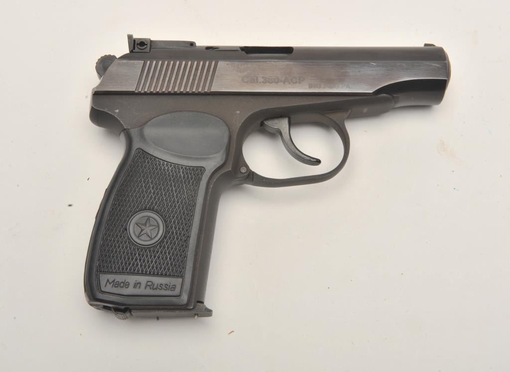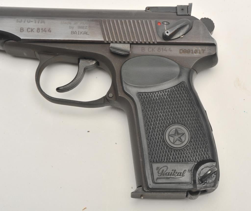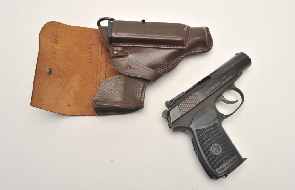 17FS-129 IMEZ #D001017Russian Baikal DA semi-automatic pistol by IMEZ, import-marked, .380 ACP caliber, 3.5” barrel, blued finish, checkered grips, S/N D001017, in overall fine condition showing little use; with leather flap holster and one extra magazine. (Modern/No PPT). Est.: $125-$250.Russian Baikal DA semi-automatic pistol by IMEZ, import-marked, .380 ACP caliber, 3.5” barrel, blued finish, checkered grips, S/N D001017, in overall fine condition showing little use; with leather flap holster and one extra magazine. (Modern/No PPT). Est.: $125-$250.