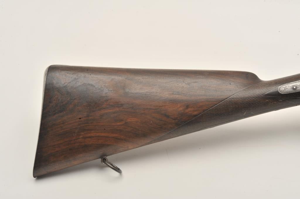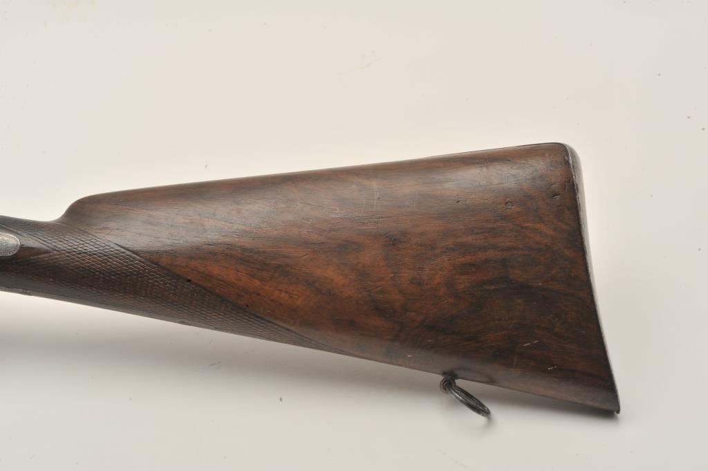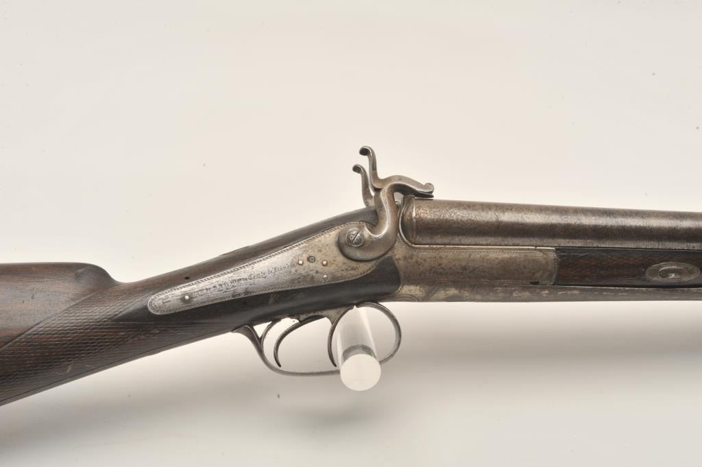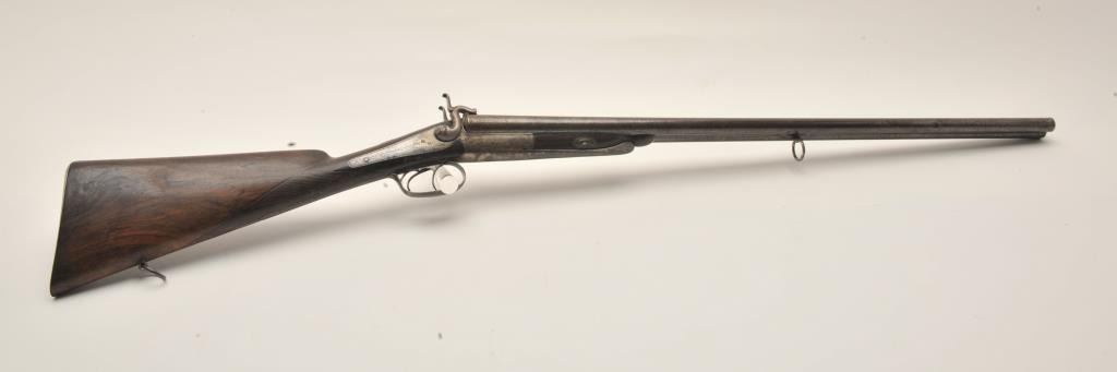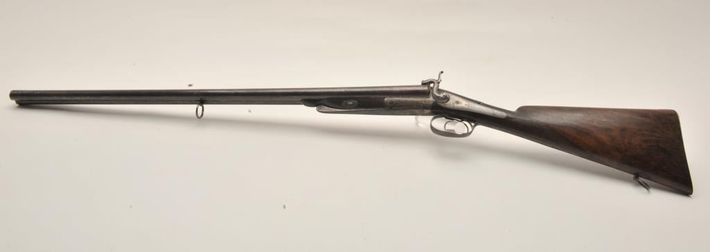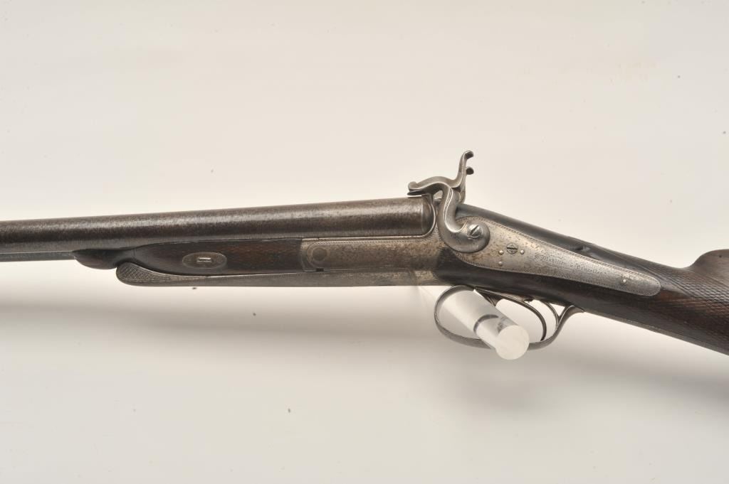 18AR-50 PINFIREEuropean back action locks SxS pinfire shotgun, 12 gauge, 30” barrels, double triggers, checkered wood stocks, in overall good to very good condition with a crisp action, dark patina and good wood; left sidelockplate marked “B. Maquillon a Brurelles”. (Antique). Est.: $250-$500.European back action locks SxS pinfire shotgun, 12 gauge, 30” barrels, double triggers, checkered wood stocks, in overall good to very good condition with a crisp action, dark patina and good wood; left sidelockplate marked “B. Maquillon a Brurelles”. (Antique). Est.: $250-$500.