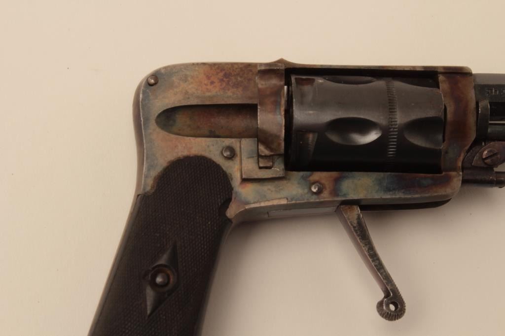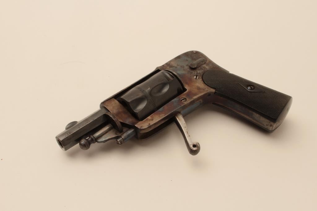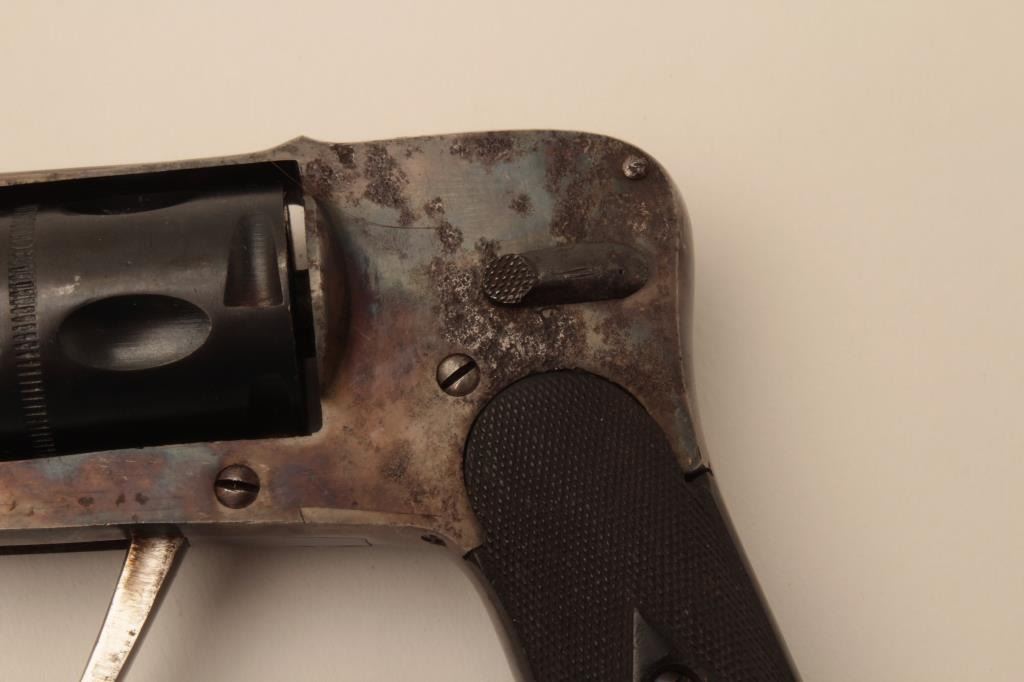18AR-72 VELO DOG REVOLVERBelgian 5mm Velo Dog style revolver with folding trigger circa 1890’s. 90%-95% bright blue and rainbow case hardening with checkered hardwood or ebony grip. Marked “hammerless” indicating export to Britain orU.S. Some moderate pitting by safety and lighter scattered pitting. Works well. Est.: $300-$600Belgian 5mm Velo Dog style revolver with folding trigger circa 1890’s. 90%-95% bright blue and rainbow case hardening with checkered hardwood or ebony grip. Marked “hammerless” indicating export to Britain orU.S. Some moderate pitting by safety and lighter scattered pitting. Works well. Est.: $300-$600