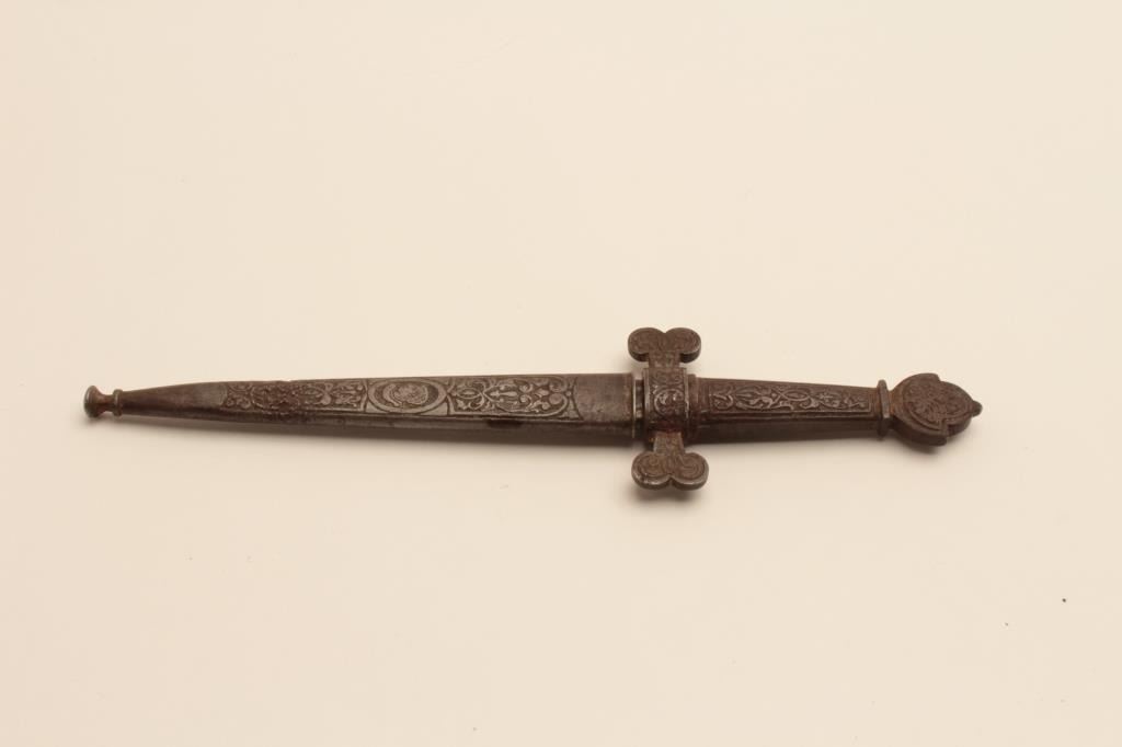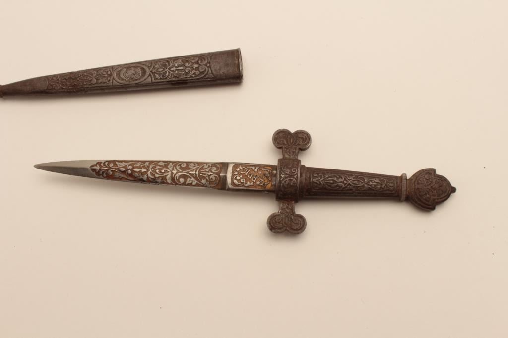 18AR-92 TOLEDO DAGGER19Th century fabrica Toledo dagger in armoral style with fancy etched decoration. Measures 7 ½” overall with a 4 ½” blade. Very nice patina blade with fancy etching and gold gilt. Good patina on scabbard and hilt. E.Zoloaga opened an armoury in 19th century in Toledo Spain where he recreated arms and armoral in ancient styles and decorated them similarly. He re-invented the gold damascening process and he worked under LePage and other masters before perfecting his craft. He won many exhibitions in Europe 1870-1900. Est.: $350-$70019Th century fabrica Toledo dagger in armoral style with fancy etched decoration. Measures 7 ½” overall with a 4 ½” blade. Very nice patina blade with fancy etching and gold gilt. Good patina on scabbard and hilt. E.Zoloaga opened an armoury in 19th century in Toledo Spain where he recreated arms and armoral in ancient styles and decorated them similarly. He re-invented the gold damascening process and he worked under LePage and other masters before perfecting his craft. He won many exhibitions in Europe 1870-1900. Est.: $350-$700