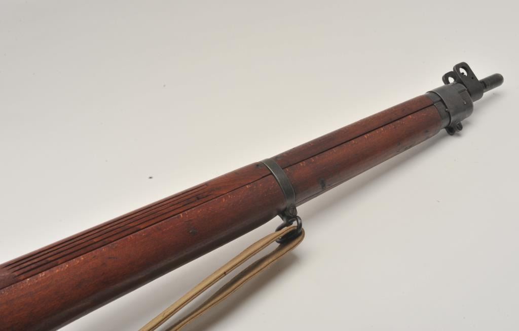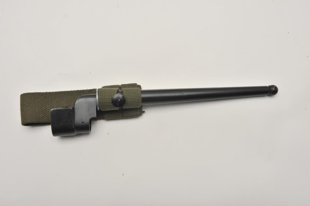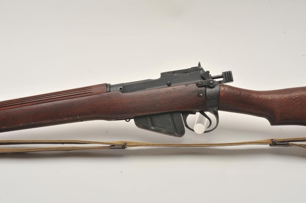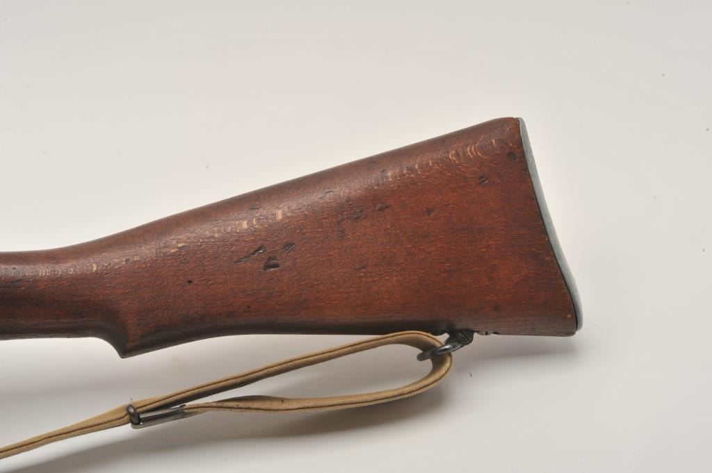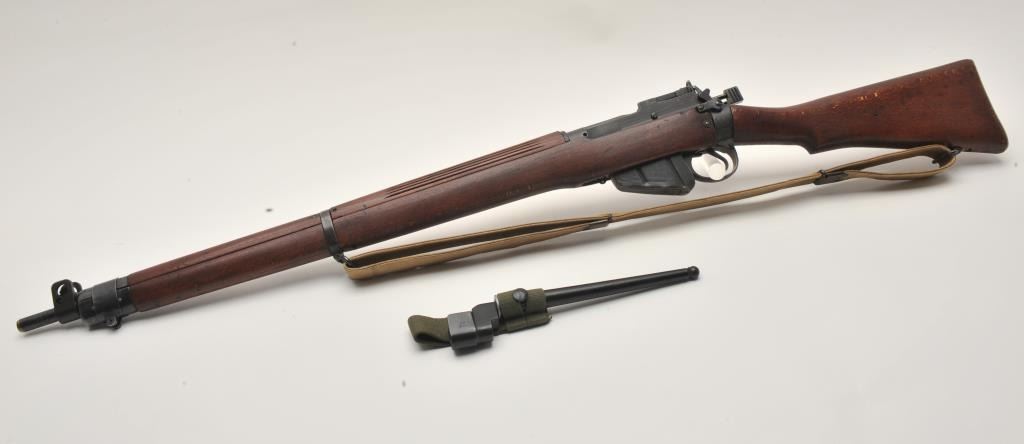 17MH-26 ENFIELD NO4 #D27856British Enfield No. 4 MK I bolt action rifle, .303 caliber, military finish, wood stock, tan woven sling, S/N D27856, in overall good to very good condition with a good bore, crisp action, good markings and very goodwood stock. Accompanied by a bayonet, sheath and green woven hanger. (C&R/PPT). Est.: $300-$600.British Enfield No. 4 MK I bolt action rifle, .303 caliber, military finish, wood stock, tan woven sling, S/N D27856, in overall good to very good condition with a good bore, crisp action, good markings and very goodwood stock. Accompanied by a bayonet, sheath and green woven hanger. (C&R/PPT). Est.: $300-$600.