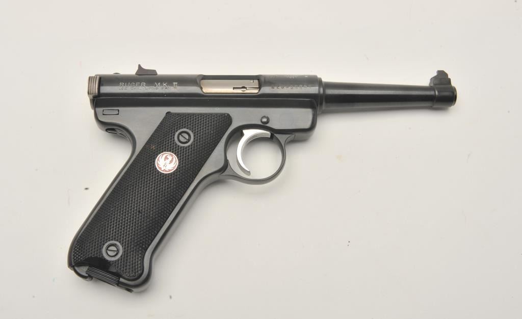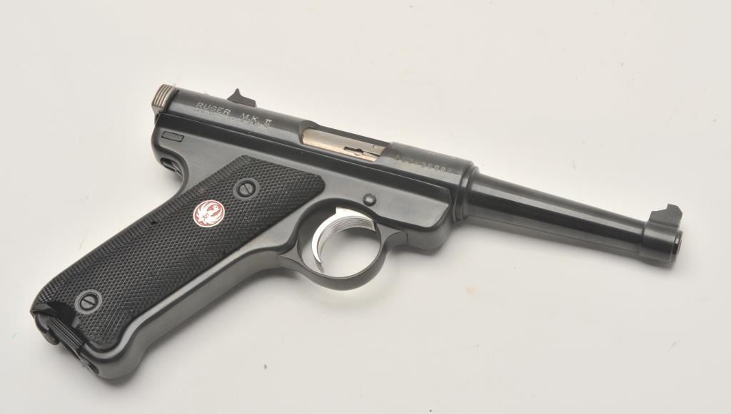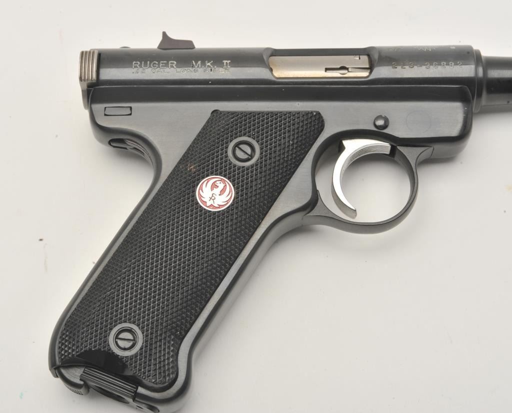 18AA-11 RUGER MARK II 50TH ANN. #223-36882Ruger Mark II 50th Anniversary semi-auto pistol, .22 Long Rifle caliber, Serial #223-36882. The pistol is in very good to nearly fine condition with a 4 ¾” barrel. The pistol retains nearly all of its bluefinish with only storage marks. The checkered plastic grips are in very good condition showing little use. The bore is excellent, the action crisp and markings are sharp. The lot includes one correctmagazine. Est.: $250-$500. (Modern).Ruger Mark II 50th Anniversary semi-auto pistol, .22 Long Rifle caliber, Serial #223-36882. The pistol is in very good to nearly fine condition with a 4 ¾” barrel. The pistol retains nearly all of its bluefinish with only storage marks. The checkered plastic grips are in very good condition showing little use. The bore is excellent, the action crisp and markings are sharp. The lot includes one correctmagazine. Est.: $250-$500. (Modern).