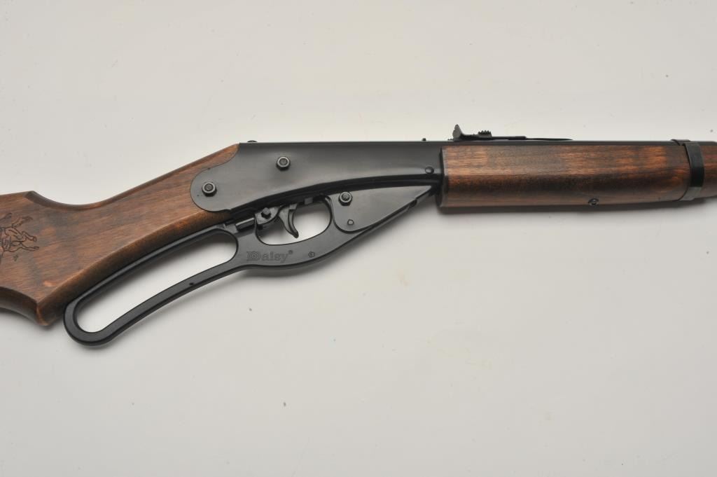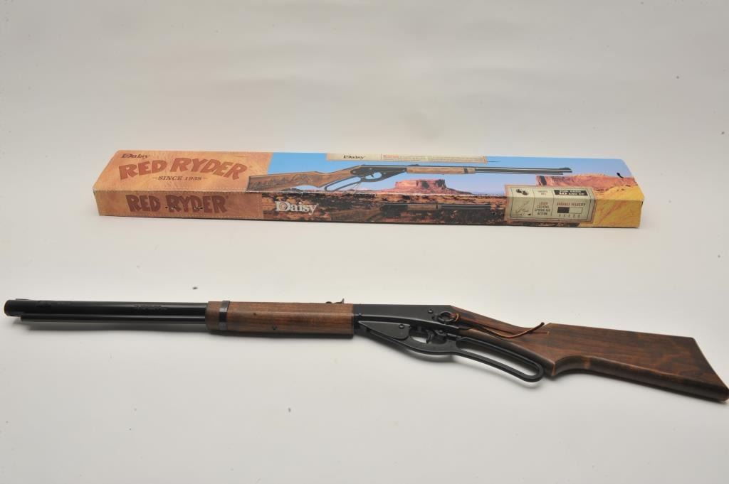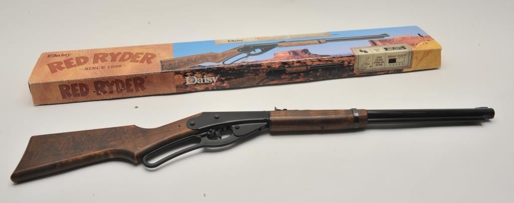17LP-8 DAISY RED RYDERDaisy Red Ryder lever action bb rifle, .177 caliber, Serial #NSNV. The rifle is as new in the box with all associated packing materials and instructions. Est.: $25-$50.Daisy Red Ryder lever action bb rifle, .177 caliber, Serial #NSNV. The rifle is as new in the box with all associated packing materials and instructions. Est.: $25-$50.