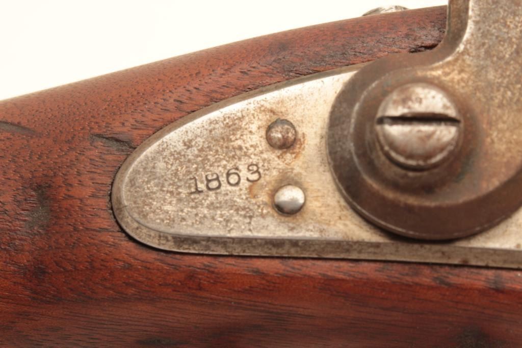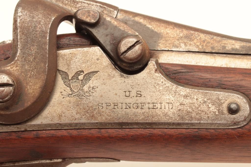 17LP-11 SPRINGFIELD TRAPDOORSpringfield Model 1863 Trapdoor rifle, .50-70 caliber, Serial #NSNV. The rifle is in good overall condition with a 37” barrel. The barrel has gone to a grey patina with light surface rust. The side plate is marked,“U.S. SPRINGFIELD” with the eagle emblem and dated 1863. The smooth wood stock is in good condition with mars and compressions consistent with service use. The butt ends with a smooth steel crescent butt plate. The bore is fair, the action functions and the markings are legible. Est.: $400-$800. (Antique).Springfield Model 1863 Trapdoor rifle, .50-70 caliber, Serial #NSNV. The rifle is in good overall condition with a 37” barrel. The barrel has gone to a grey patina with light surface rust. The side plate is marked,“U.S. SPRINGFIELD” with the eagle emblem and dated 1863. The smooth wood stock is in good condition with mars and compressions consistent with service use. The butt ends with a smooth steel crescent butt plate. The bore is fair, the action functions and the markings are legible. Est.: $400-$800. (Antique).