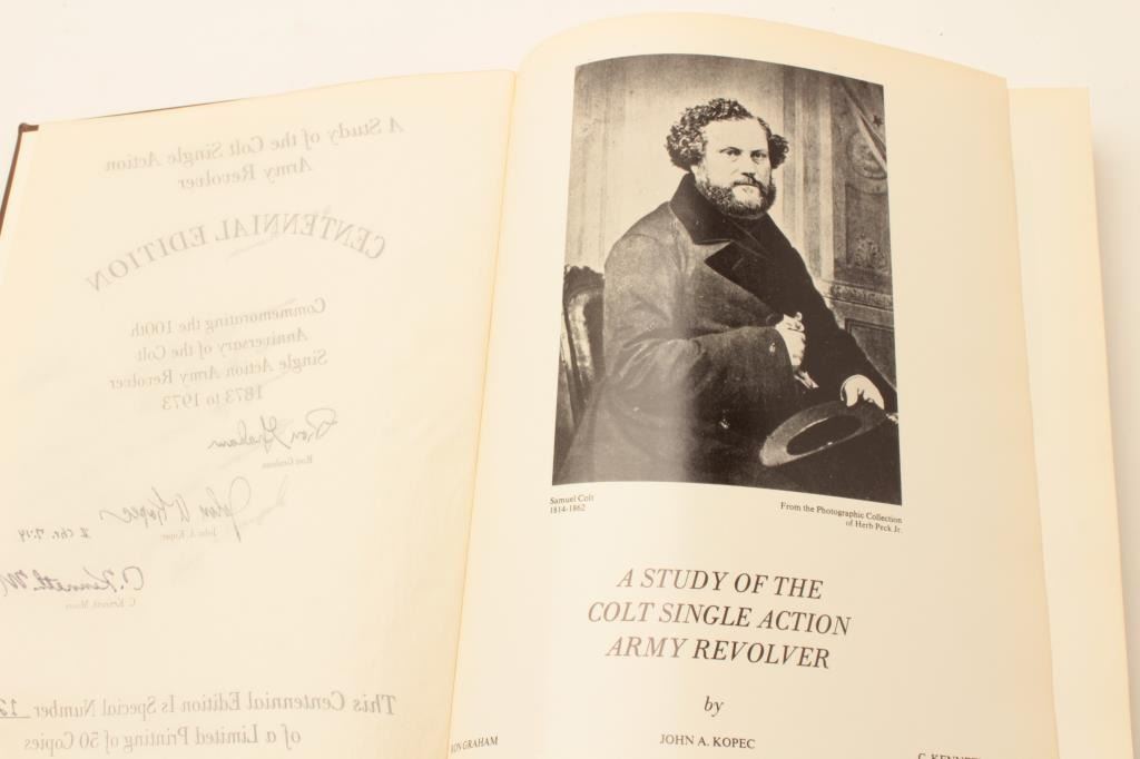 18AG-1 COLT SINGLE ACTION ARMY REVOLVER BOOKA Study of the Colt Single Action Army Revolver signed special Centennial edition number 12 of a limited printing of 50 copies with an important inscription. This signed first copy is signed by all three authors and is inscribed to Chet Bonoff by Ray Vanyek. Bonoff and Vanyek were both legendary early Southern California Colt collectors with Vanyek having owned the Pinkerton gun along with numerous high end engraved Colt SAApistols. This is an opportunity to get not only an important reference book but one that descended from a couple of notable local collectors. Est.: $200-$400.A Study of the Colt Single Action Army Revolver signed special Centennial edition number 12 of a limited printing of 50 copies with an important inscription. This signed first copy is signed by all three authors and is inscribed to Chet Bonoff by Ray Vanyek. Bonoff and Vanyek were both legendary early Southern California Colt collectors with Vanyek having owned the Pinkerton gun along with numerous high end engraved Colt SAApistols. This is an opportunity to get not only an important reference book but one that descended from a couple of notable local collectors. Est.: $200-$400.
