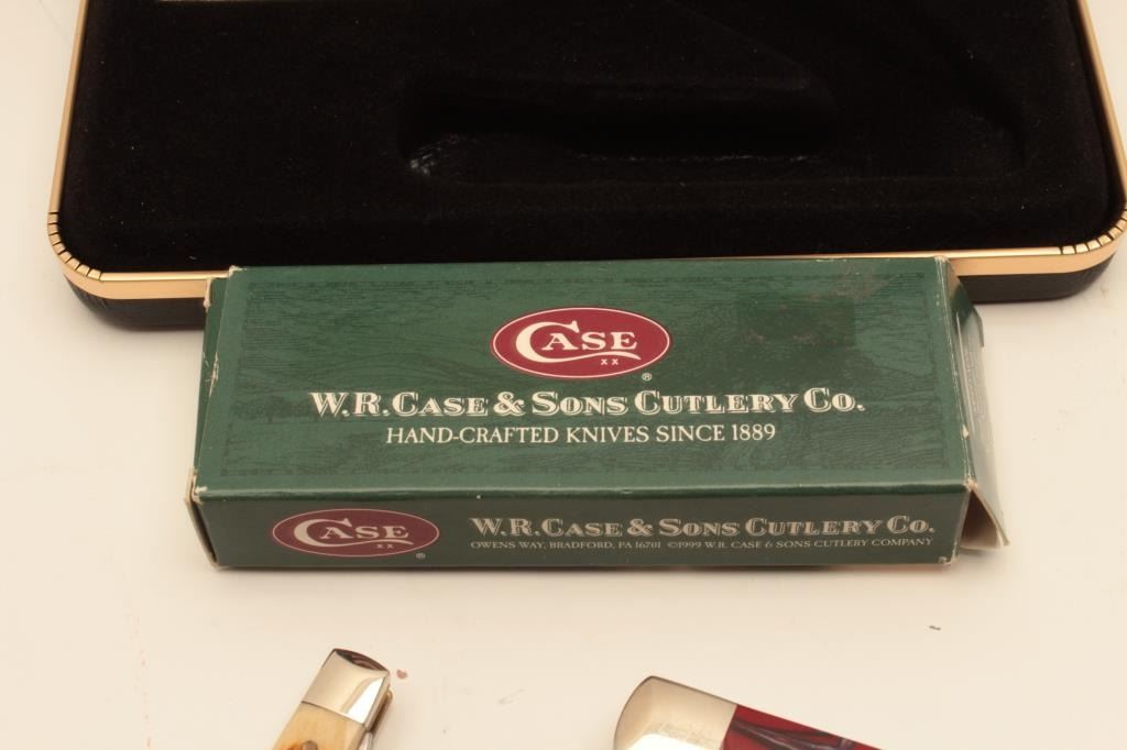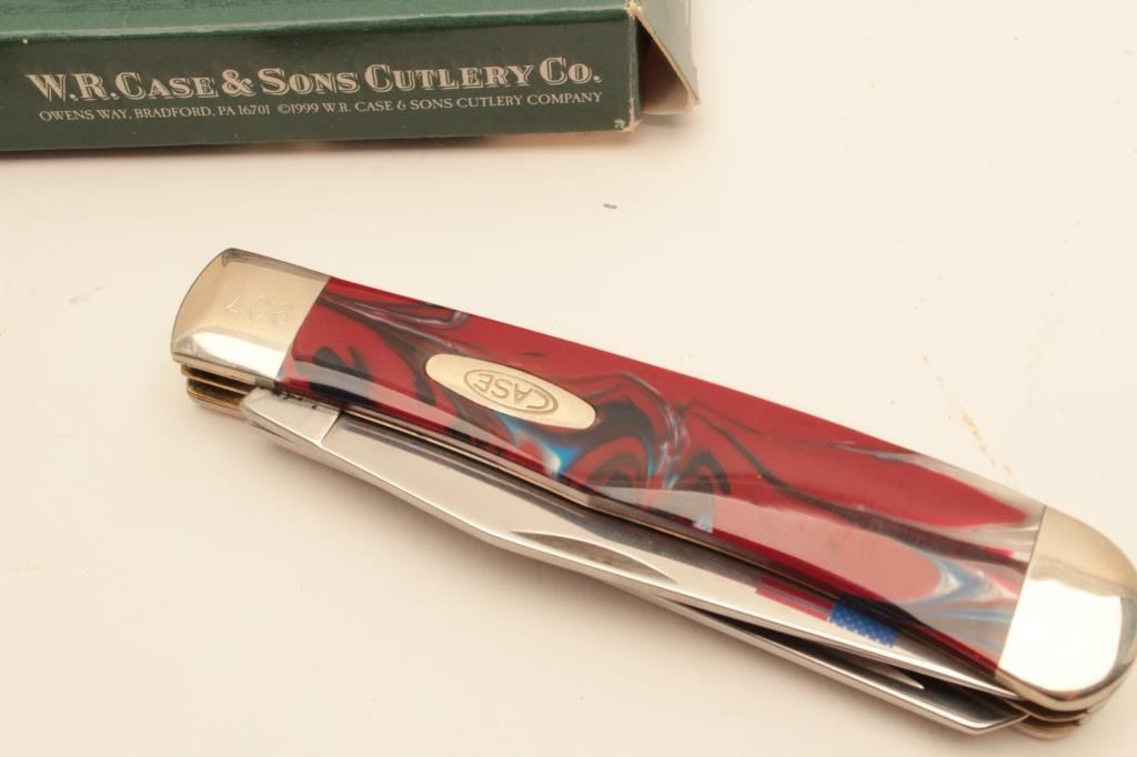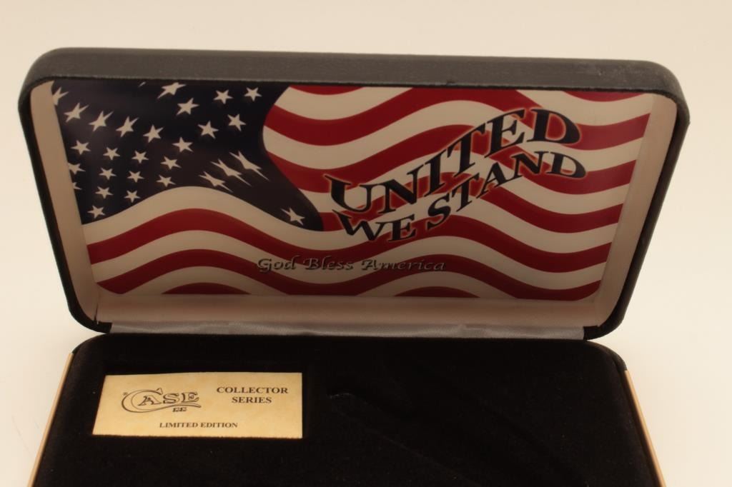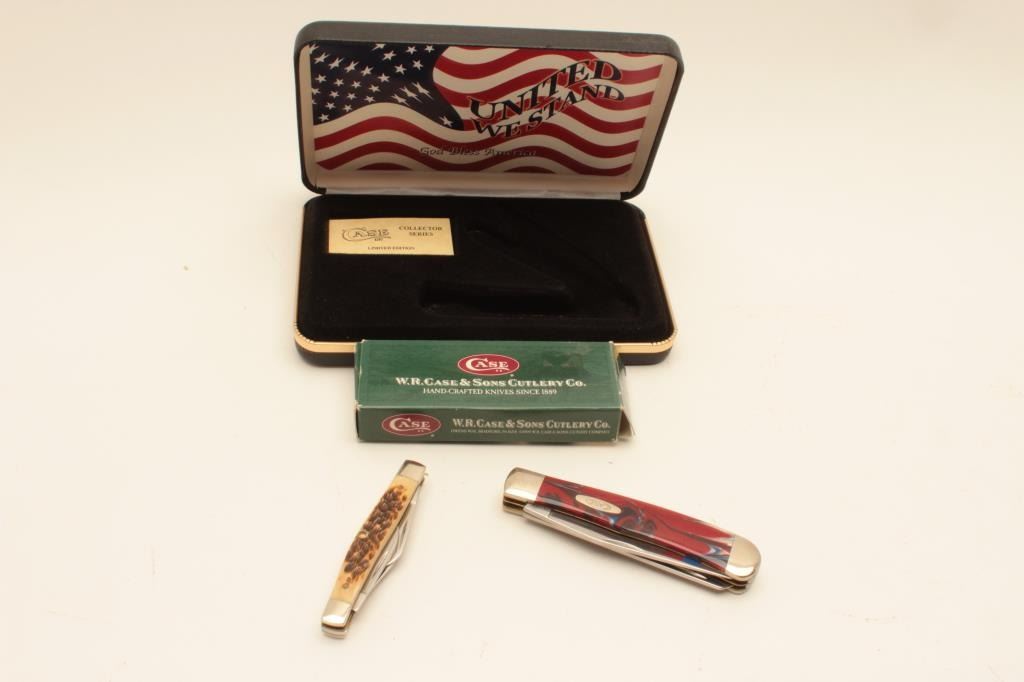 17AG-3 LOT OF 2 CASE KNIVESLot of two Case pocket knives. The first is a Stockman model with a 2 ½” blade and antiqued stag scales. The knife is new in the factory box with all associated materials. The second knife is a cased CaseCollector series, “Operation Noble Eagle”, four inches folded with two 3 ½” blades. The scales are patriotic themed red, white and blue and the knife is serial #967. The knife comes in the factory original case with thecertificate of authenticity. Est.: $100-$200.Lot of two Case pocket knives. The first is a Stockman model with a 2 ½” blade and antiqued stag scales. The knife is new in the factory box with all associated materials. The second knife is a cased CaseCollector series, “Operation Noble Eagle”, four inches folded with two 3 ½” blades. The scales are patriotic themed red, white and blue and the knife is serial #967. The knife comes in the factory original case with thecertificate of authenticity. Est.: $100-$200.