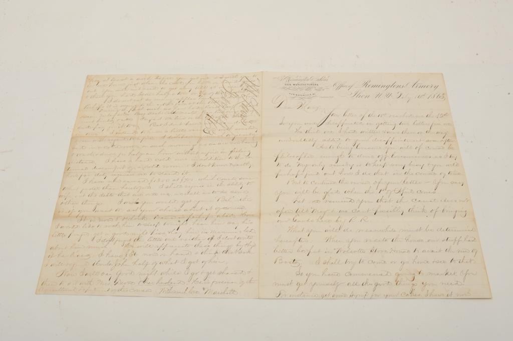 18BD-10 REMINGTON LETTER DATED 1863Remington Arms Co. letter dated Feb 14th, 1863 on Remington & Sons, gun manufactures stationary addressed Mary from Marshall with 2 hand written pages of personal commentary. The letter head is interesting advertisingU.S. rifles, revolvers, gun canes, rifle barrels, gun locks, gun materials, and etc. Good condition. Legible. 0Est.: $150-$300Remington Arms Co. letter dated Feb 14th, 1863 on Remington & Sons, gun manufactures stationary addressed Mary from Marshall with 2 hand written pages of personal commentary. The letter head is interesting advertisingU.S. rifles, revolvers, gun canes, rifle barrels, gun locks, gun materials, and etc. Good condition. Legible. 0Est.: $150-$300