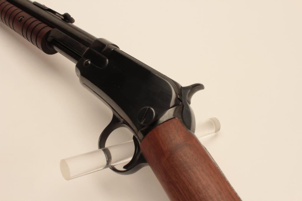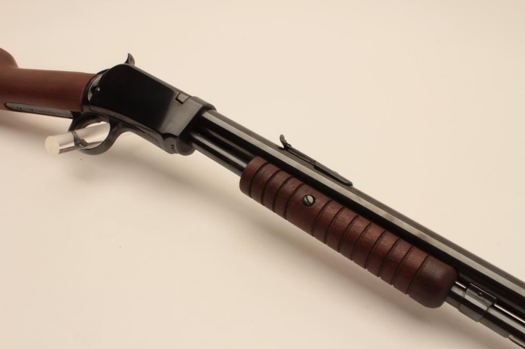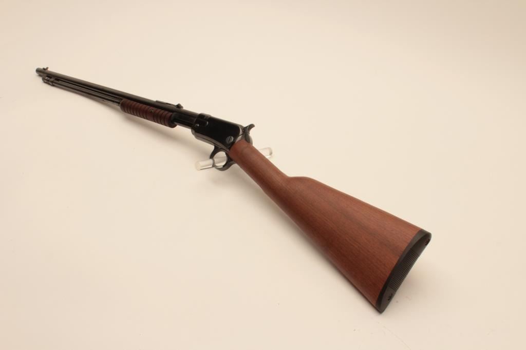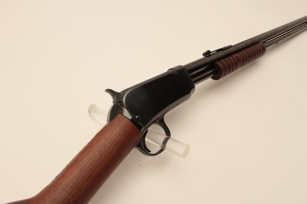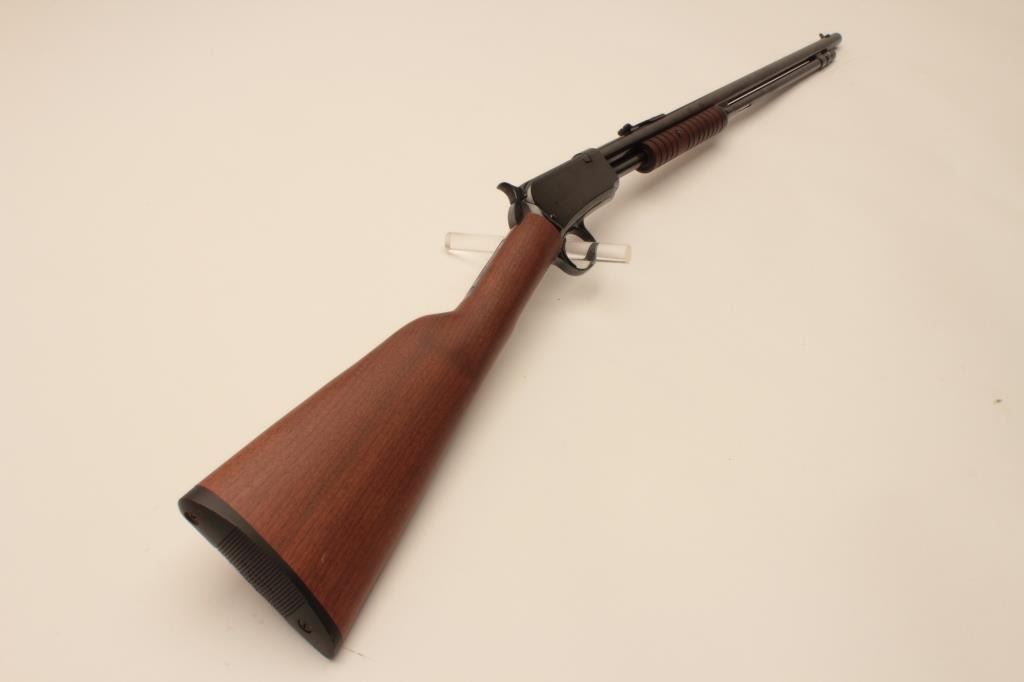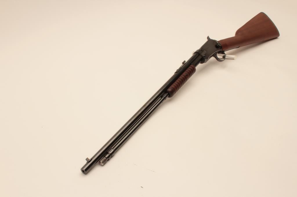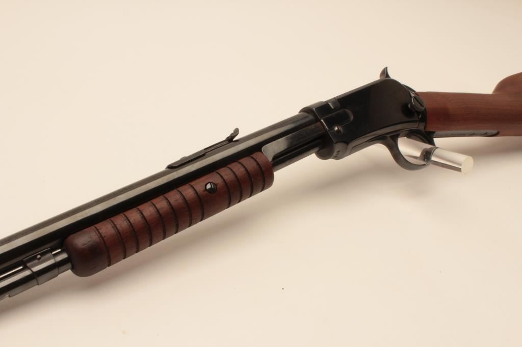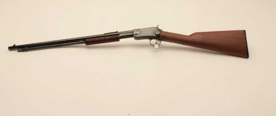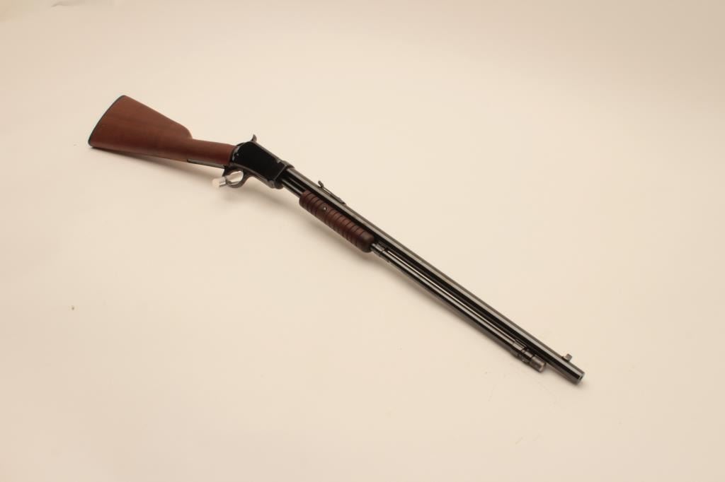 17LB-11 WINCHESTER MDL 06 #746984Winchester Model 06 pump action rifle, .22 short, long or LR caliber, blued finish, wood stocks, S/N 746984, in overall good + condition as restored showing the majority of a quality re-blue, good + bore, crispaction, good markings and very good wood with butt stock appearing to be a replacement. (C&R/no PPT). Est.: $175-$350.Winchester Model 06 pump action rifle, .22 short, long or LR caliber, blued finish, wood stocks, S/N 746984, in overall good + condition as restored showing the majority of a quality re-blue, good + bore, crispaction, good markings and very good wood with butt stock appearing to be a replacement. (C&R/no PPT). Est.: $175-$350.
