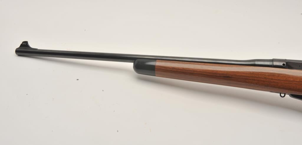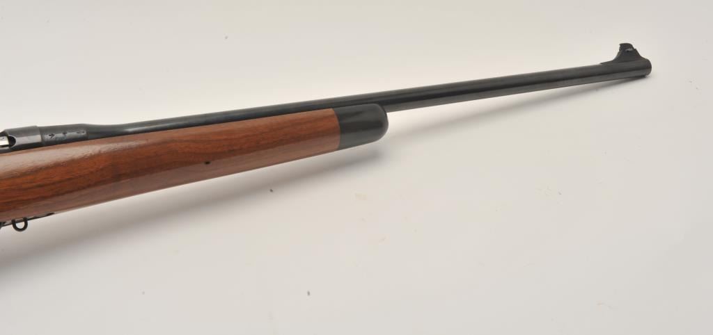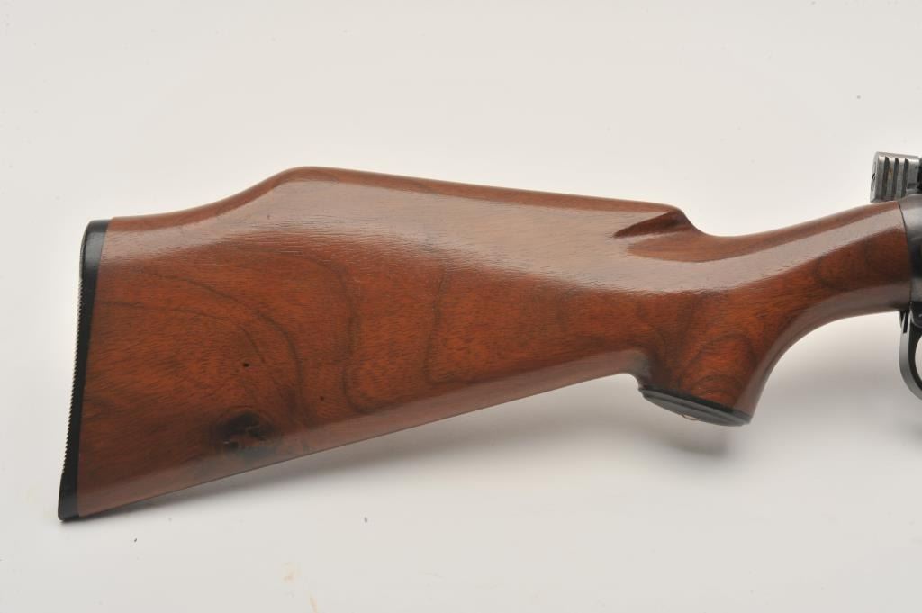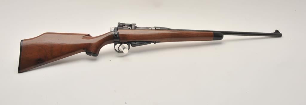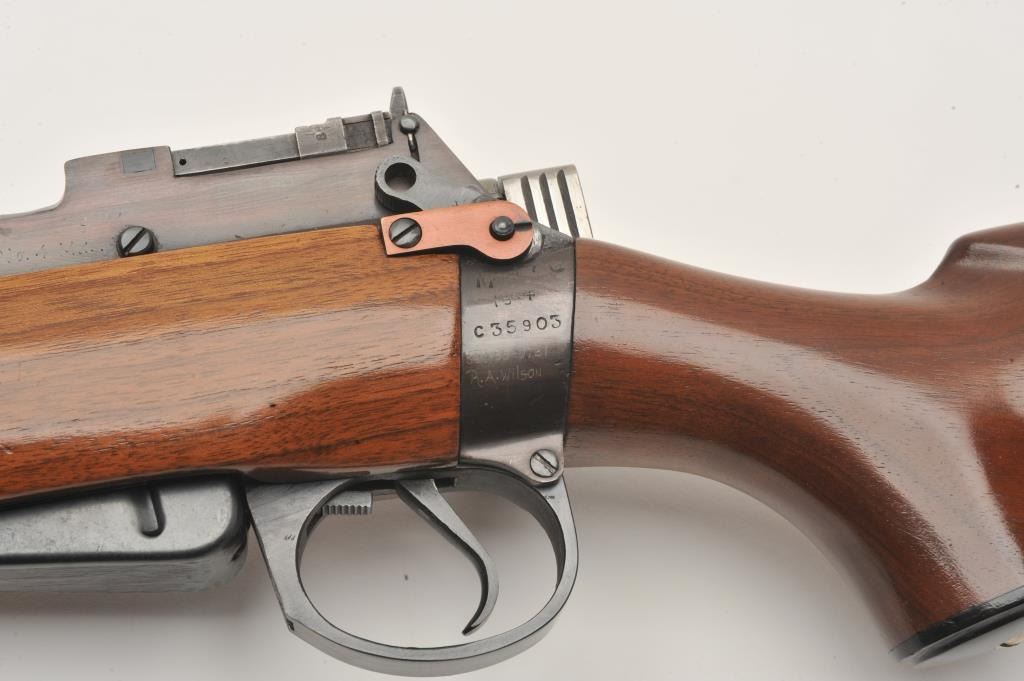 17LR-1 SPORTERIZED ENFIELD NO 4 MK 1#C35903Sporterized Lee-Enfield No. IV Mk. I bolt action rifle, .303 British caliber, Serial #C35903. The rifle is in very good overall condition with a 22” barrel with a ramped blade front sight and rear sight removed.The barrel and receiver retain the majority of an old, quality re-blue with British proofs and the military peep sight at the rear has been retained. The Fajen sporter stock is in very good condition with an ebony fore end and stylized cheek piece. The butt ends with a plastic, Fajen marked butt plate. The frame strap on the left side of the tang is dated, 1944 and marked, “R.A. Wilson”. The bore is good, the action crispand markings are sharp. $250-$500. (C+R).Sporterized Lee-Enfield No. IV Mk. I bolt action rifle, .303 British caliber, Serial #C35903. The rifle is in very good overall condition with a 22” barrel with a ramped blade front sight and rear sight removed.The barrel and receiver retain the majority of an old, quality re-blue with British proofs and the military peep sight at the rear has been retained. The Fajen sporter stock is in very good condition with an ebony fore end and stylized cheek piece. The butt ends with a plastic, Fajen marked butt plate. The frame strap on the left side of the tang is dated, 1944 and marked, “R.A. Wilson”. The bore is good, the action crispand markings are sharp. $250-$500. (C+R).