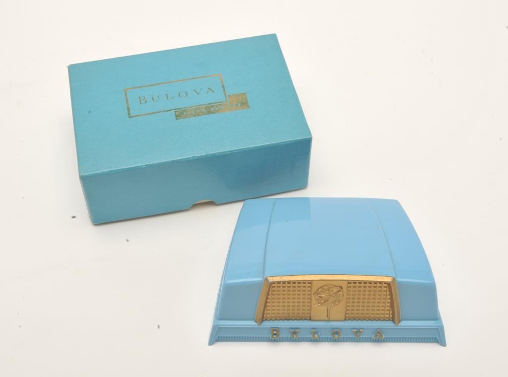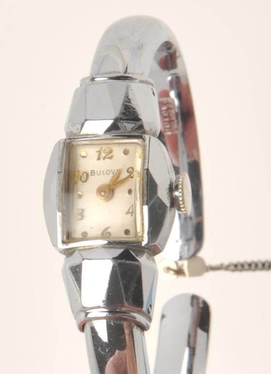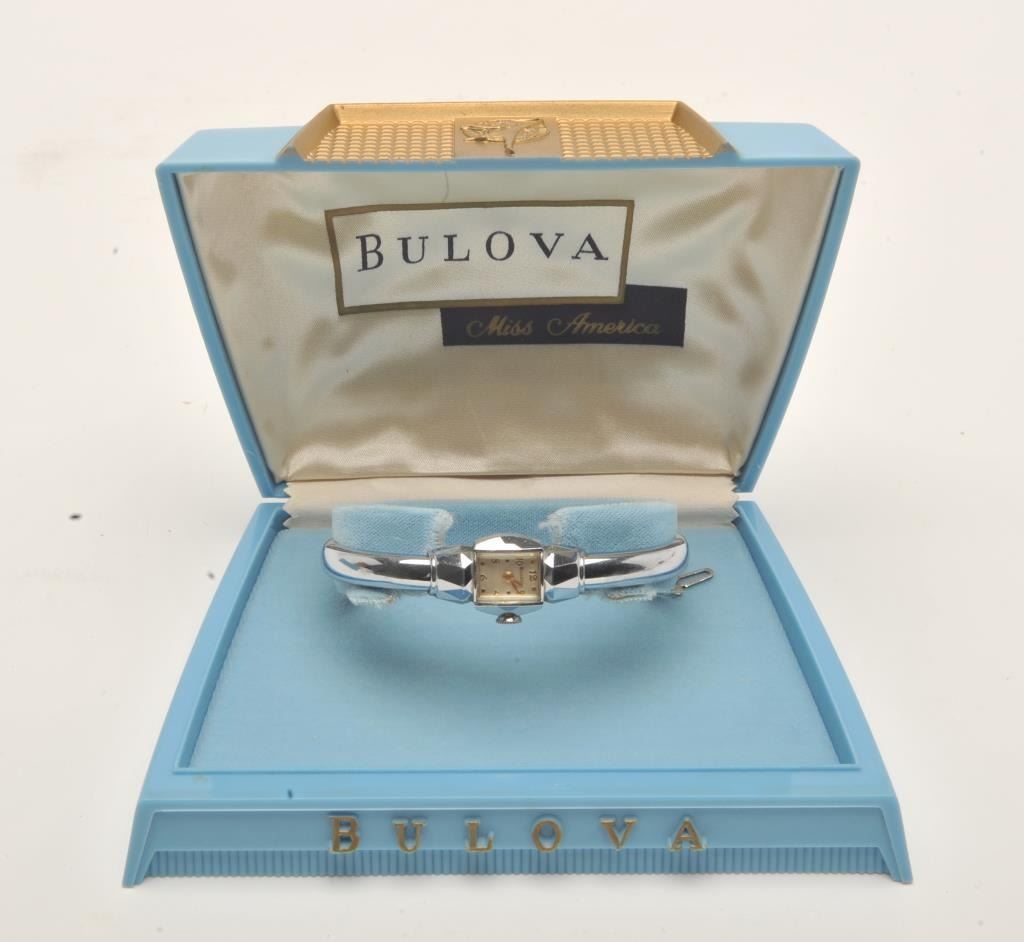 17FU-11 LADIES BULAVA "DECO" WATCHVintage ladies “Miss America” wrist watch by Bulova in factory plastic display case and with factory two-piece cardboard box. Not running at time of description but appears near new in condition. Est.: $75-$150.Vintage ladies “Miss America” wrist watch by Bulova in factory plastic display case and with factory two-piece cardboard box. Not running at time of description but appears near new in condition. Est.: $75-$150.
