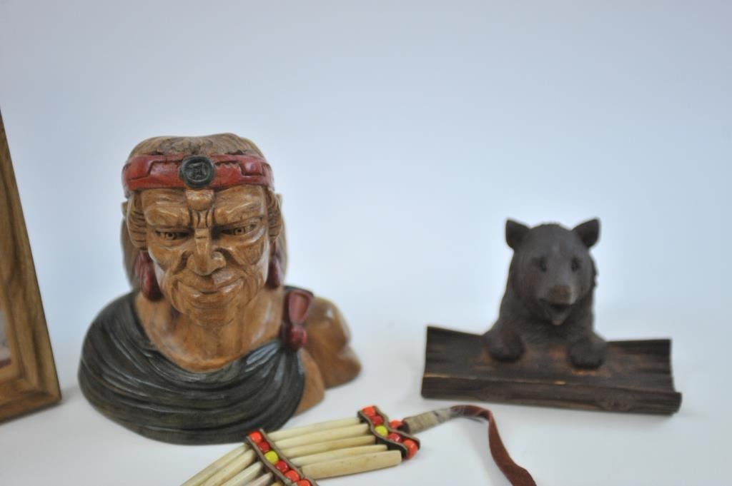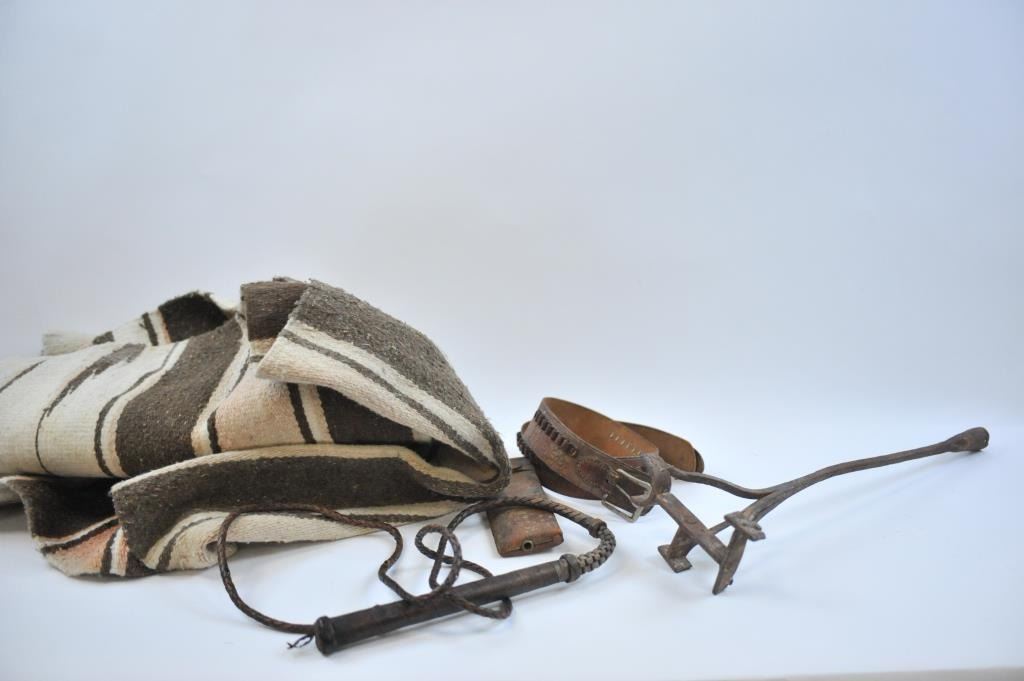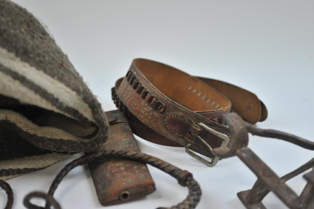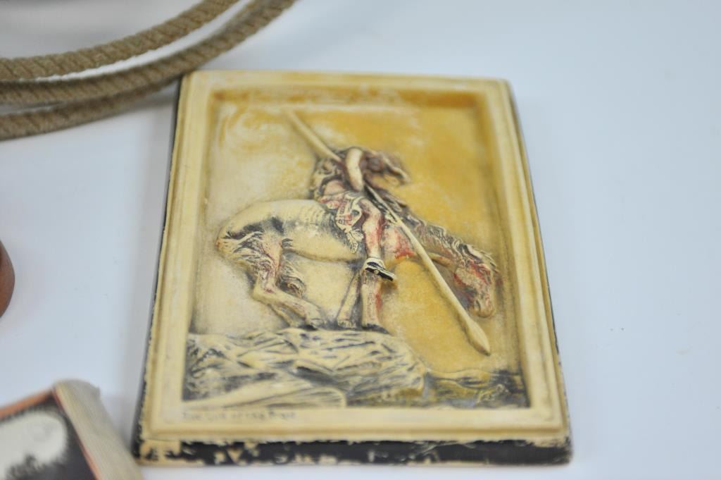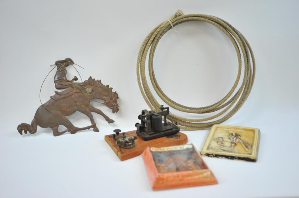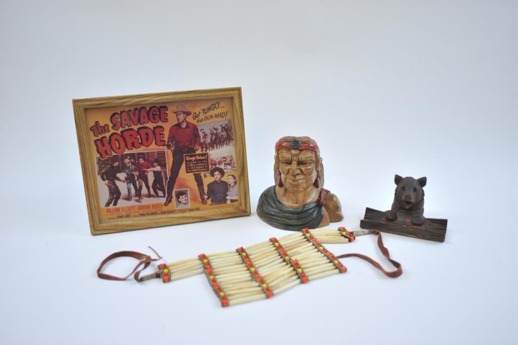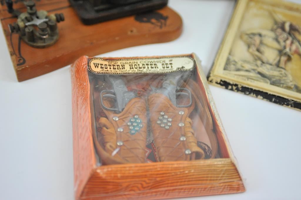 17LW-14 WESTERN THEME LOTWestern Theme lot, Door knocker, metal plaque of Roper, Whip of branded leather, Navajo saddle blanket, lobby card for Wild Bill Elliot, Bear ink well 1900-1920, carved wood-California, carved bust of Aztec 1940's, Telegraph key and register on Western Plaque, ammo belt, pipe bone dance breastplate 1940's, End of Trail Plaque (50's), Wester holster set w/toy guns never unwrapped. Est:$100-200Western Theme lot, Door knocker, metal plaque of Roper, Whip of branded leather, Navajo saddle blanket, lobby card for Wild Bill Elliot, Bear ink well 1900-1920, carved wood-California, carved bust of Aztec 1940's, Telegraph key and register on Western Plaque, ammo belt, pipe bone dance breastplate 1940's, End of Trail Plaque (50's), Wester holster set w/toy guns never unwrapped. Est:$100-200