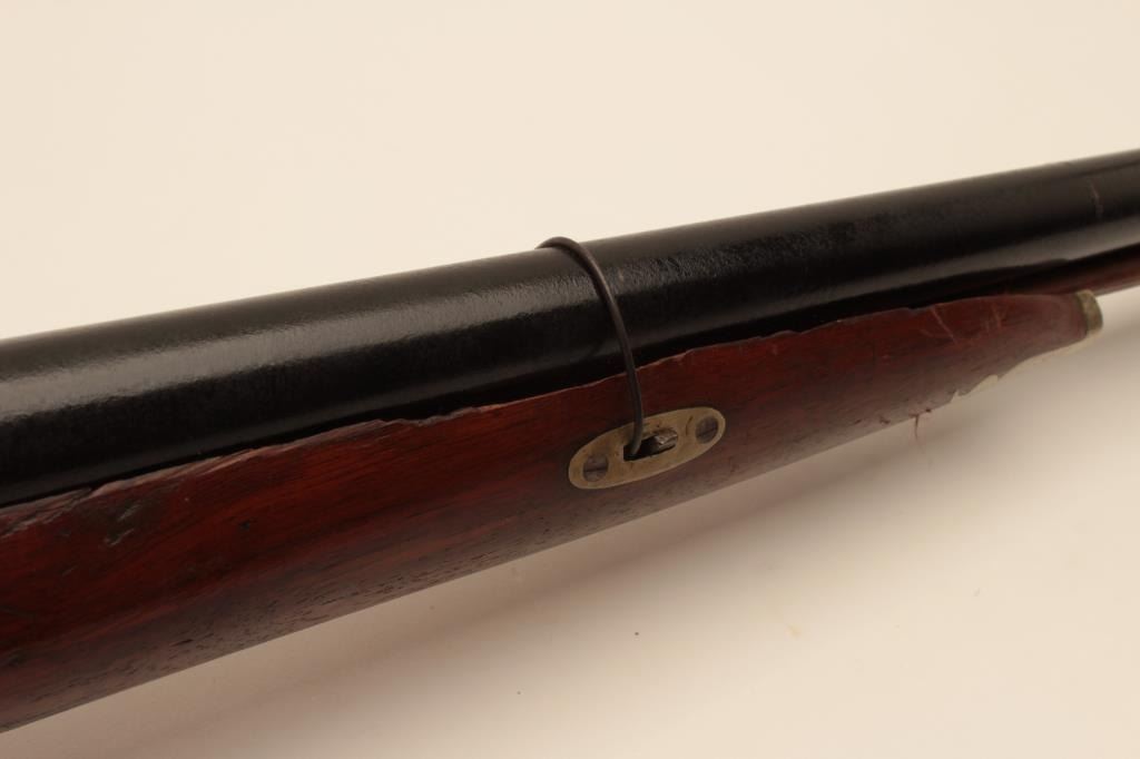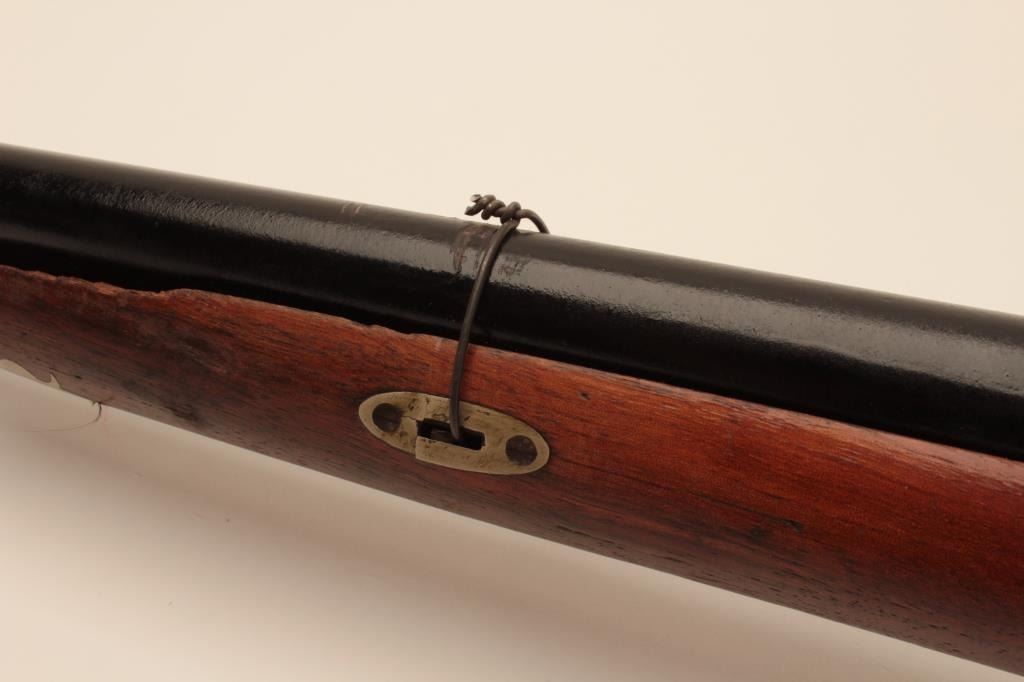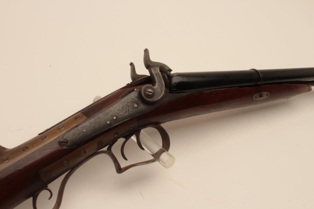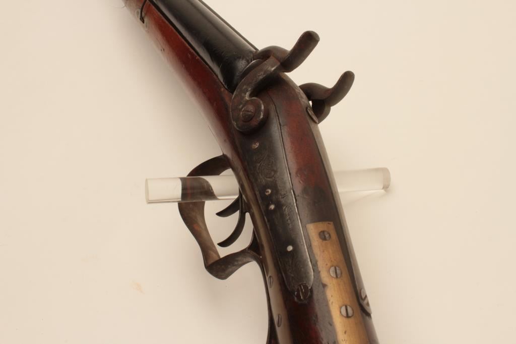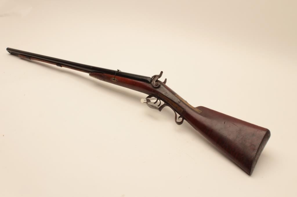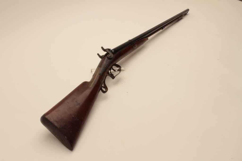 17MJ-8 DOUBLE PERCUSSION RELICSxS percussion shotgun with back action locks, working actions, black painted barrels, brass repairs to wrist area of wood half stock that is also missing its front retaining key; a relic condition wall hangeror decorator. (Antique). Est.: $75-$150.SxS percussion shotgun with back action locks, working actions, black painted barrels, brass repairs to wrist area of wood half stock that is also missing its front retaining key; a relic condition wall hangeror decorator. (Antique). Est.: $75-$150.
