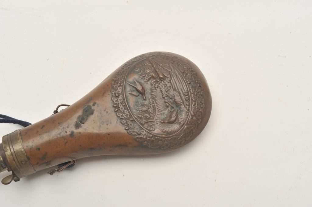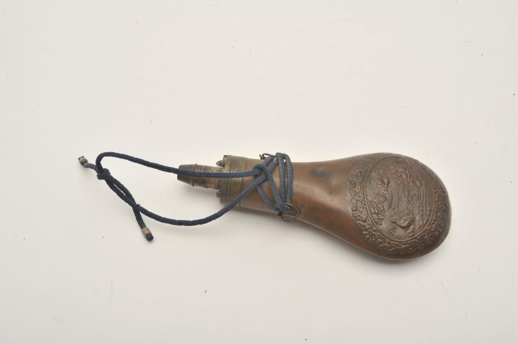 Lot 1375d 18AP-59 SHOTGUN FLASKBrass shotgun flask with game bird scenes; fair only condition. Est.: $3
