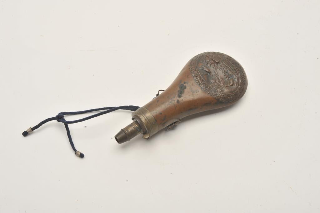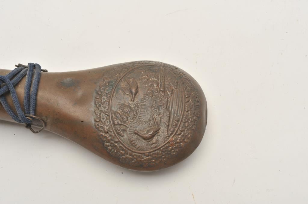 18AP-59 SHOTGUN FLASKBrass shotgun flask with game bird scenes; fair only condition. Est.: $35-$70.Brass shotgun flask with game bird scenes; fair only condition. Est.: $35-$70.