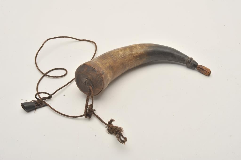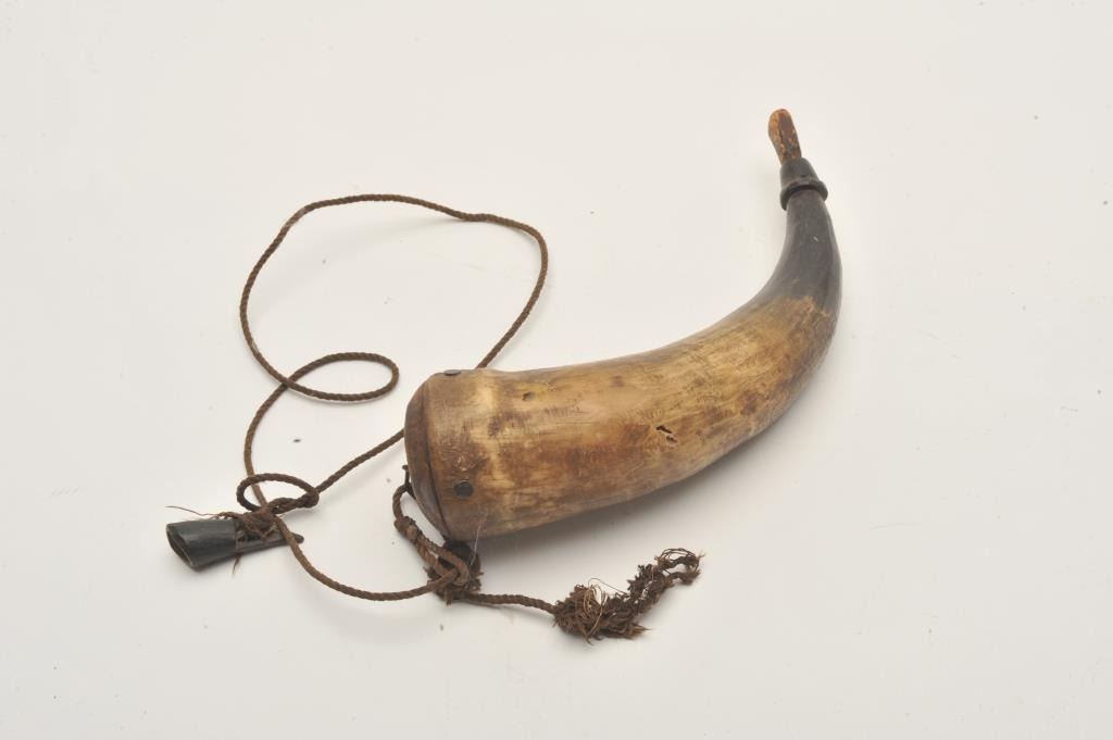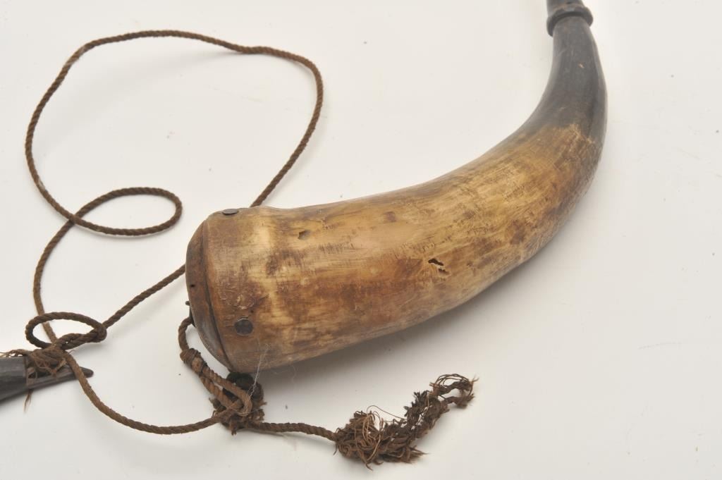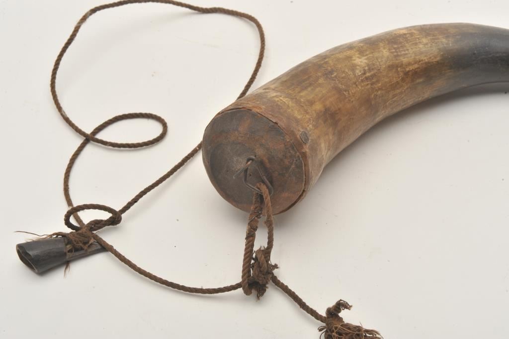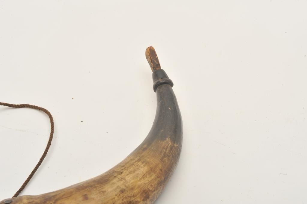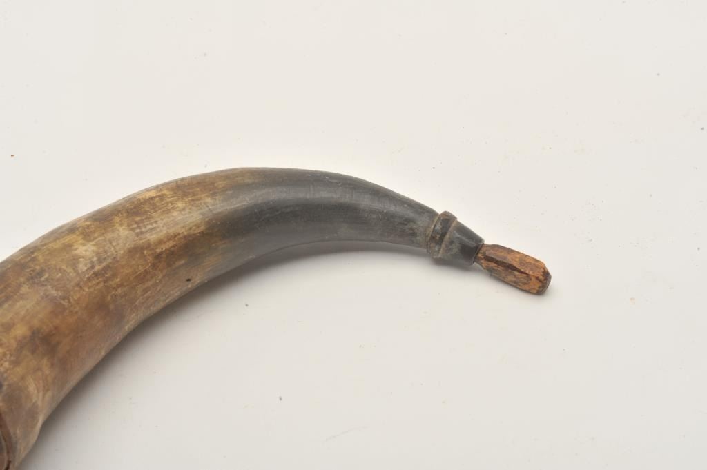 18AP-57 KENTUCKY HORNPeriod Kentucky rifle type powder horn with wood base and cap/attached primer horn; approximately 11” overall. Est.: $50-$100.Period Kentucky rifle type powder horn with wood base and cap/attached primer horn; approximately 11” overall. Est.: $50-$100.