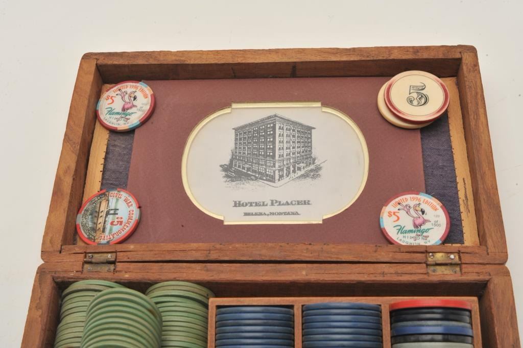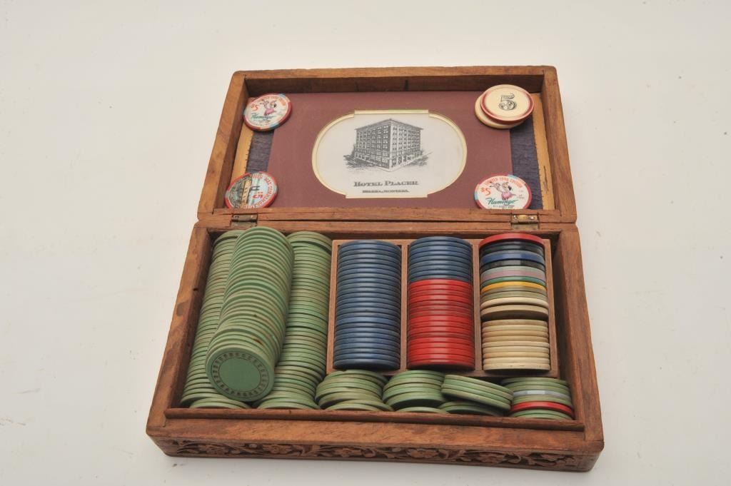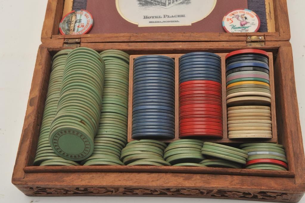 Lot 1375g 18AP-82 POKER CHIPSLot of dozens of misc. older poker chips, some in carved wooden box; others in b