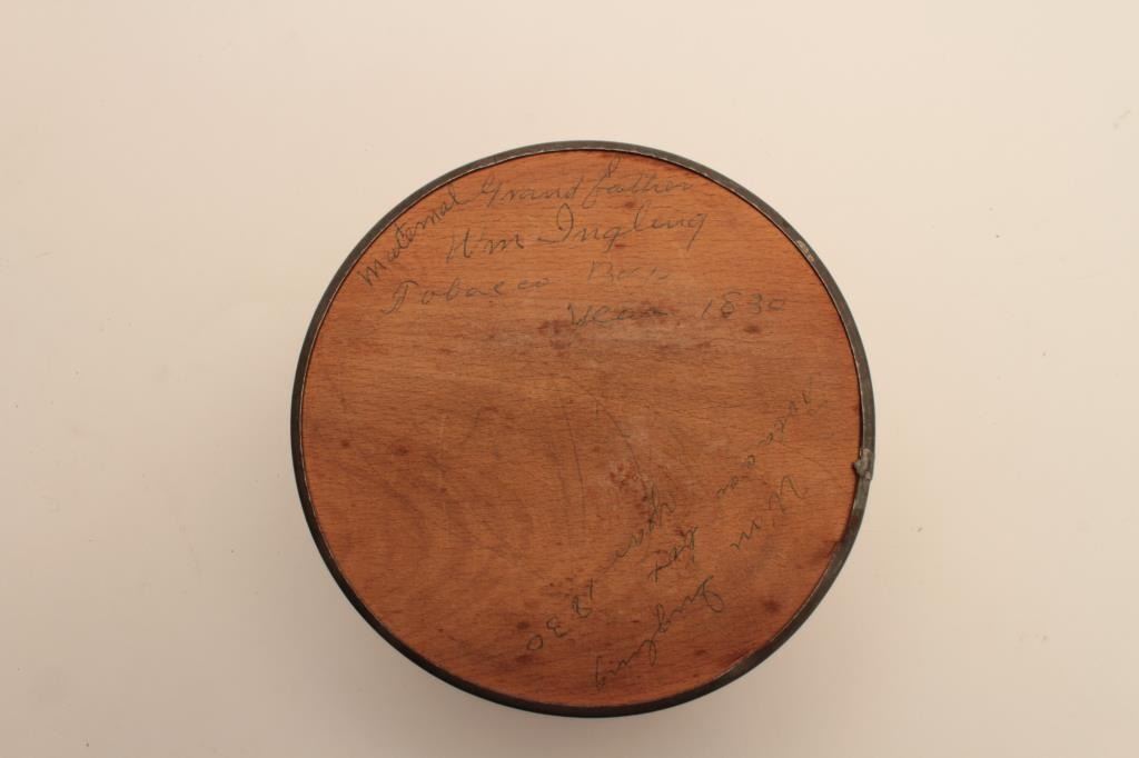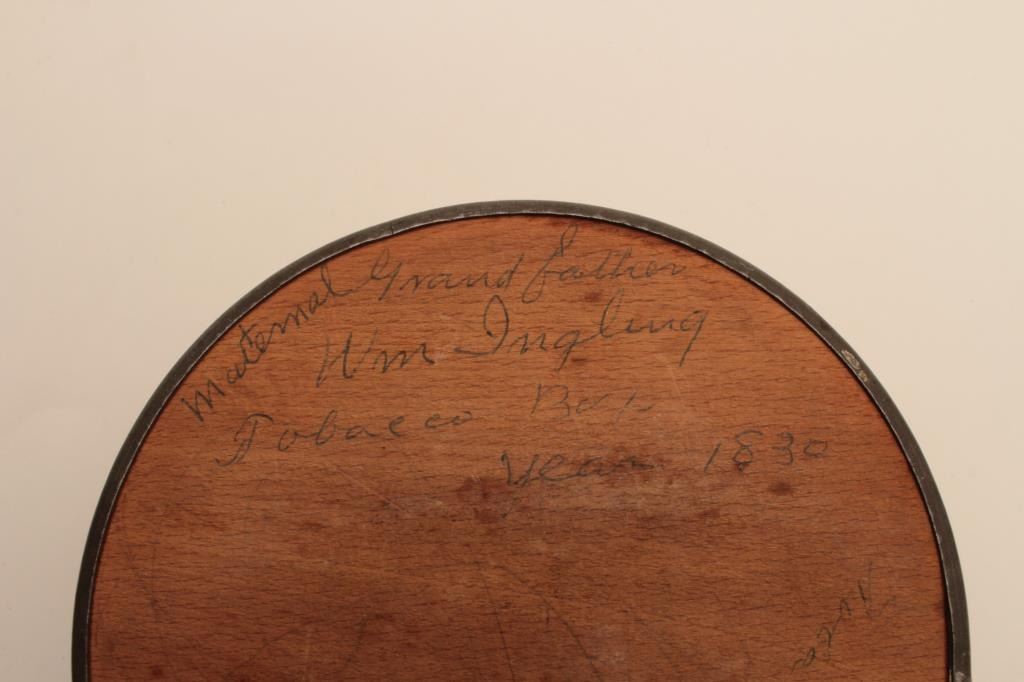 18AL-16 TOBACCO BOXOld wood and tin tobacco box, belonging to William Ingling, ca. 1830, with penciled history on bottom; originally from a local family who headed West in the 1880’s and changed their name to Engle and Americanizedtheir name. Est.: $50-$100.Old wood and tin tobacco box, belonging to William Ingling, ca. 1830, with penciled history on bottom; originally from a local family who headed West in the 1880’s and changed their name to Engle and Americanizedtheir name. Est.: $50-$100.