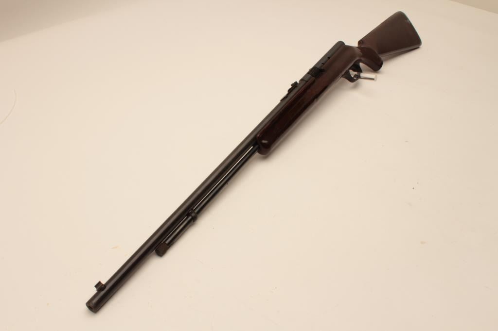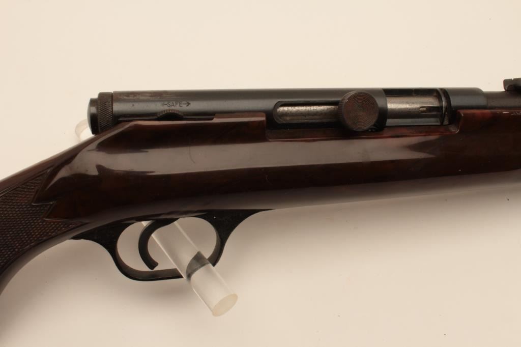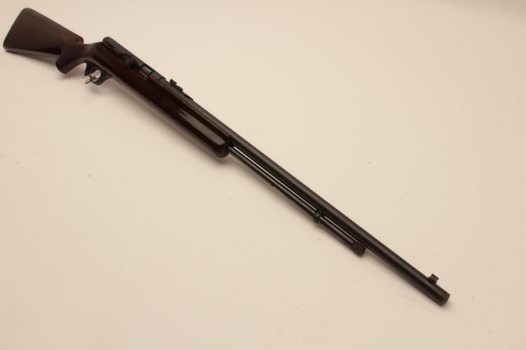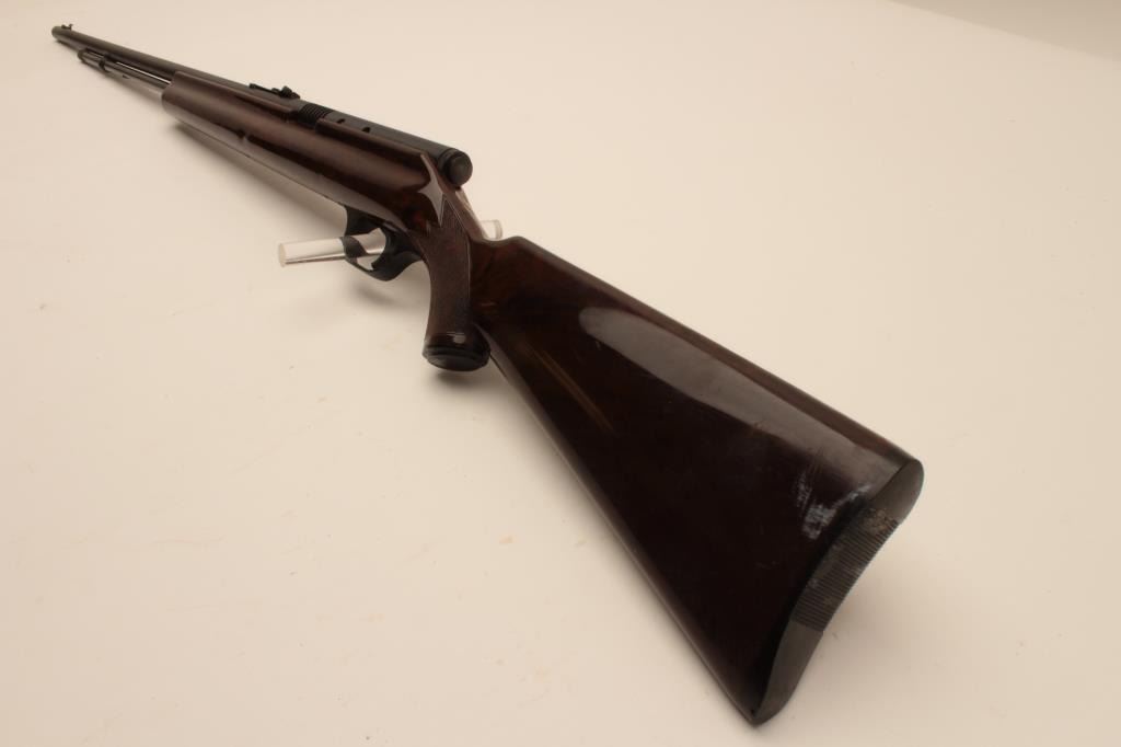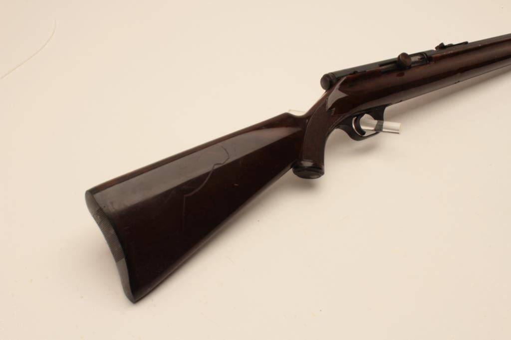 18AL-38 .22 AUTO STEVENSStevens Model 87A semi-automatic rifle, .22 short, long or LR caliber, blued finish, checkered brown plastic stock, no visible S/N, overall good condition with considerable original blued finish, crisp action, goodmarkings, bore should may clean to good, good stock. (Modern/PPT). Est.: $75-$150.Stevens Model 87A semi-automatic rifle, .22 short, long or LR caliber, blued finish, checkered brown plastic stock, no visible S/N, overall good condition with considerable original blued finish, crisp action, goodmarkings, bore should may clean to good, good stock. (Modern/PPT). Est.: $75-$150.