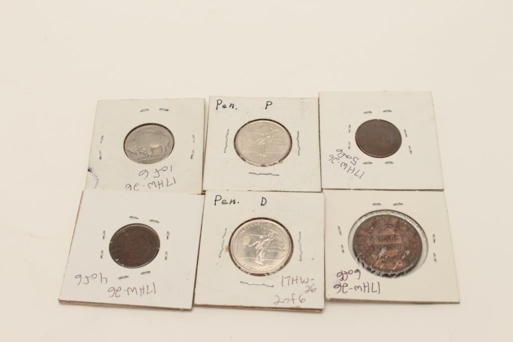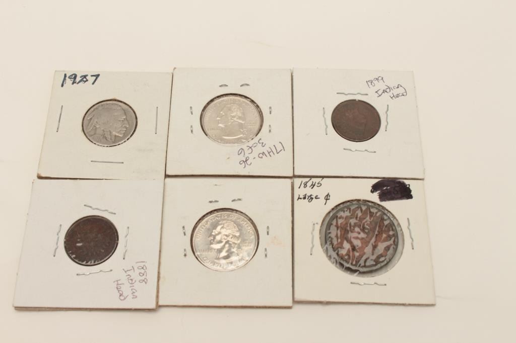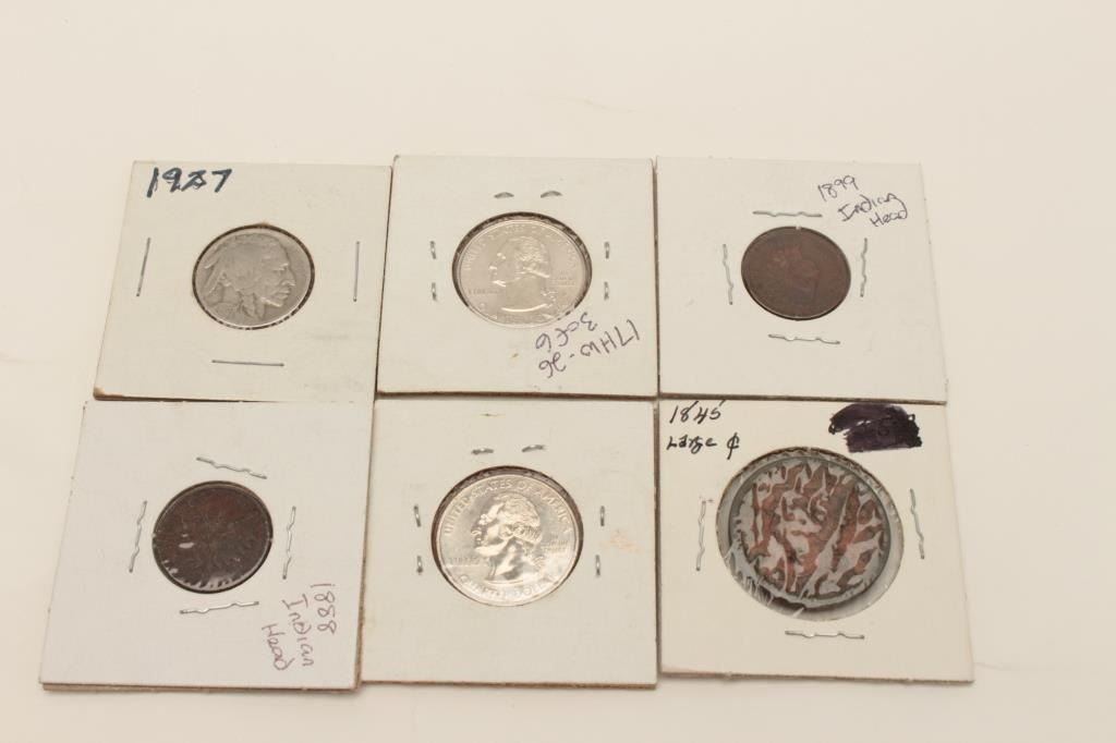 17HW-26 COIN LOTLot of collector’s coins as described: 1845 large cent, 1899 1 cent, 1888 1 cent, 2 1999 commemorative quarters, and 1 1927 buffalo nickel. Old collector’s horde. Est.: $50-$150Lot of collector’s coins as described: 1845 large cent, 1899 1 cent, 1888 1 cent, 2 1999 commemorative quarters, and 1 1927 buffalo nickel. Old collector’s horde. Est.: $50-$150