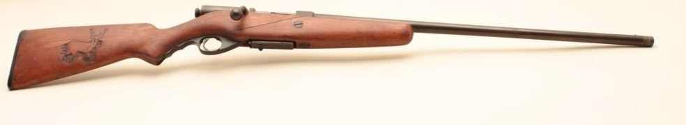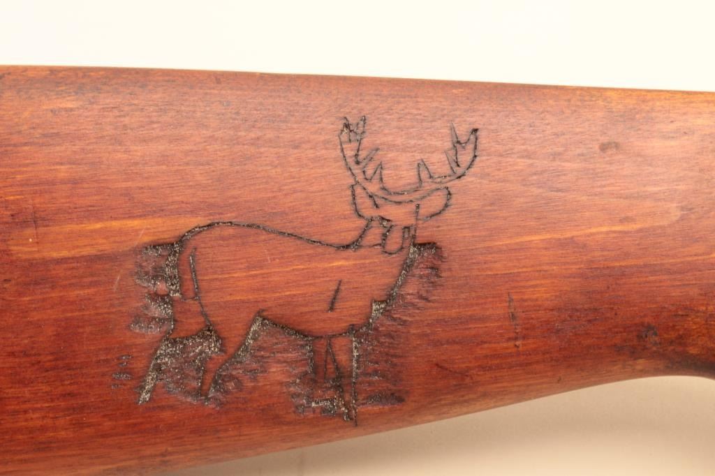 17JR-232 BOLT ACTION SHOTGUNWards bolt action shotgun, 16 gauge, Serial NSNV. The shotgun is in fair overall condition with 24” barrel. The barrel and receiver have taken on a brown patina with scattered surface rust and erosion. Thesmooth wood buttstock is in fair condition with hand carved deer on the right side. The plastic butt plate provides a 13 ¼” LOP. The bore is fair, action functions and markings are barely legible. Est.: $20-$40. (C+R).Wards bolt action shotgun, 16 gauge, Serial NSNV. The shotgun is in fair overall condition with 24” barrel. The barrel and receiver have taken on a brown patina with scattered surface rust and erosion. Thesmooth wood buttstock is in fair condition with hand carved deer on the right side. The plastic butt plate provides a 13 ¼” LOP. The bore is fair, action functions and markings are barely legible. Est.: $20-$40. (C+R).