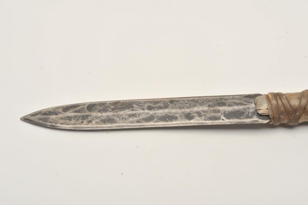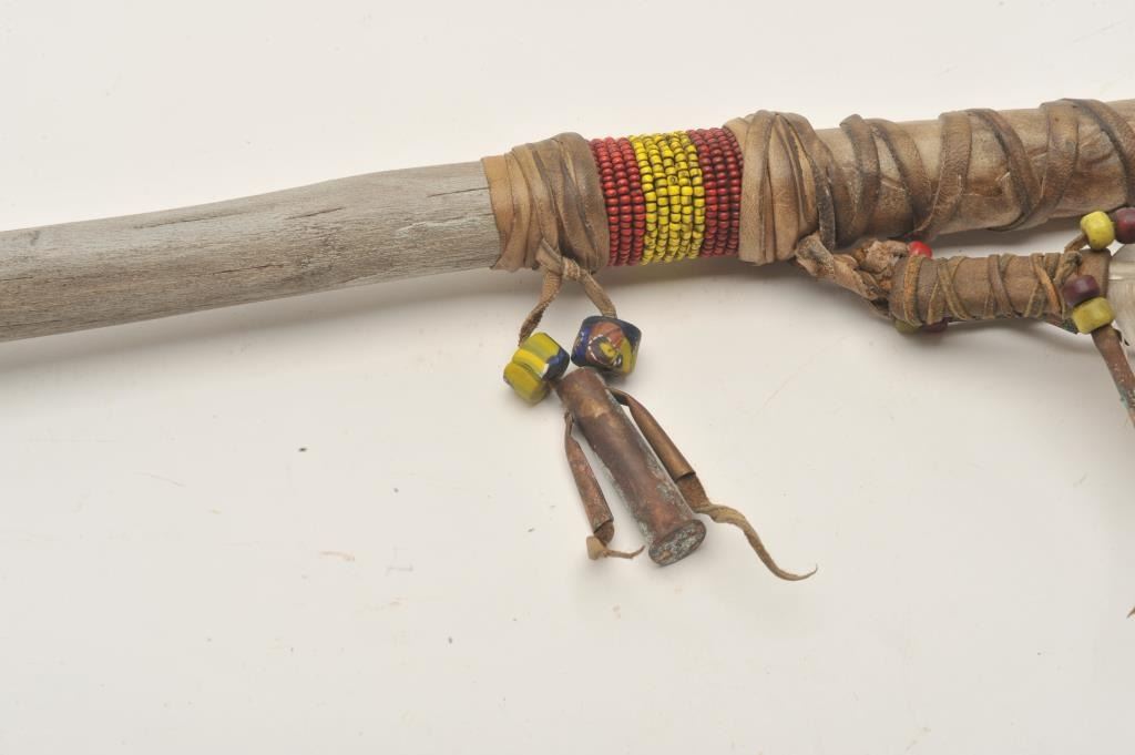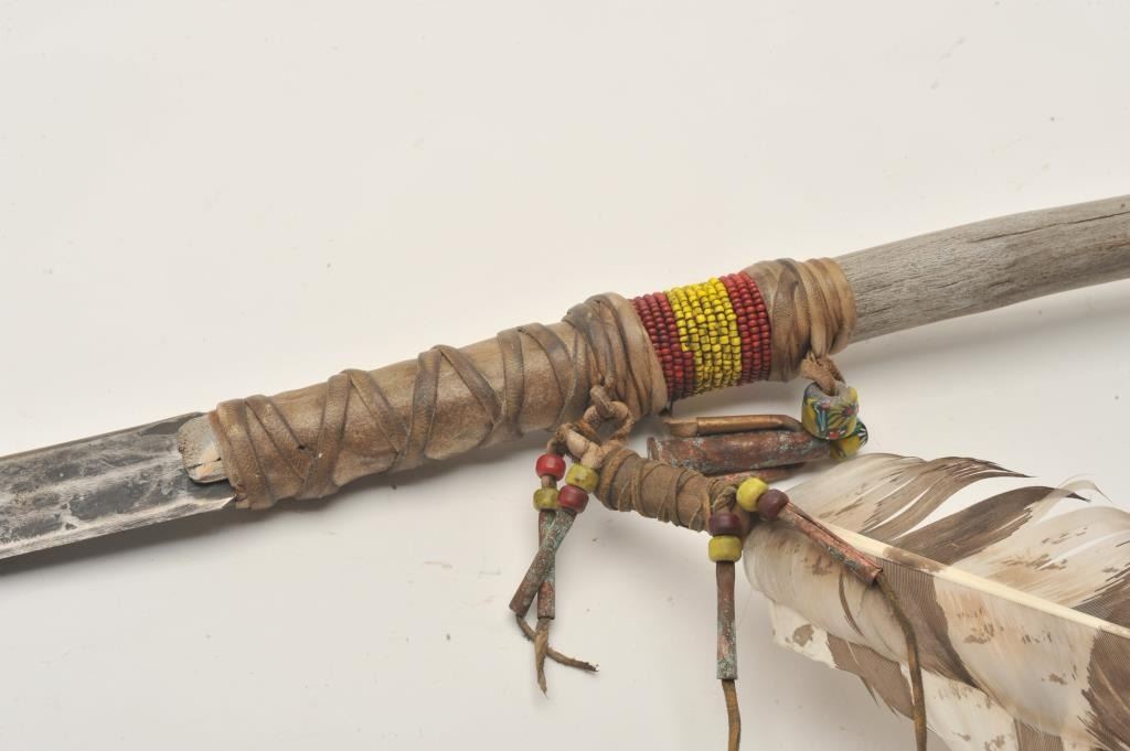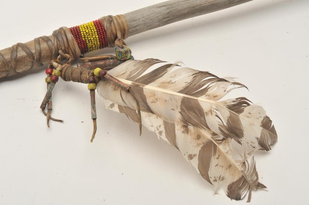 18AP-53 SPEARiron ceremonial Indian spear with wood shaft and beaded decoration, turkey feathers, beads, etc.; strip hide wrapped; approximately 31” overall. Est.: $50-$100.iron ceremonial Indian spear with wood shaft and beaded decoration, turkey feathers, beads, etc.; strip hide wrapped; approximately 31” overall. Est.: $50-$100.